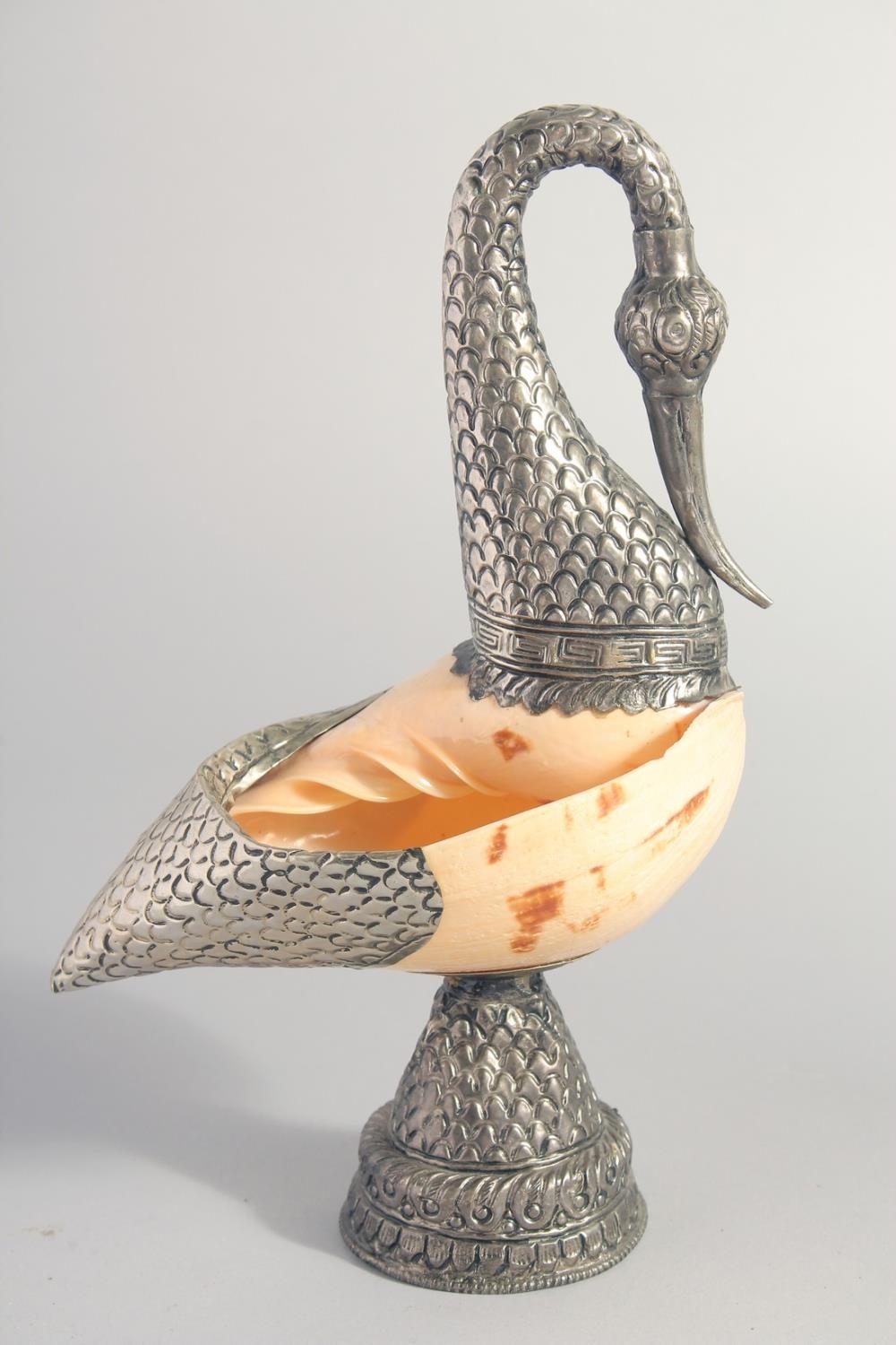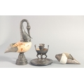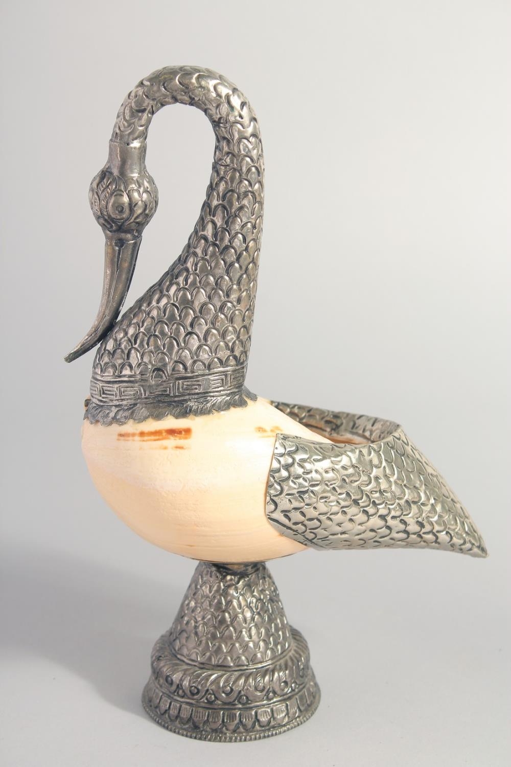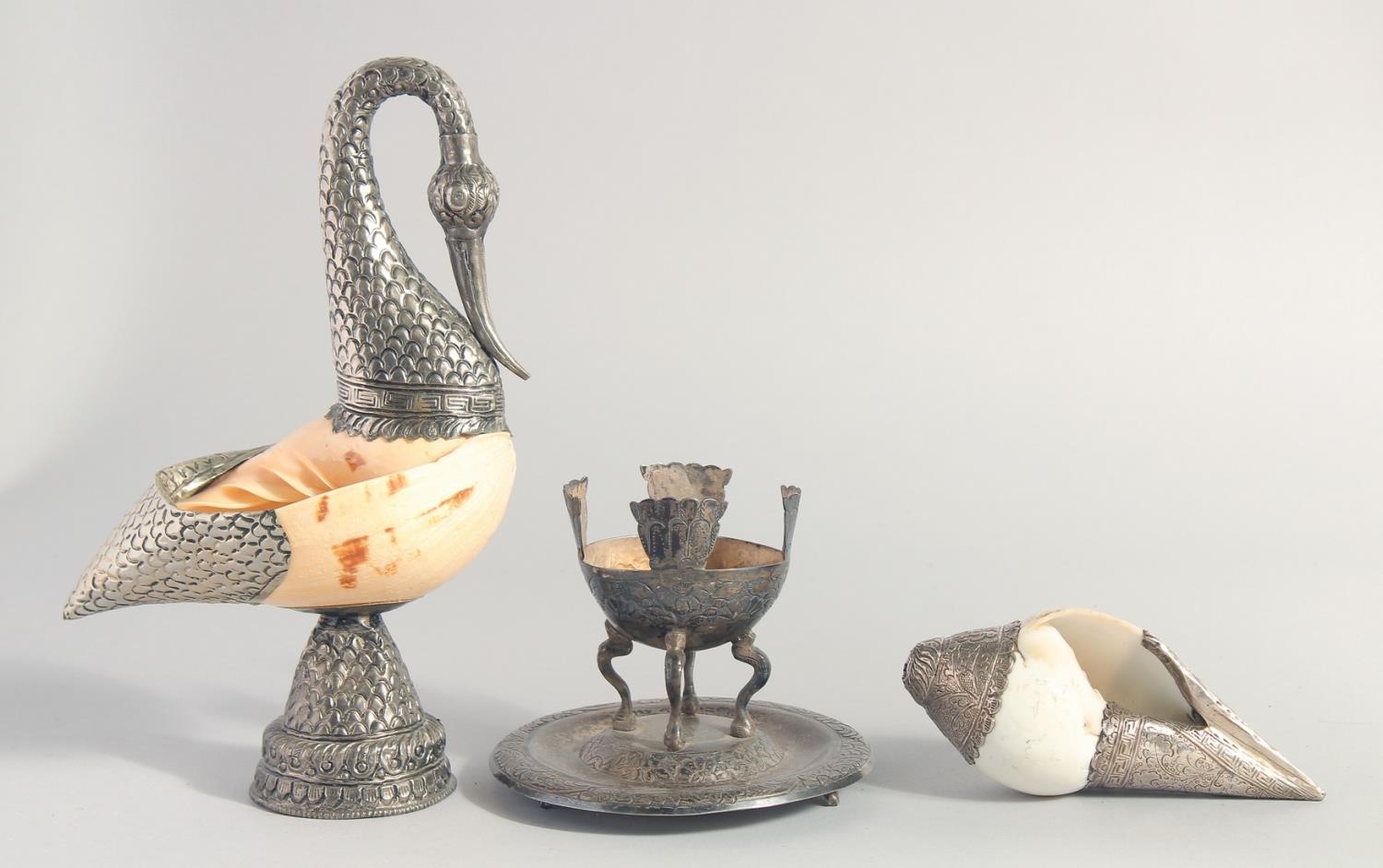 TWO METAL MOUNTED SHELLS, on formed as a swan, together with a metal stand, (3).