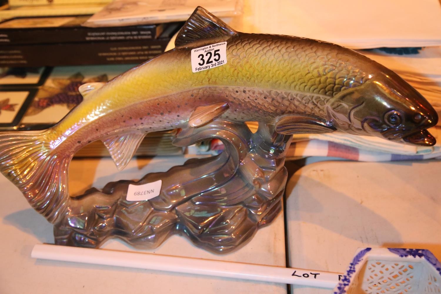 Large lustre glazed leaping salmon figurine. Not available for in-house P&P, contact Paul O'Hea at Mailboxes on 01925 659133