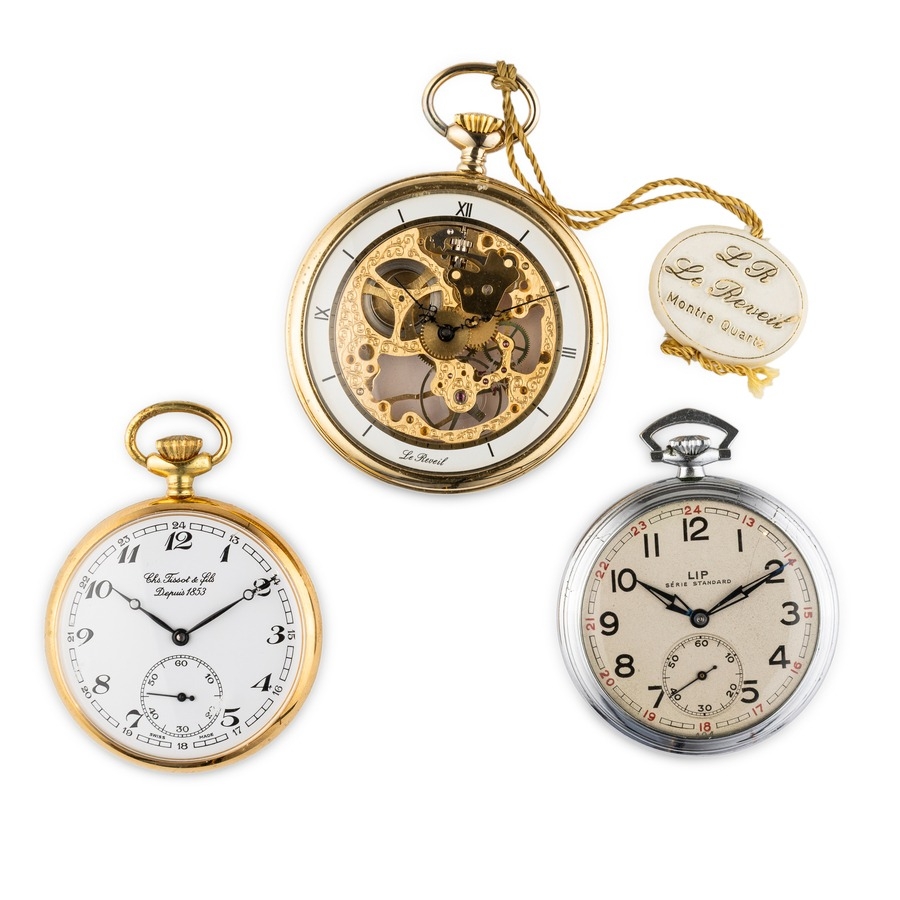 LIP, TISSOT, LE REVEIL, LOTTO DI TRE OROLOGI DA TASCA, 1940-1980 CIRCA