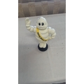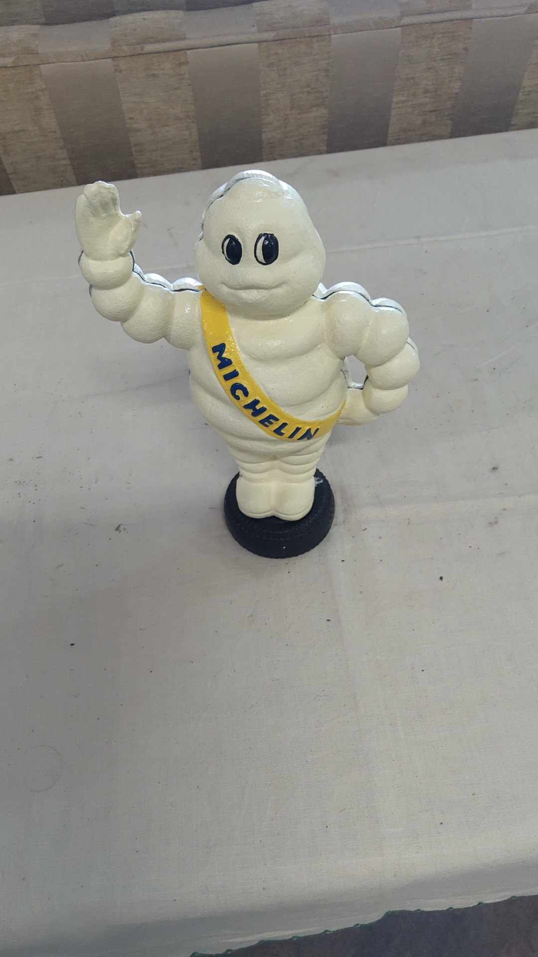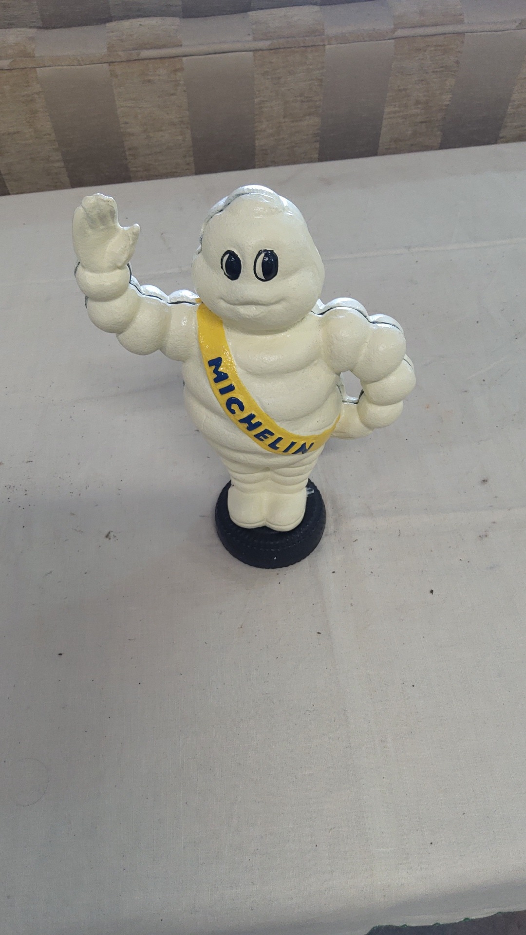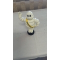 Cast metal figure of the Michelin Man (Bibendum), painted cream with yellow “MICHELIN” sash, raised in greeting, on a black tyre-form base, mid-late 20th century.