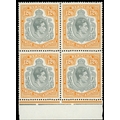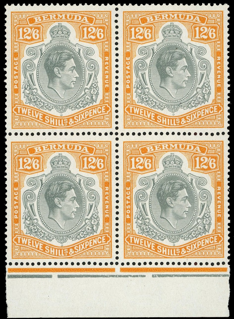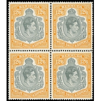 1948 (June) 12/6d grey and deep yellow-orange on chalky paper lower marginal block of four , #s 45-58.  Unmounted o.g., lower right stamp with a tiny natural inclusion.  SG 120b, £