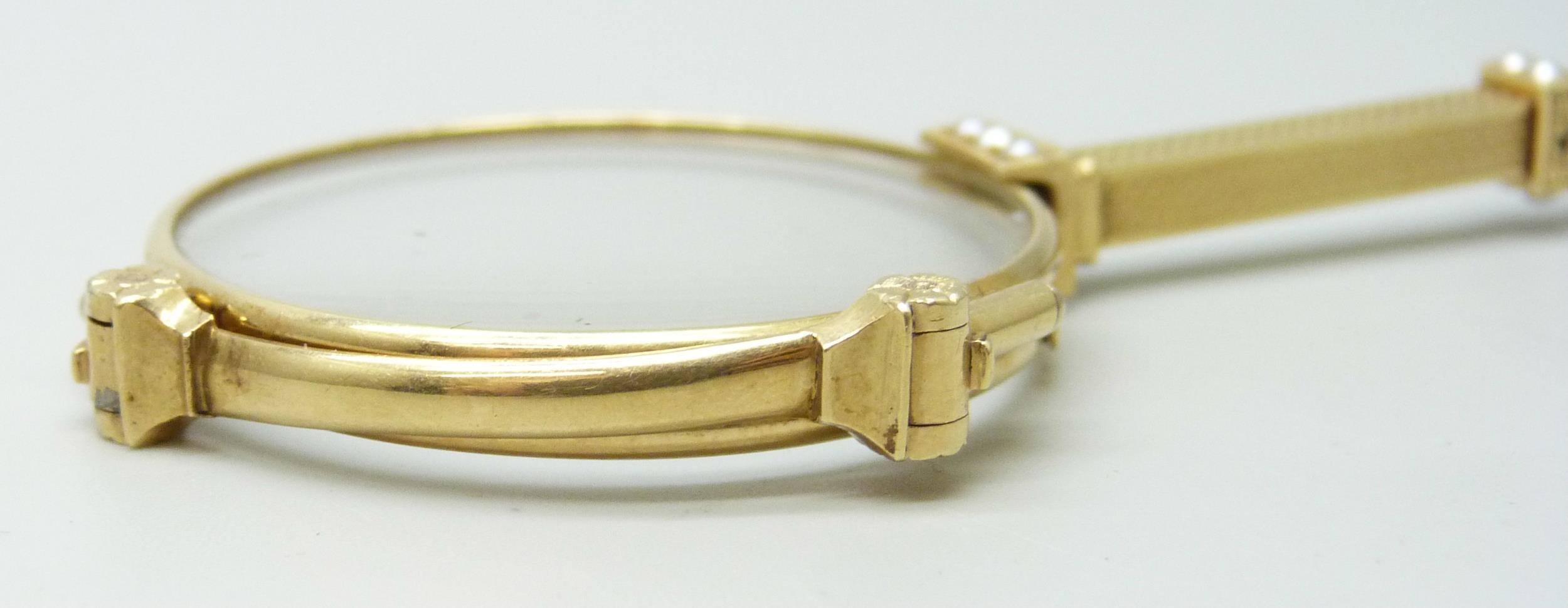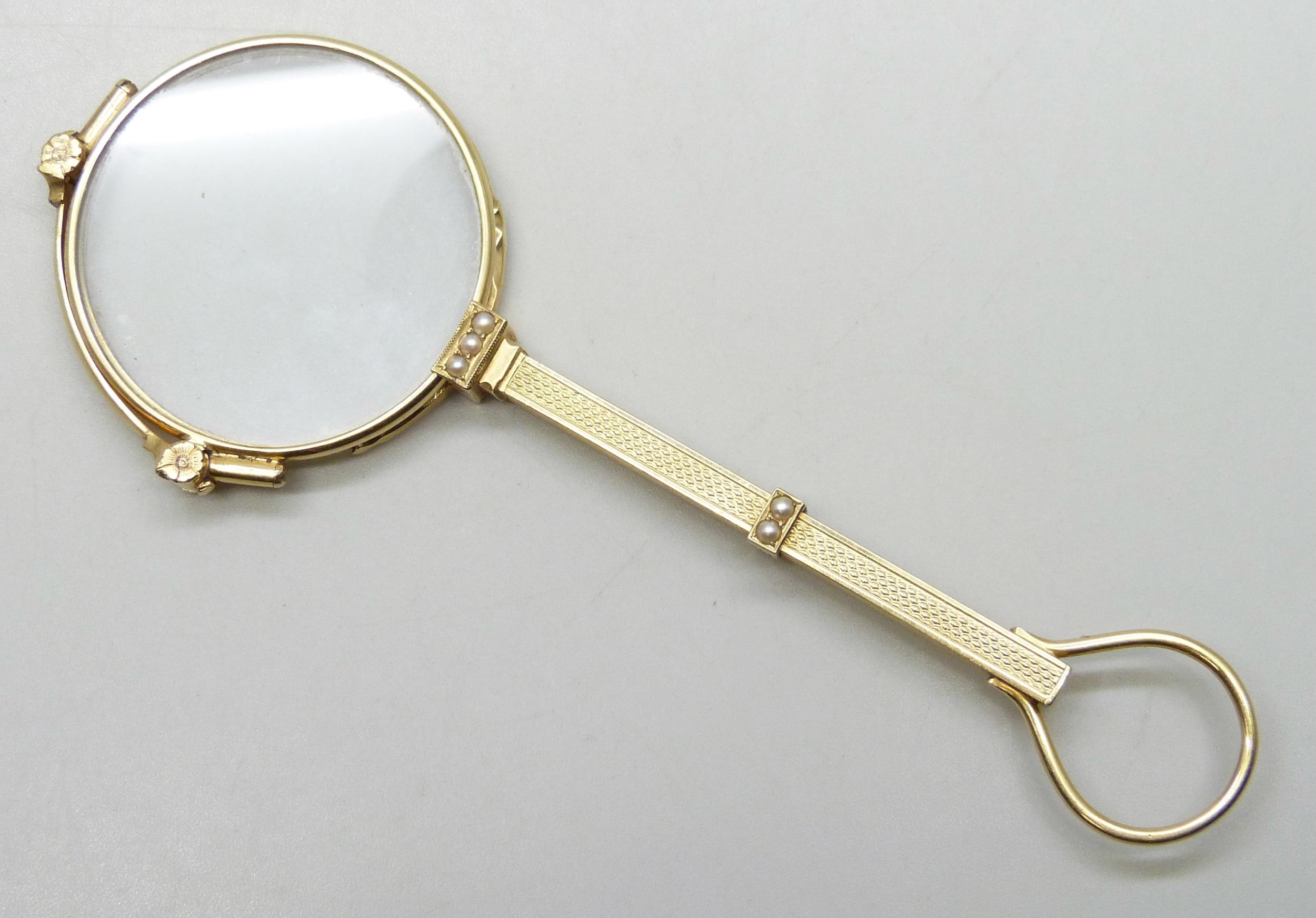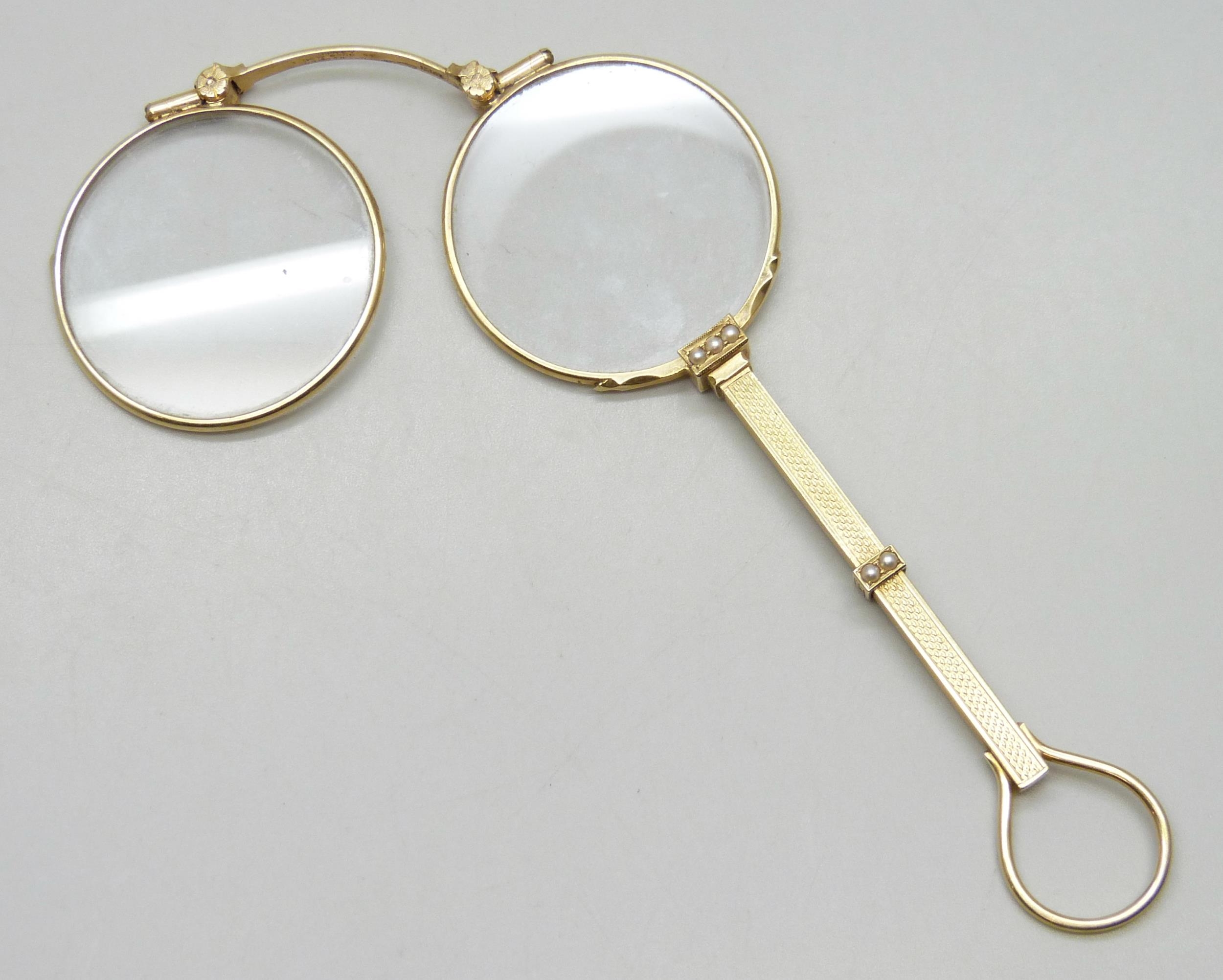 A pair of 15ct gold pearl set lorgnettes, Dixey, New Bond Street, London, 22.9g total, 11.7cm
