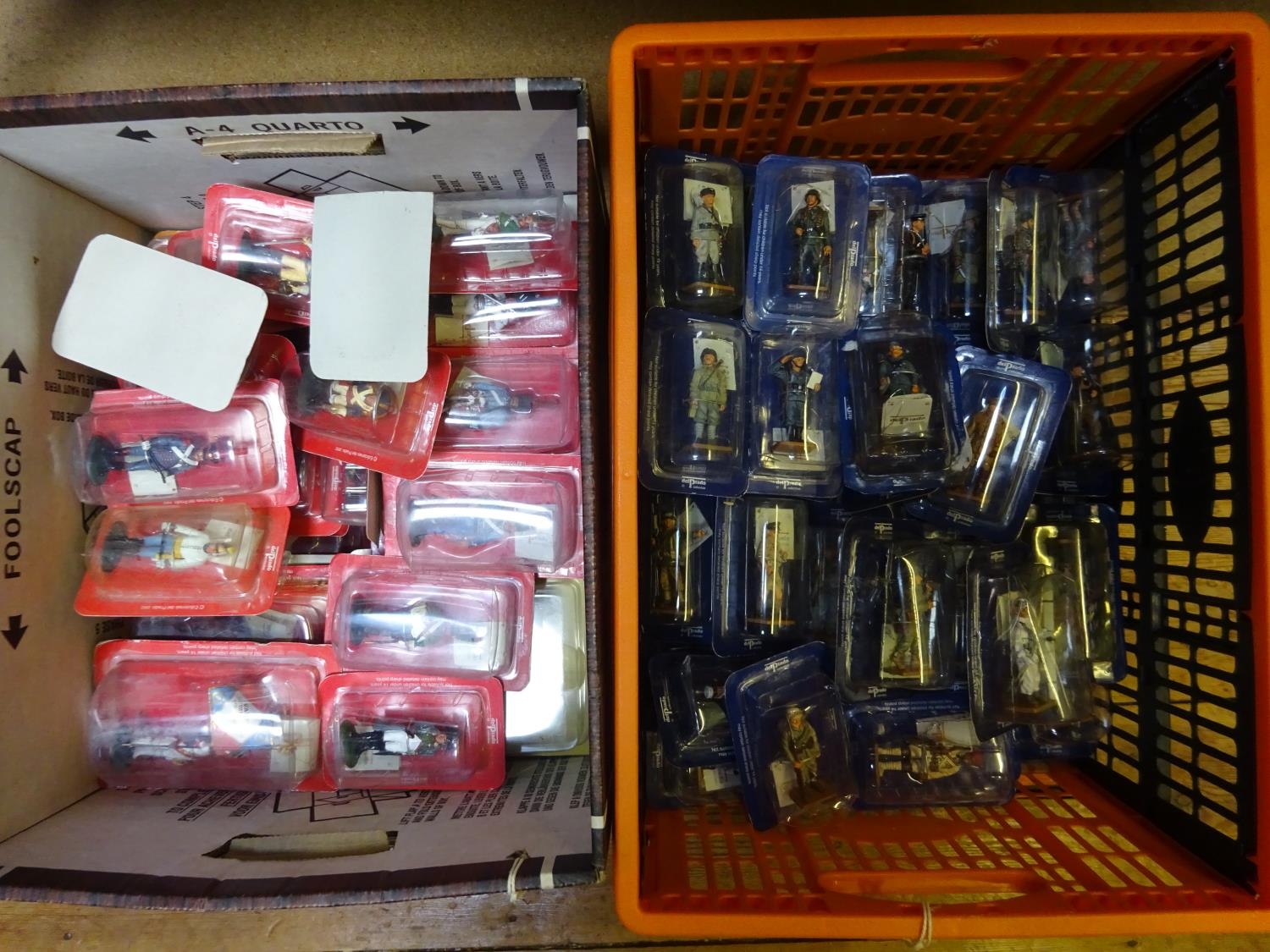Approx 80 Del Prado. Standing figures including, Corp Military Police 9th Airforce USA 1944, Female Sniper Red Army USSR, Ardito Infantry Soldier Italy 1917, Guastatore Tobruk (Libia) Italy 1942, RAF Fighter Pilot UK 1940, Gruppen-Kommandeur Luftwaffe 1944. Infantry Soldier, Stalingrad USSR 1943. Major-Panzer Div, Germany 1943. Paratrooper (Normandy) USA 1944. Plus a Medic 94th Inf Div USA 1945 etc. Together with Napoleonic figures, Fusilier French Sea Soldiers 1800, an Eagle Bearer French Old Guard 1811, Trooper French Carabiniers 1812, Officer Royal Horse Guards 1800, French Navy Lieutenant 1804-15, etc. Plus mounted examples including Officer Kelermann's Hussars 1805, Marshal Ney, Russia 1812. Frederick Henry II of Orange 1629. Capt of Musketeers C.1670, Trooper Coraceros Espanoles 1810 and a Spanish Knight C.1500 etc. All packeted, mostly still sealed. £70-100