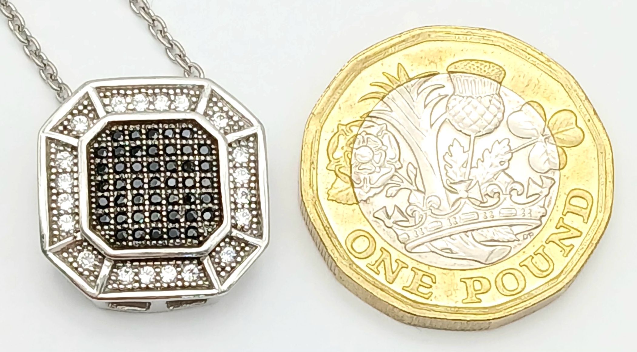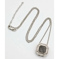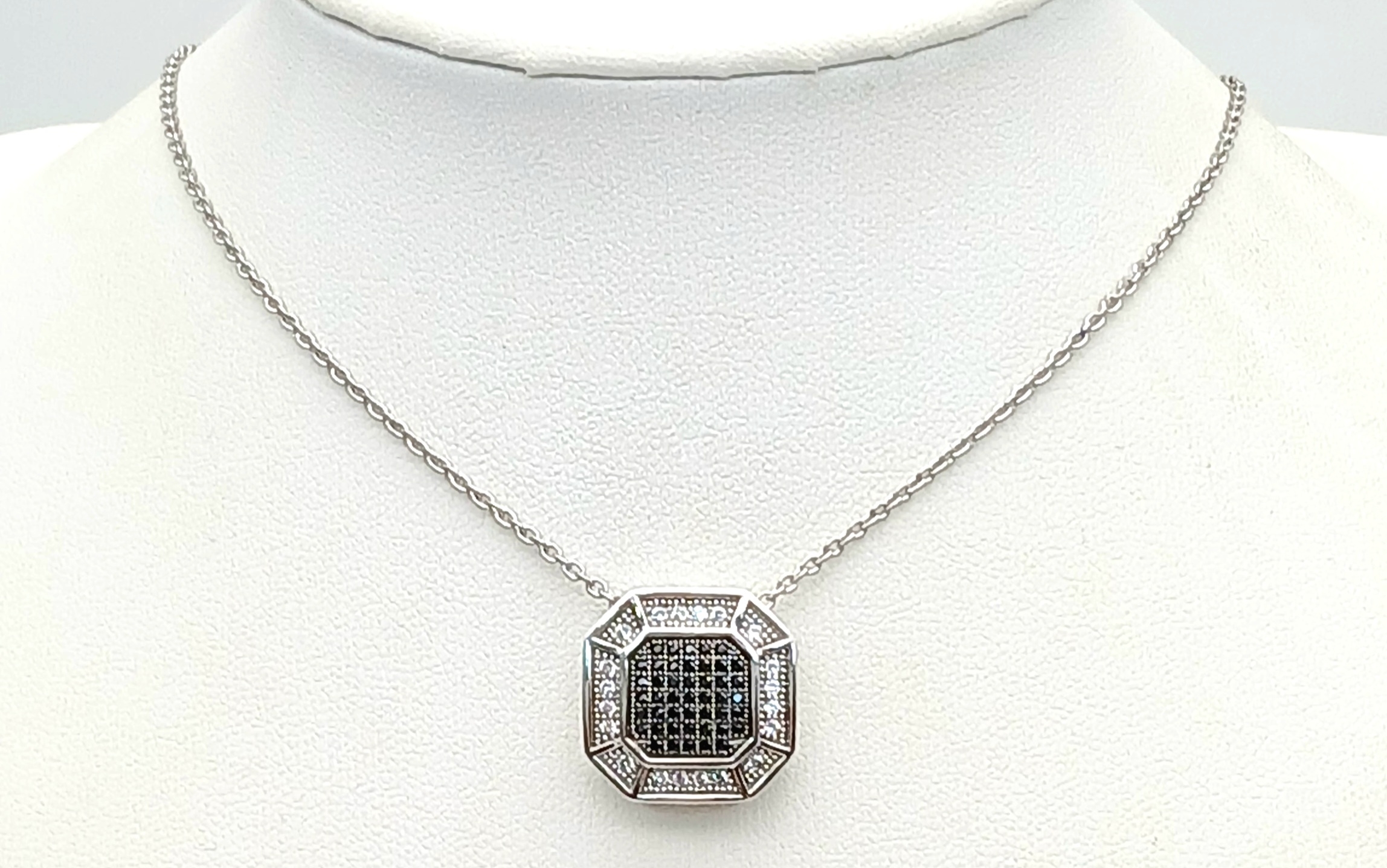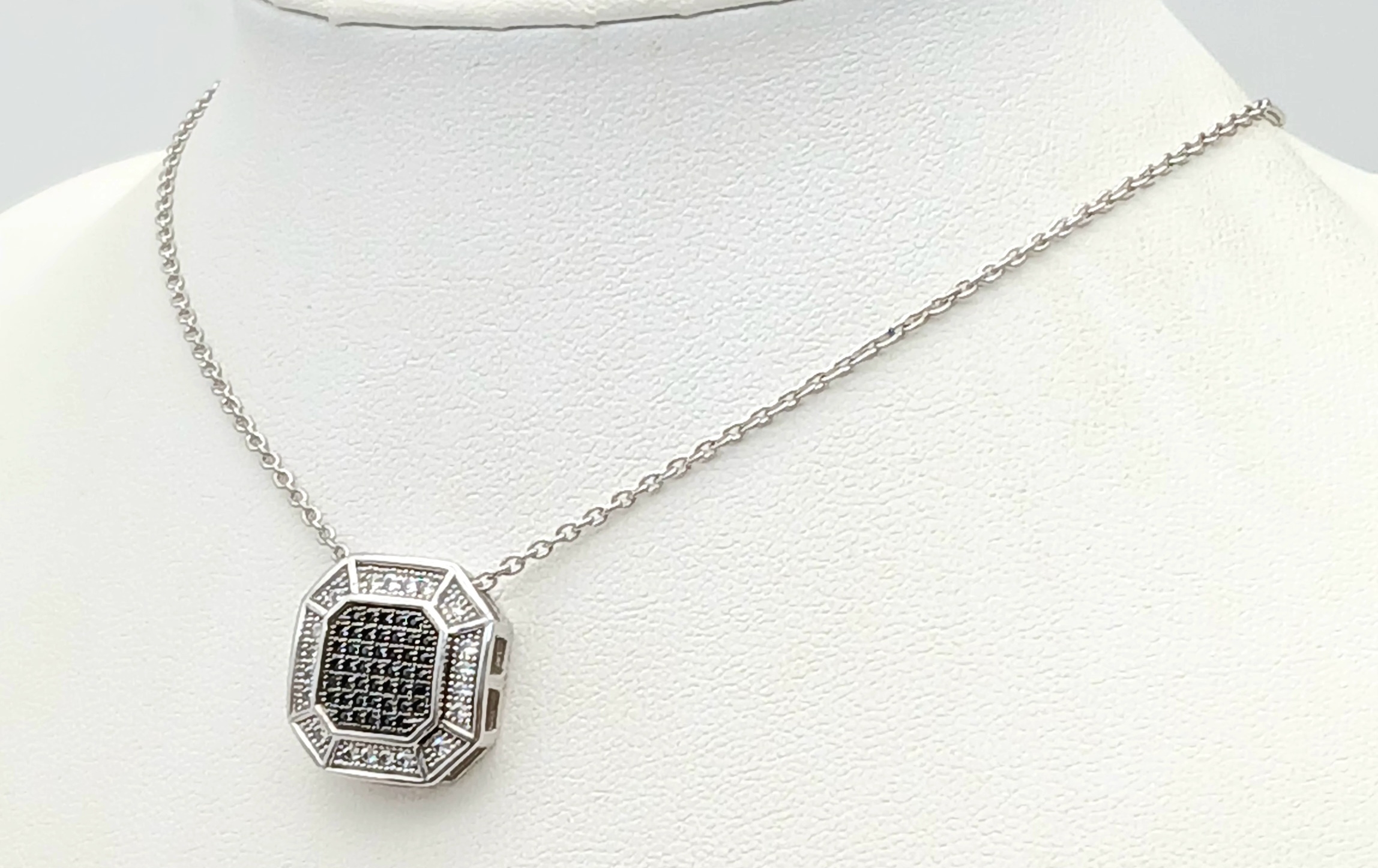 A Stylish Sterling Silver Black and White Cubic Zirconia Pendant Necklace-46cm Length Chain. The Pendant measures 1.6cm Wide. Gross Weight 6.11 Grams.