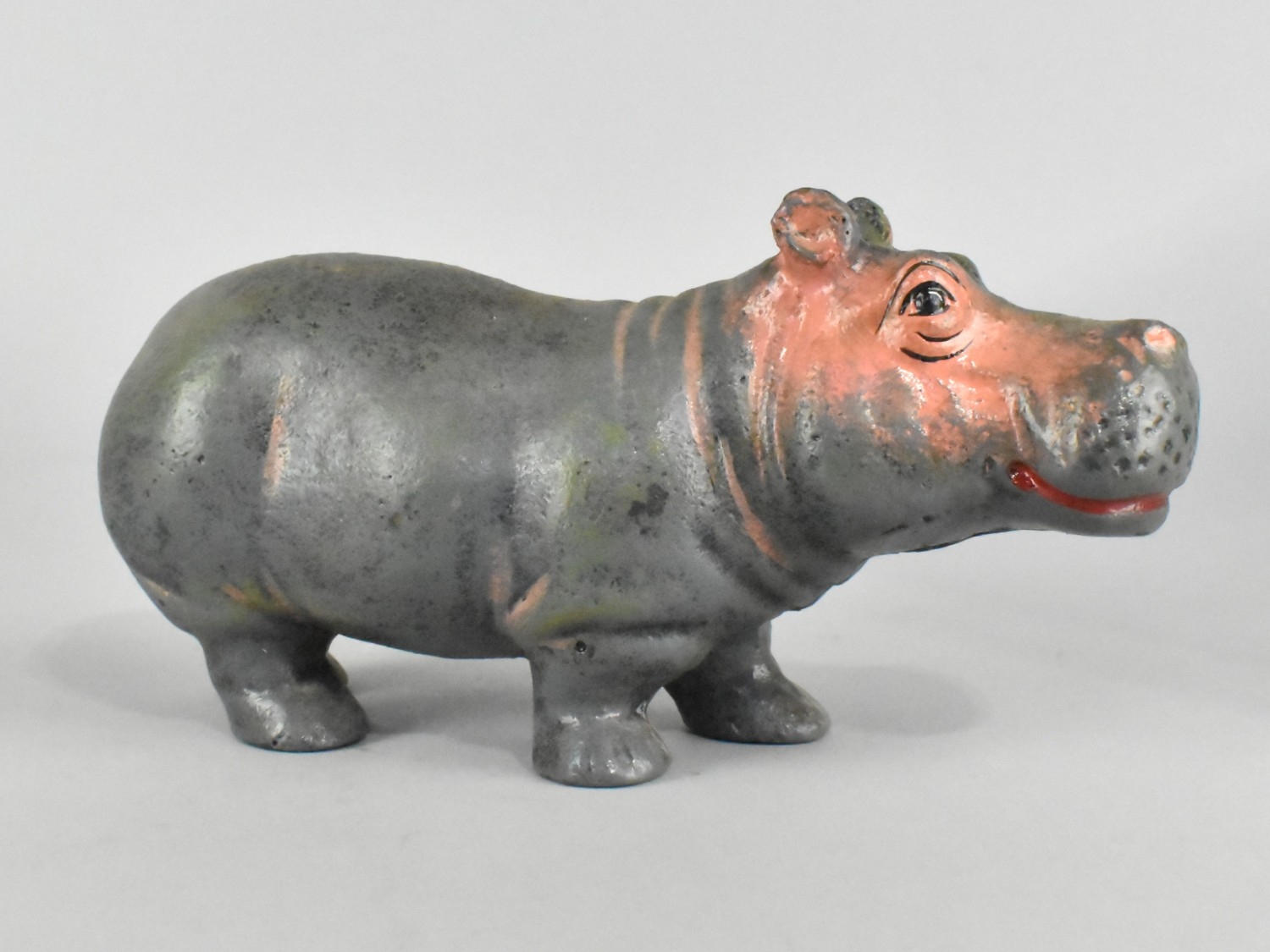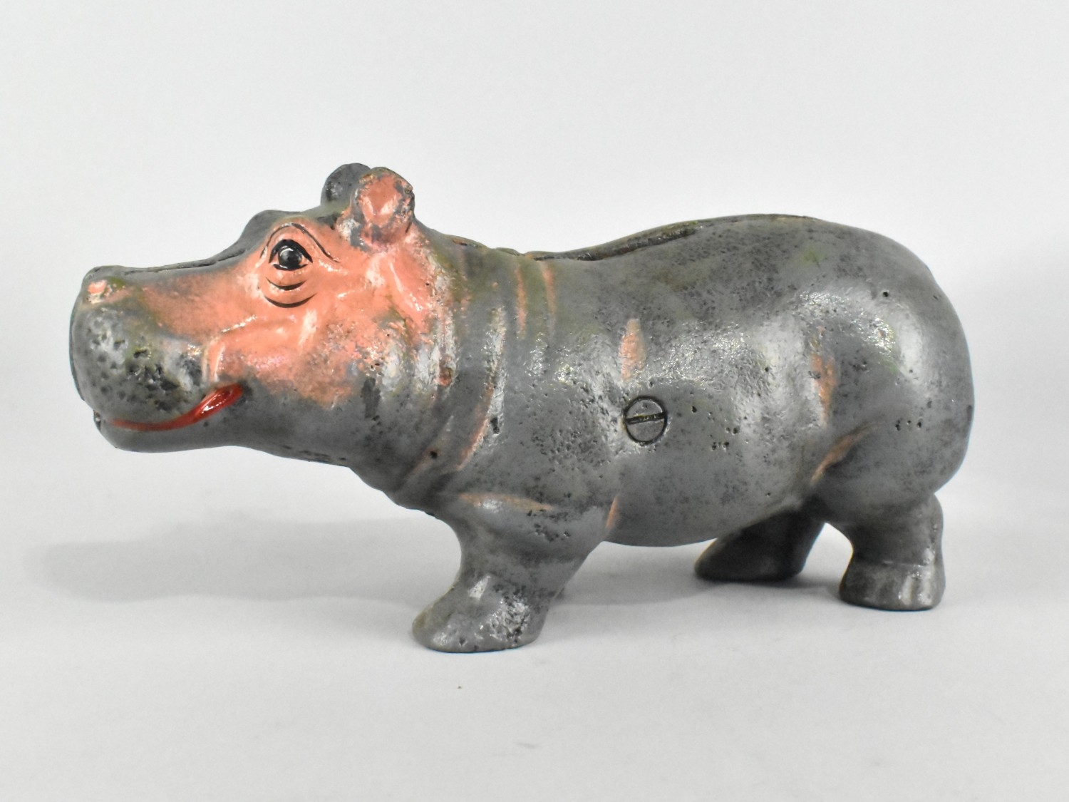 A Cold Painted Cast Iron Novelty Money Bank In The Form Of A Hippo, 20cms Long