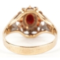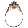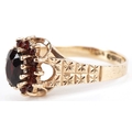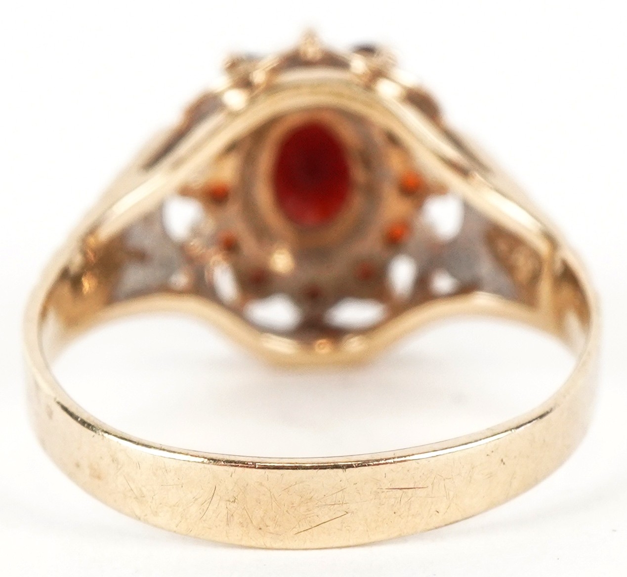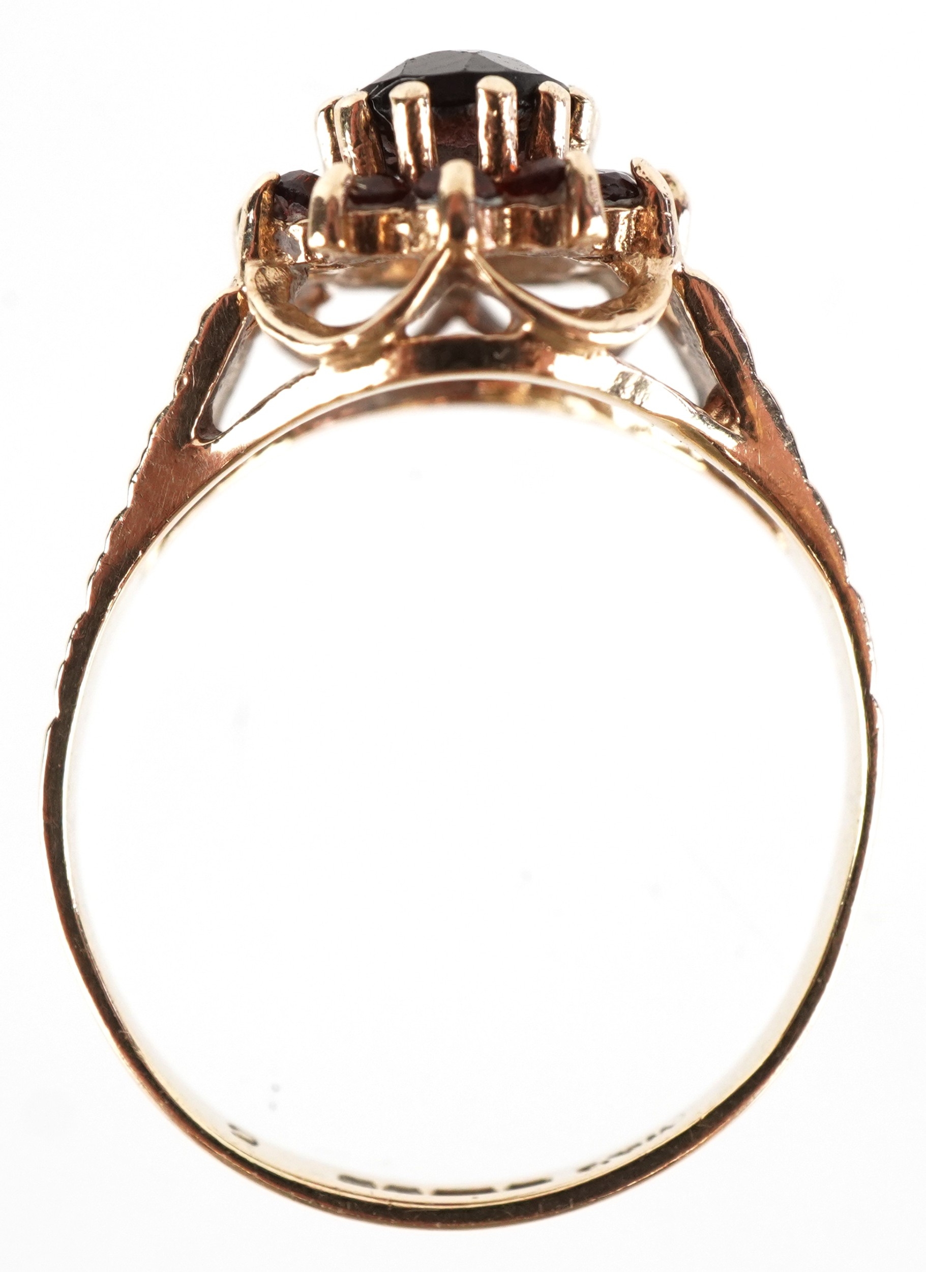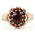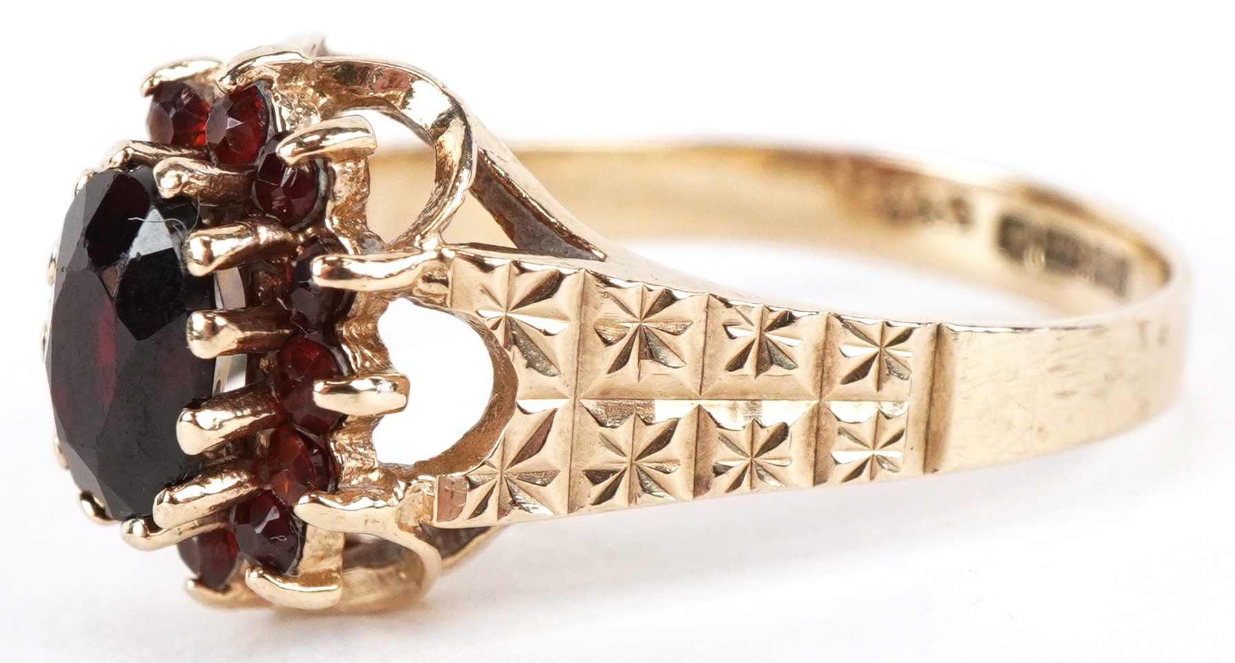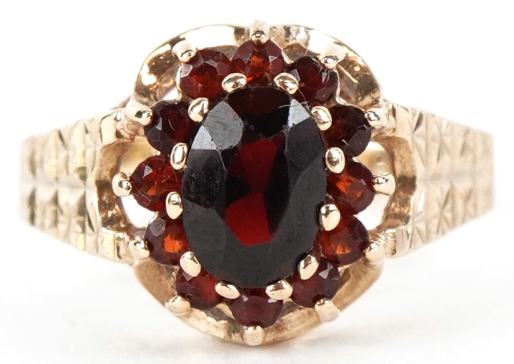 A 9ct gold two tier garnet cluster ring with engraved shoulders, size M, 2.7g.