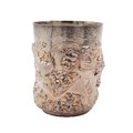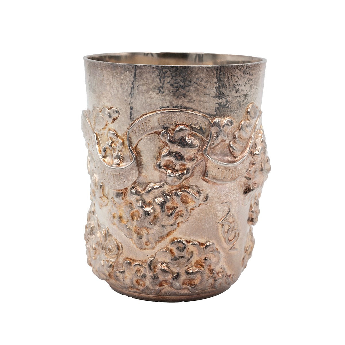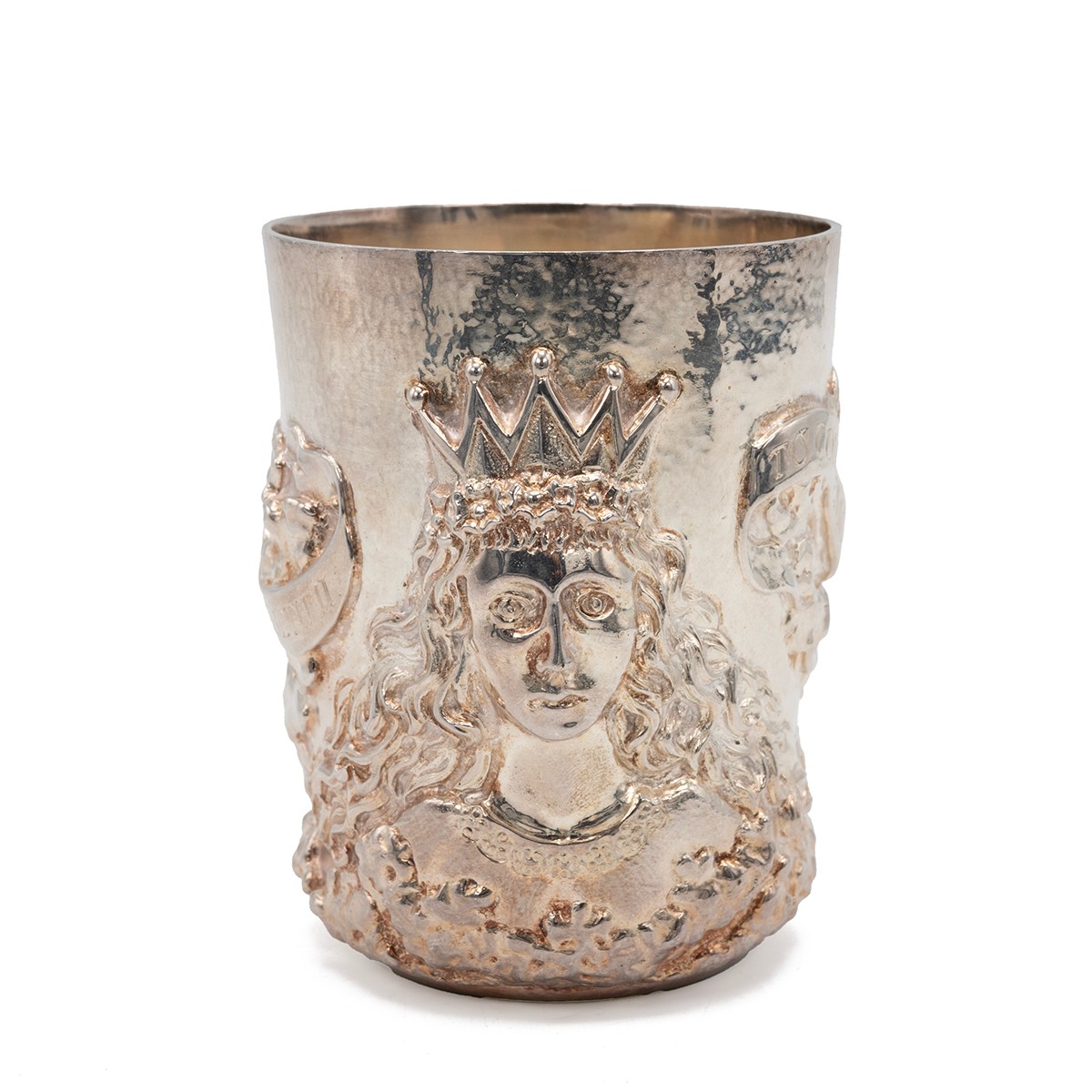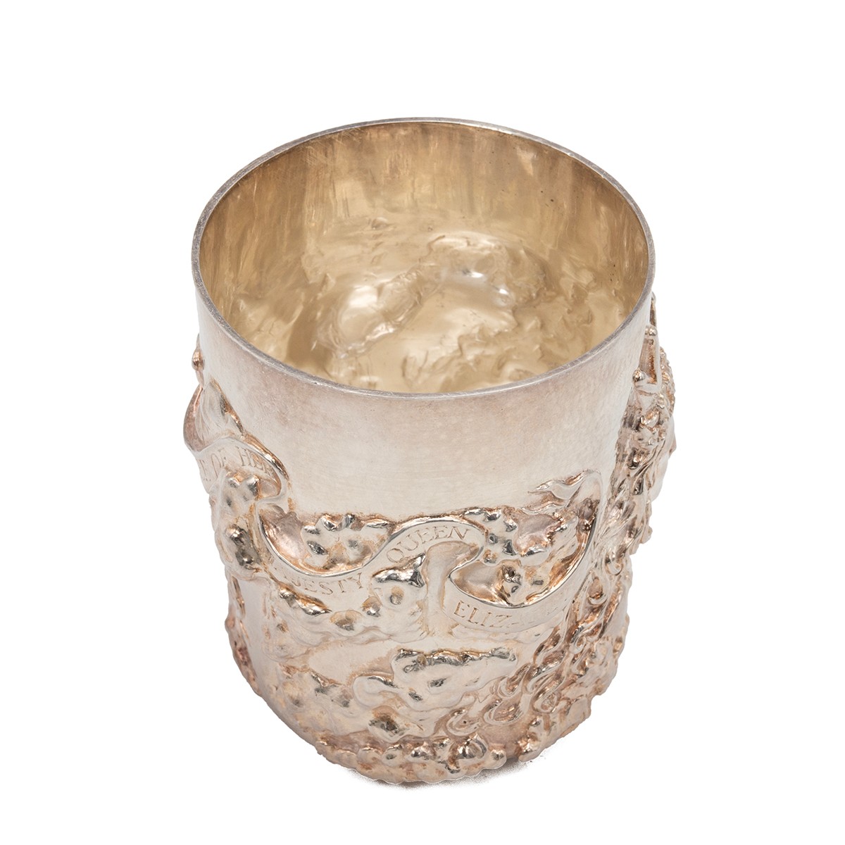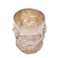 A silver Golden Jubilee beaker, commemorating Queen Elizabeth II's Golden Jubilee, with heavily embossed decorations and a shallow relief of Queen Elizabeth II surrounded by embossed decoration and ribbon with inscription "to commemorate the Golden Jubilee of Queen Elizabeth II". The rim of the beaker with a lightly hammered texture. Hallmarked to the base London, 2002, maker Grant McDonald. H8.5cm, gross weight 258 grams.