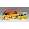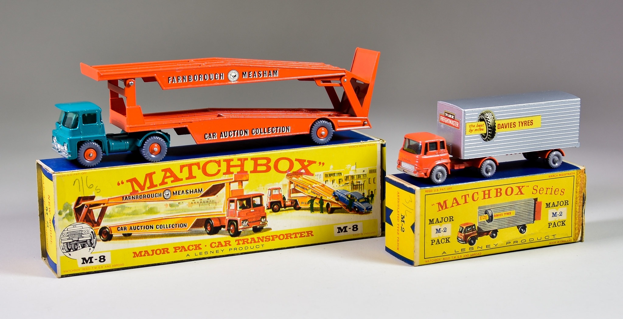 Two Lesney Matchbox Major Series Diecast Model Cars, comprising - No. M-2/ M2-B "Bedford TK Articulated Truck and Trailer", orange body, Davies Tyres decal, metallic silver trailer, rare 24-tread grey plastic wheels, and No. M-8/ M8-B "Guy Warrior Articulated Car Transporter", turquoise tractor unit, turquoise windows, orange trailer, orange hubs, in E1 and D1 type boxes