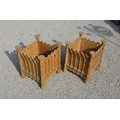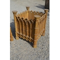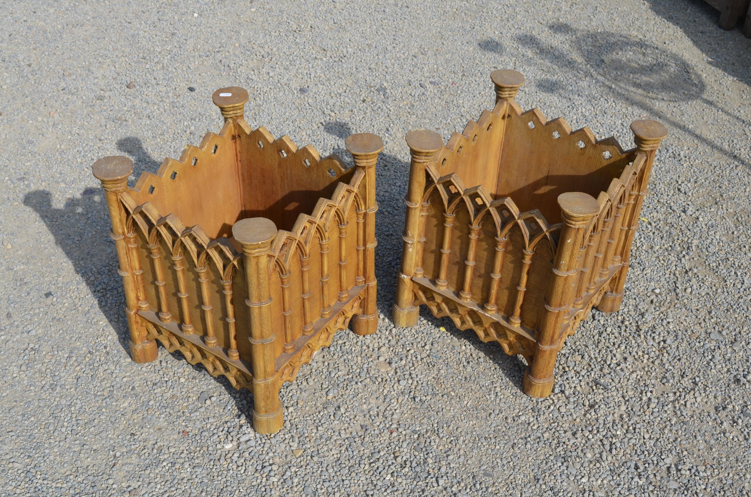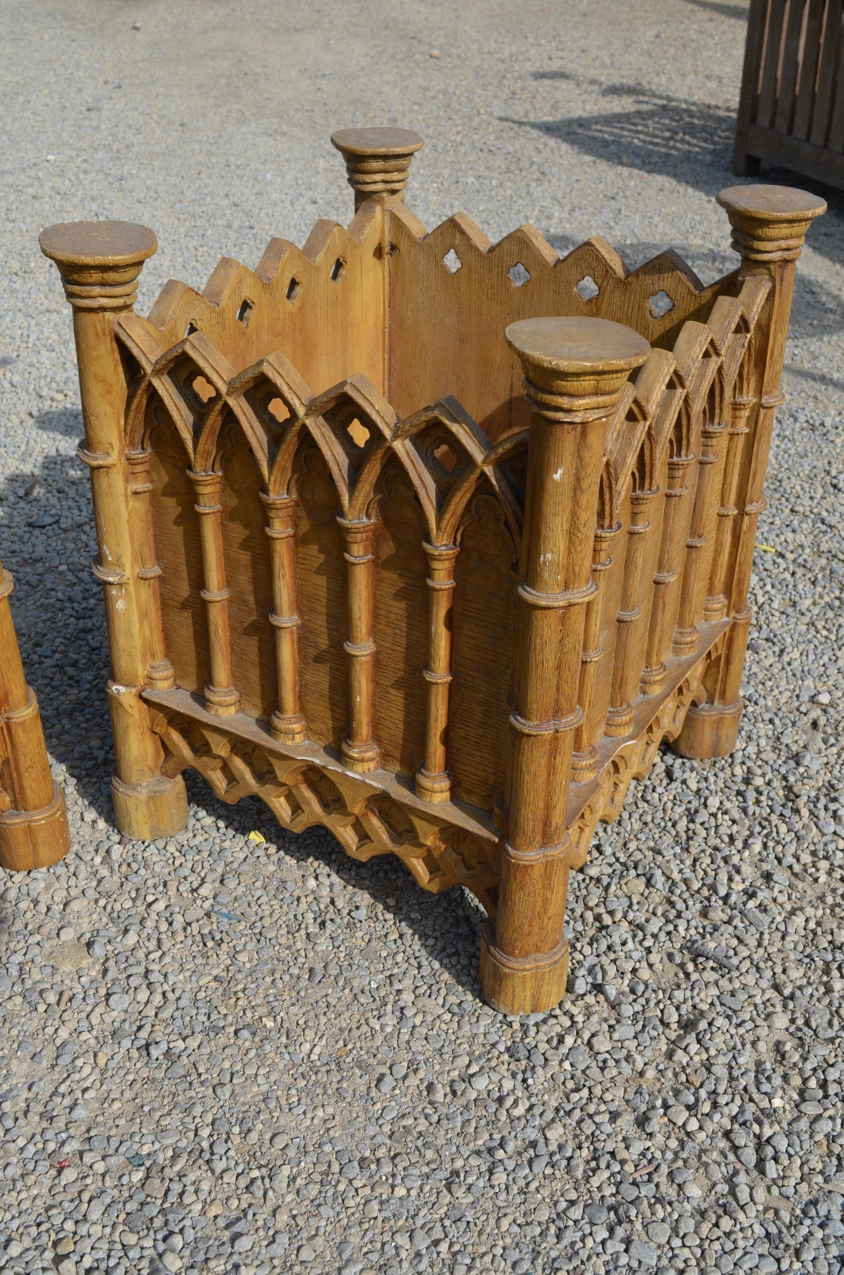 Pair of oak finish Gothic style planters with arcaded side and cluster column supports. W41cm x D41cm x H48cm (2)