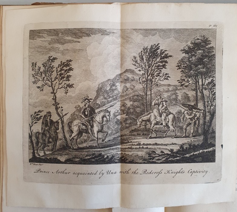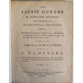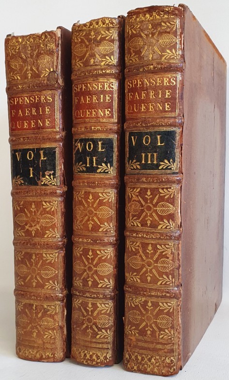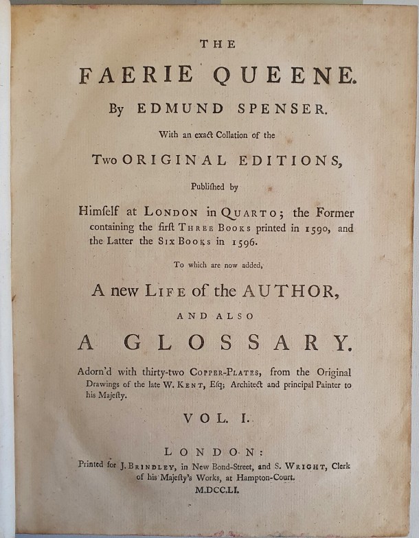 The Faerie Queene by Edmund Spenser. With an exact Collation of the Two Original Editions published by Himself at London in Quarto; the Former containing the First Three Books printed in 1590 and the Latter the Six Books in 1596. To which are now added A New Life of the Author, and also A Glossary. Adron'd with thirty-two copper plates, from the Original Drawimgs of the late W. Kent, Esq; Architect and principal Painter to his Majesty. London: Printed for J. Brindley, in New Bond-street and S. Wright, Clerk of his Majesty's Works at Hampton Court. 1751. Large quarto in three volumes. Bound in contemporary calf bindings with gilt spines & morocco labels. Re-backed with the original spine leather re-laid. (3)