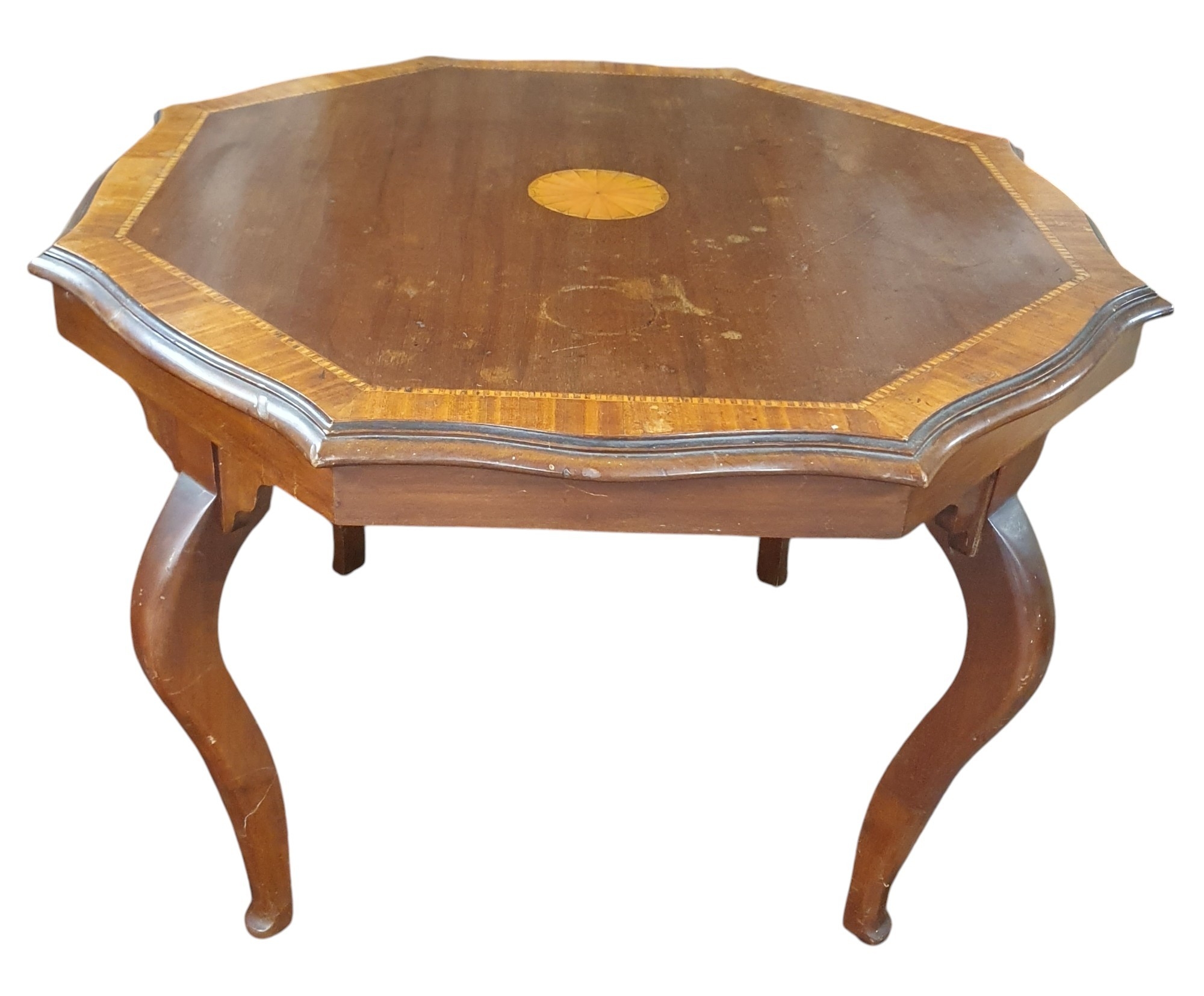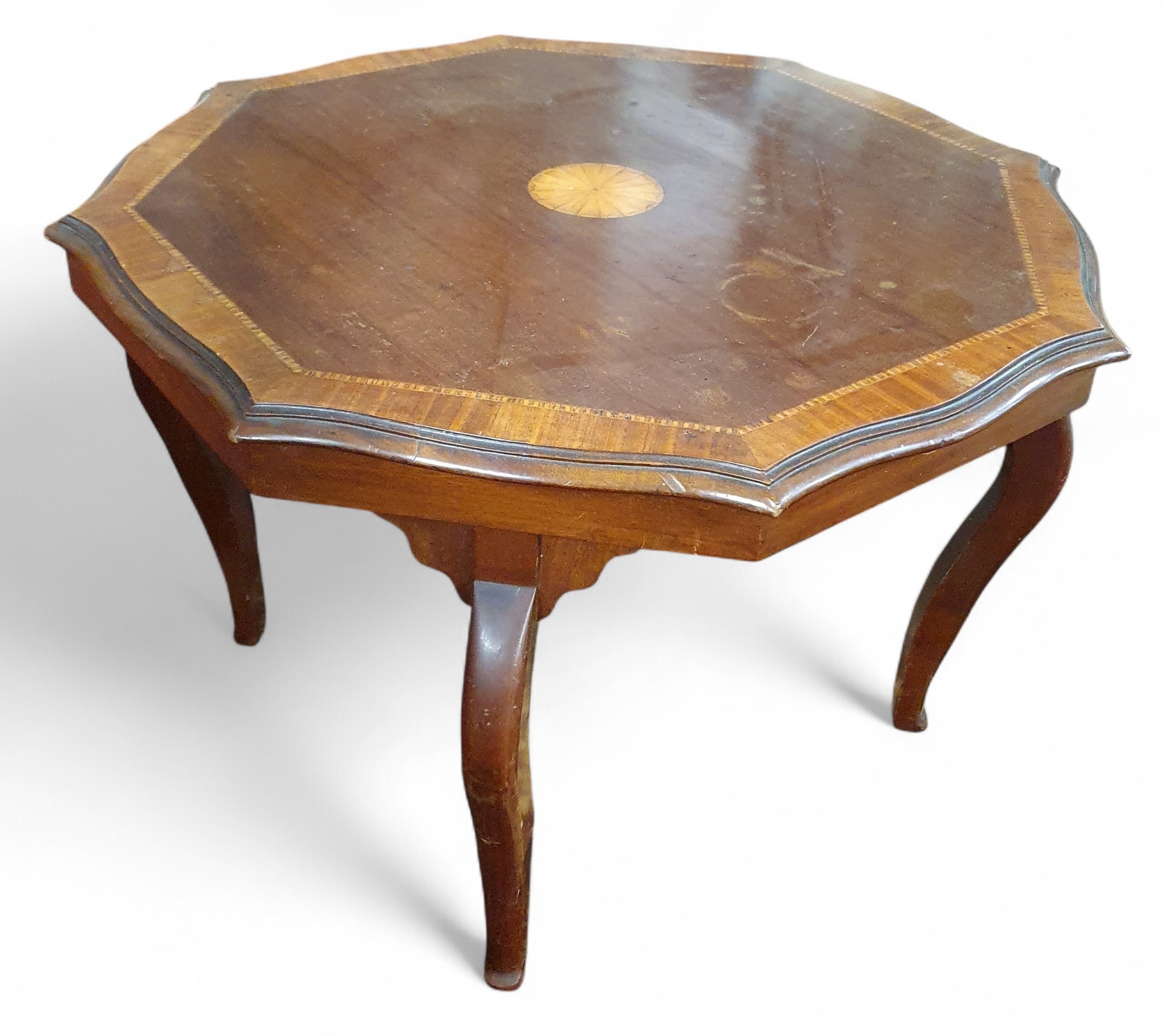 An Edwardian Mahogany and Inlaid octagonal Coffee Table with shell inlay top. 71 x H 48 cm approx.