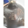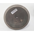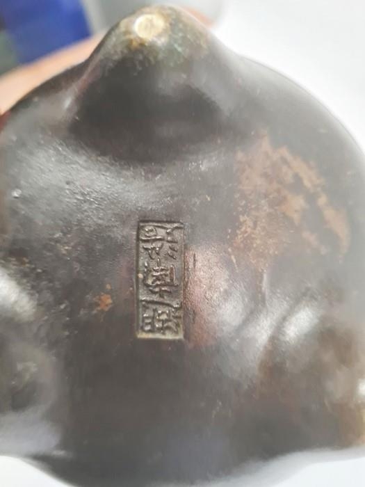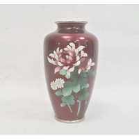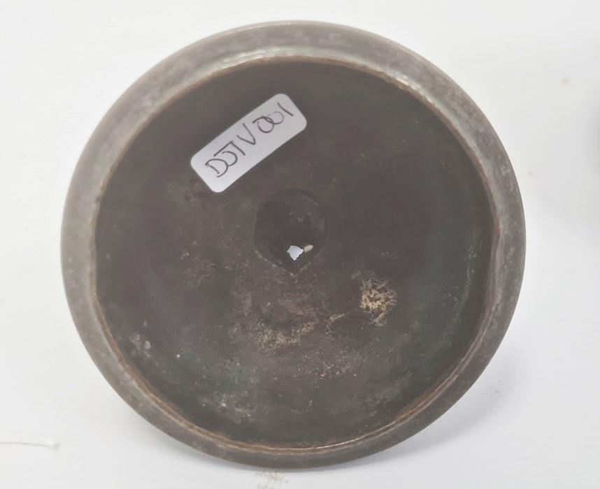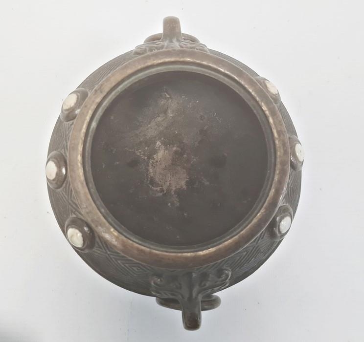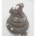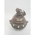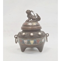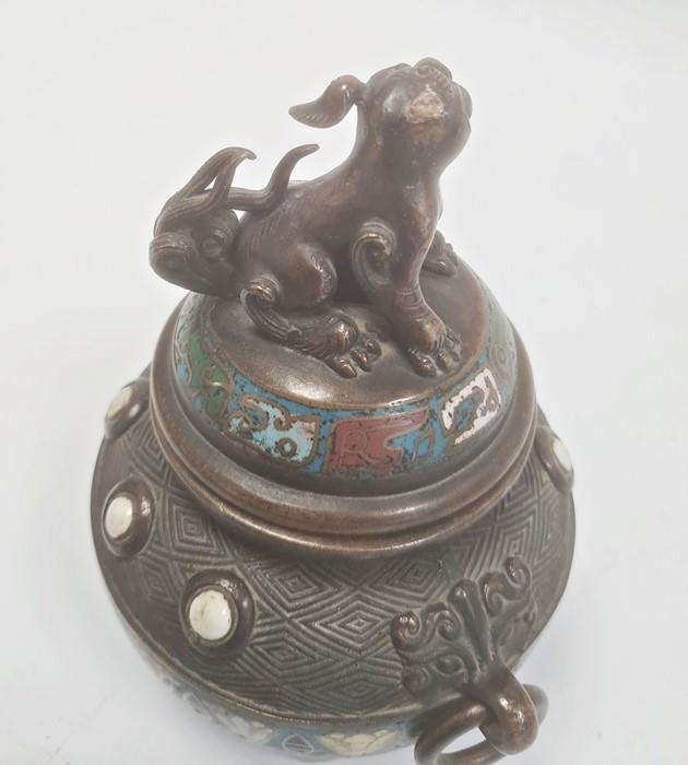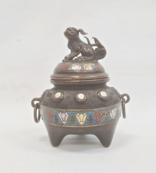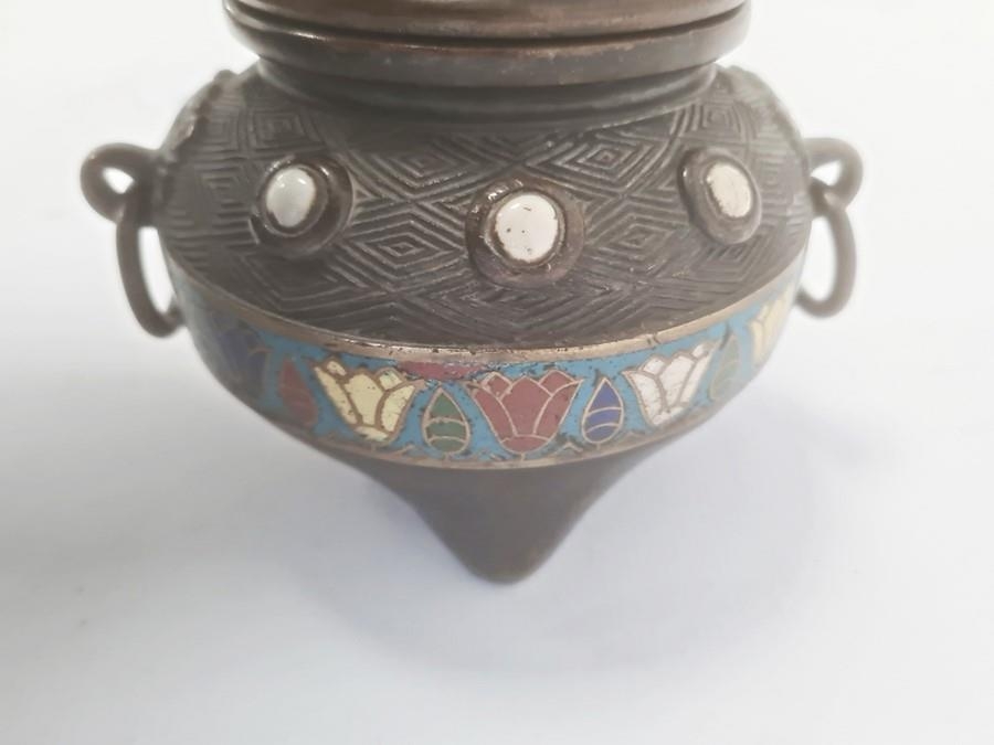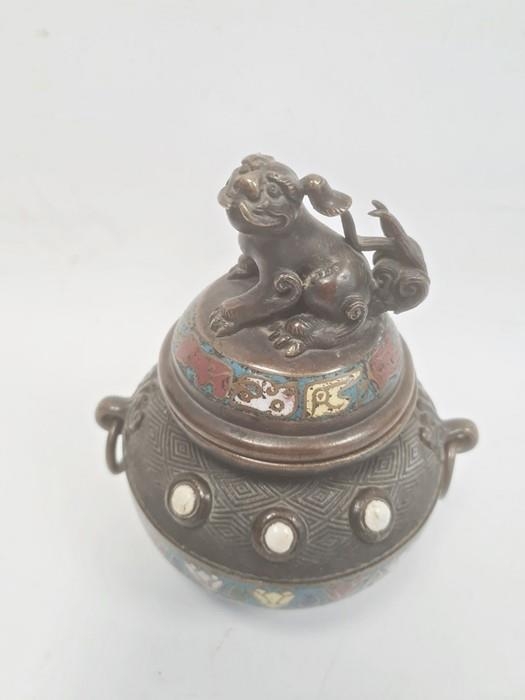 Chinese 19th century bronze and enamel koro and cover, the domed lid with dog of fo finial and the two-handled vase with enamel band of stylised tulips, 18cm high