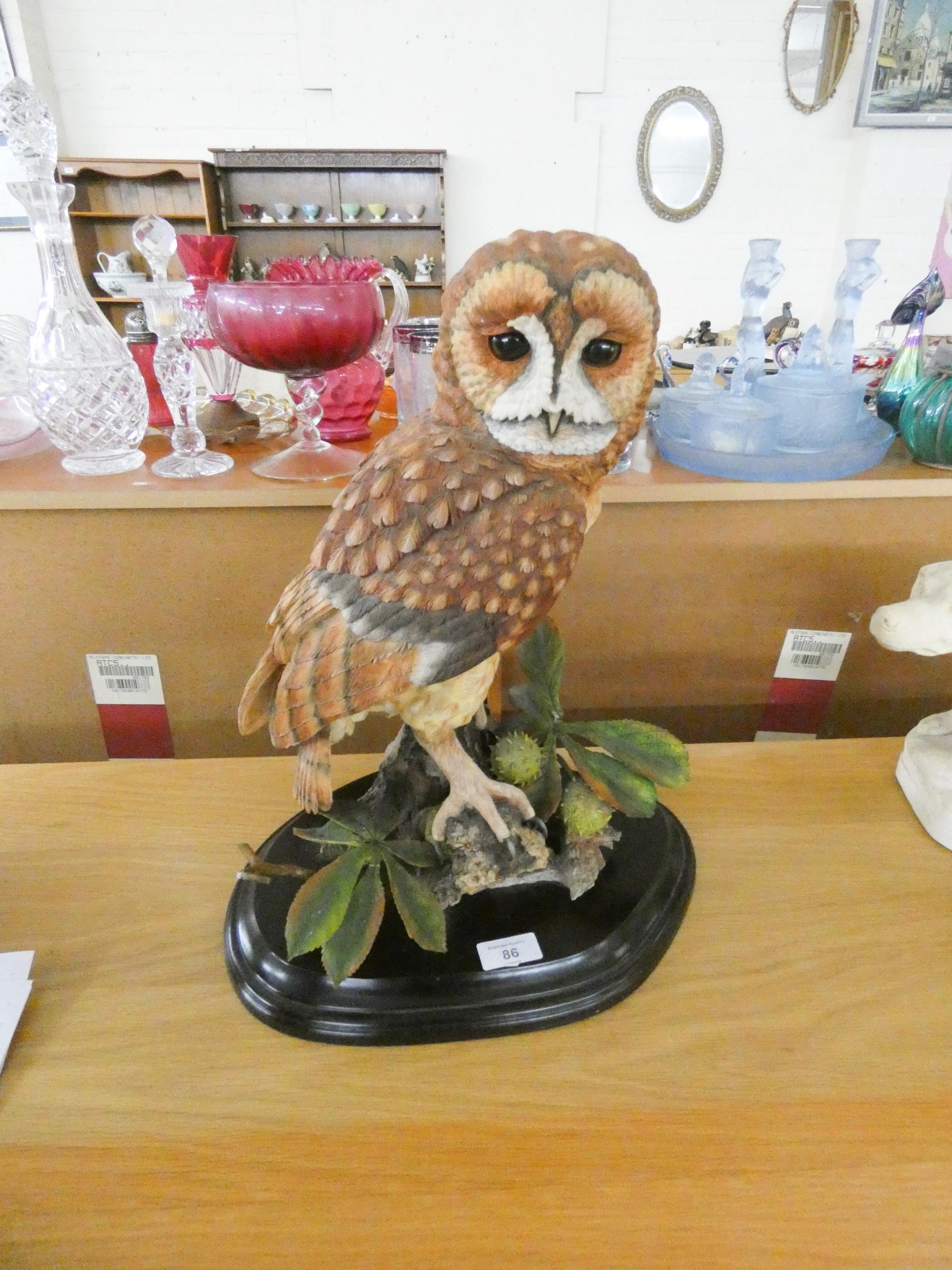 A large barn owl ornament on wooden plinth