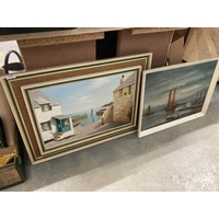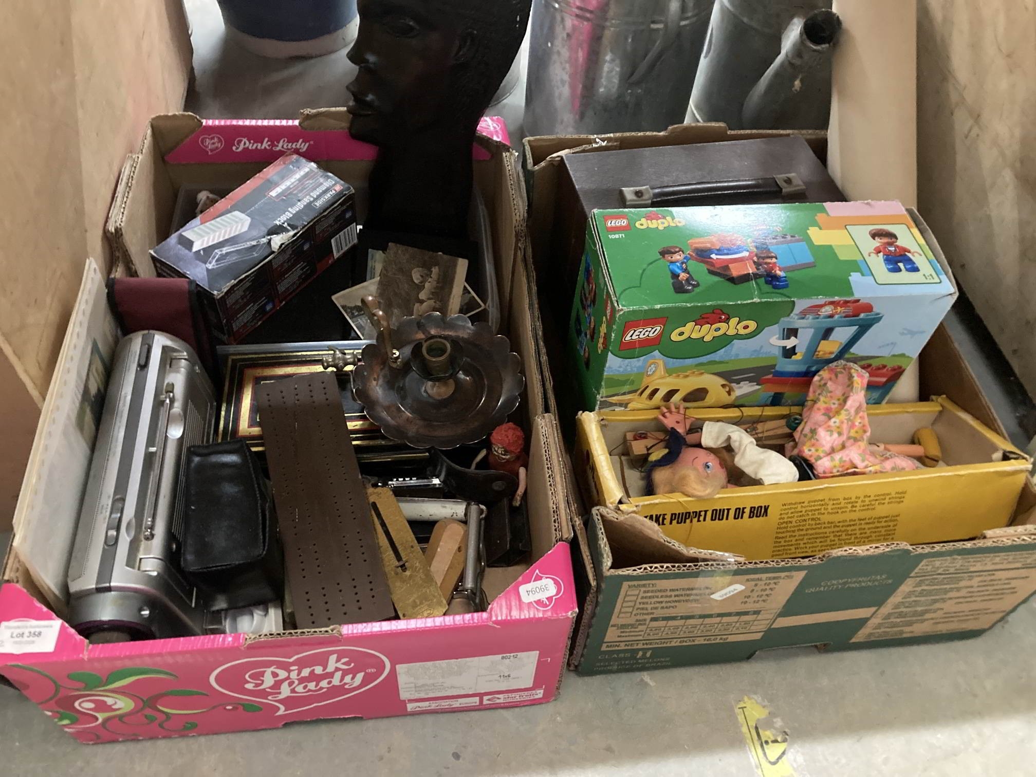 2 boxes of collectables inc. chamberstick, cash tin, Pelham puppet, spring balance scales, African carving etc.