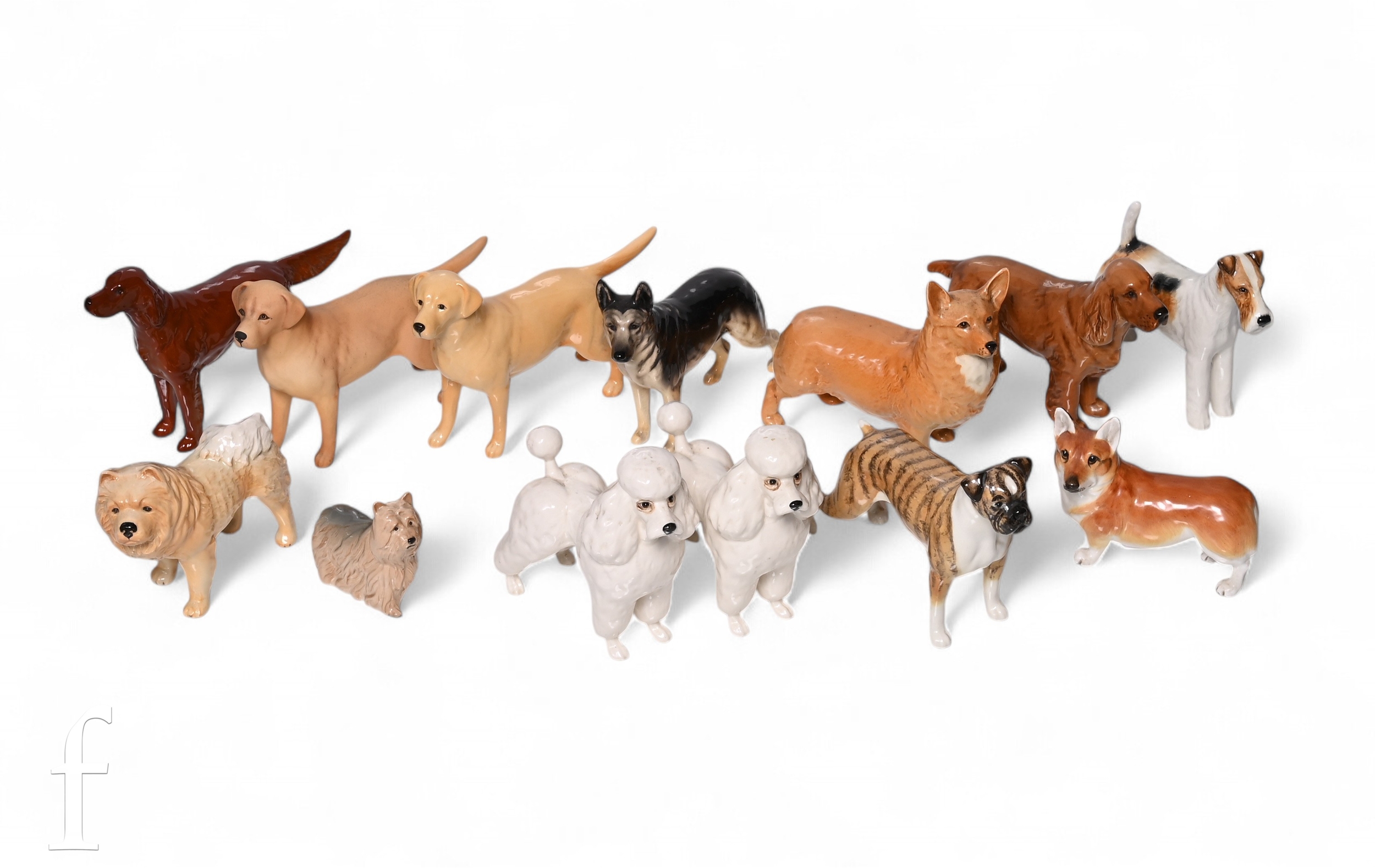 A collection of Beswick dog figures, including Brindle Boxer, Labrador, Corgi, 'Talavera Romulus', Red Setter, French Poodle, tallest 15cm. (13)
