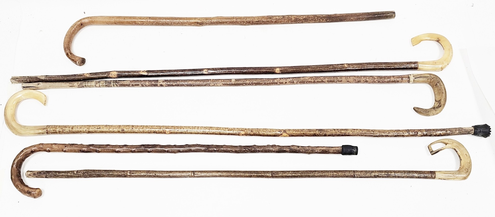 Four shepherds crooks with rams horn curved handles, longest 123cm, a briarwood walking stick and another walking stick (6)