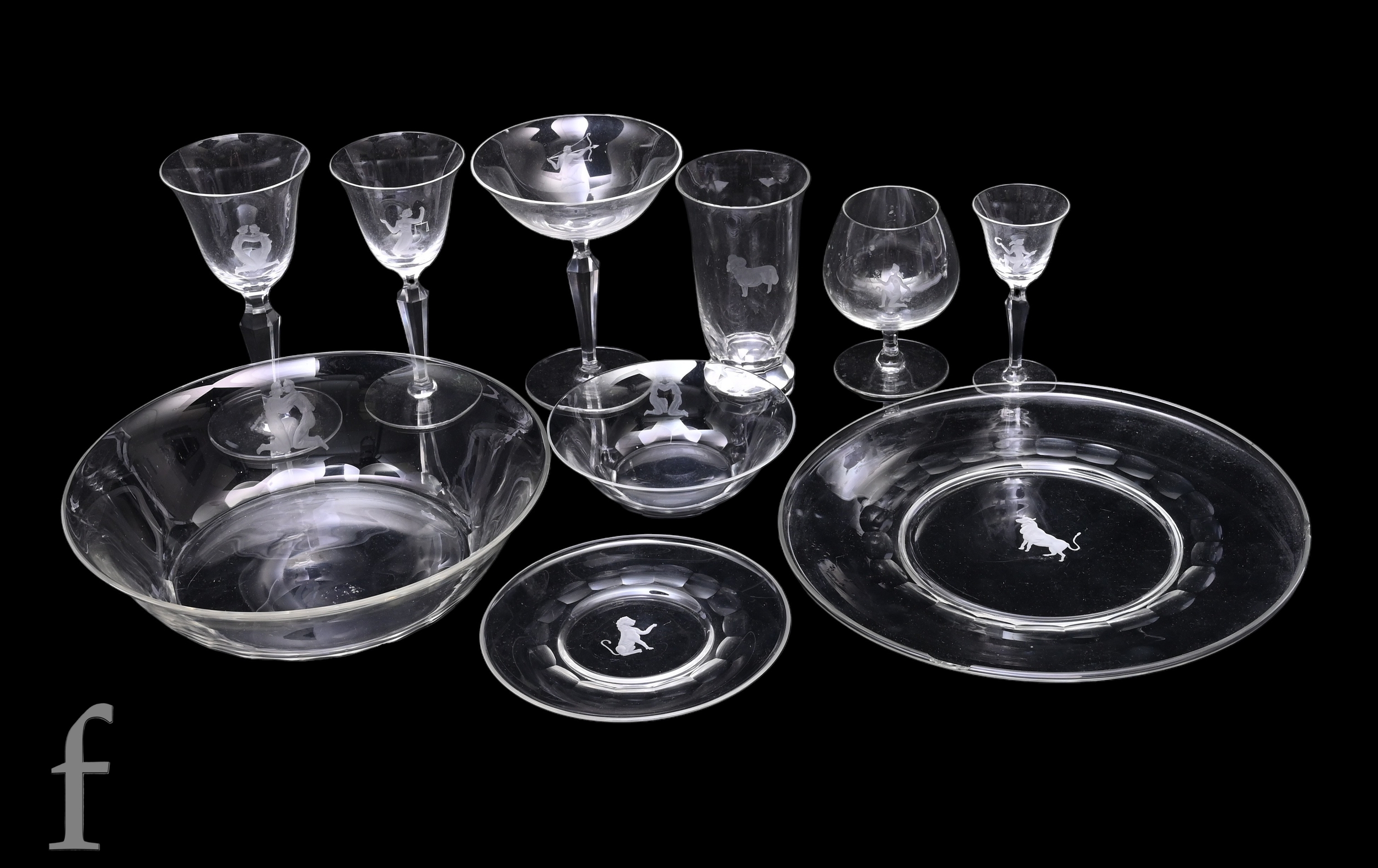 A comprehensive part suite of late 19th, early 20th Century continental crystal drinking and table wares, intaglio cut with signs of the zodiac, comprising drinking wares with bell shaped bowls and facet cut stems to include five large wines, ten small wines, ten liqueurs, twelve large and eleven small tumblers, seven brandies and a champagne, twelve side plates, diameter 13cm, twelve reverse polished and intaglio cut plates, diameter 14.5cm, a large bowl, 23cm, and a plate, diameter 26cm. (82)
