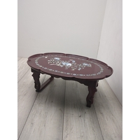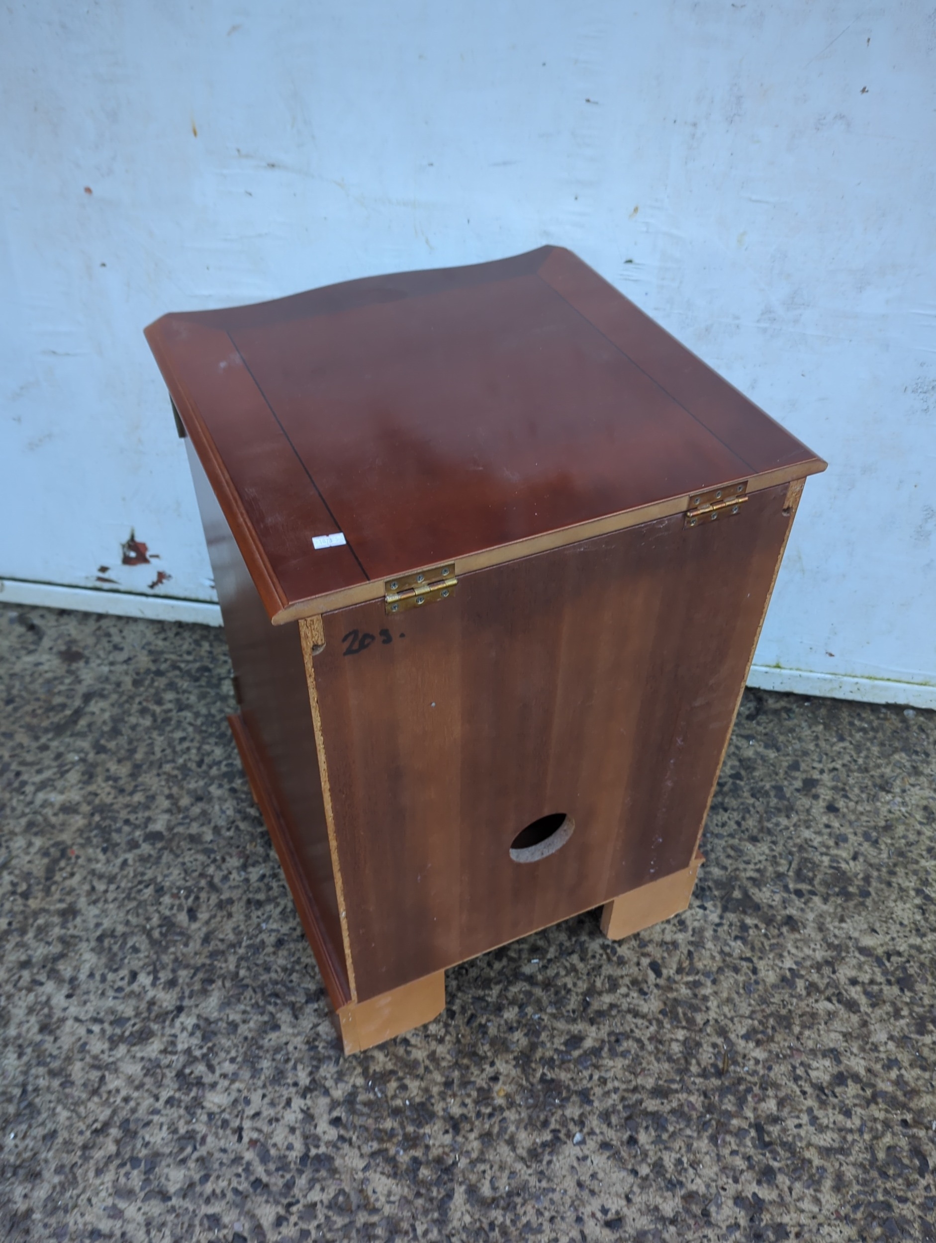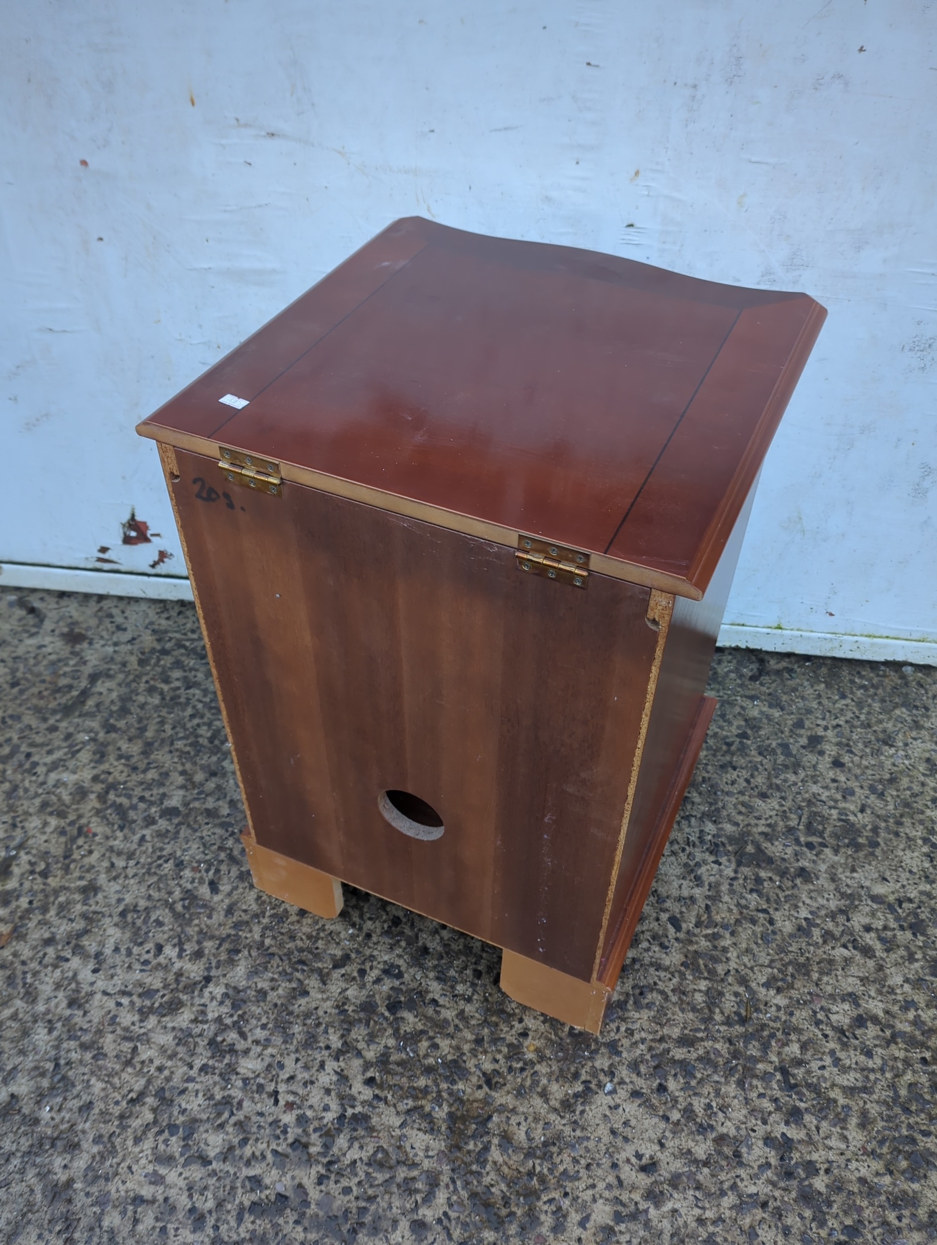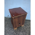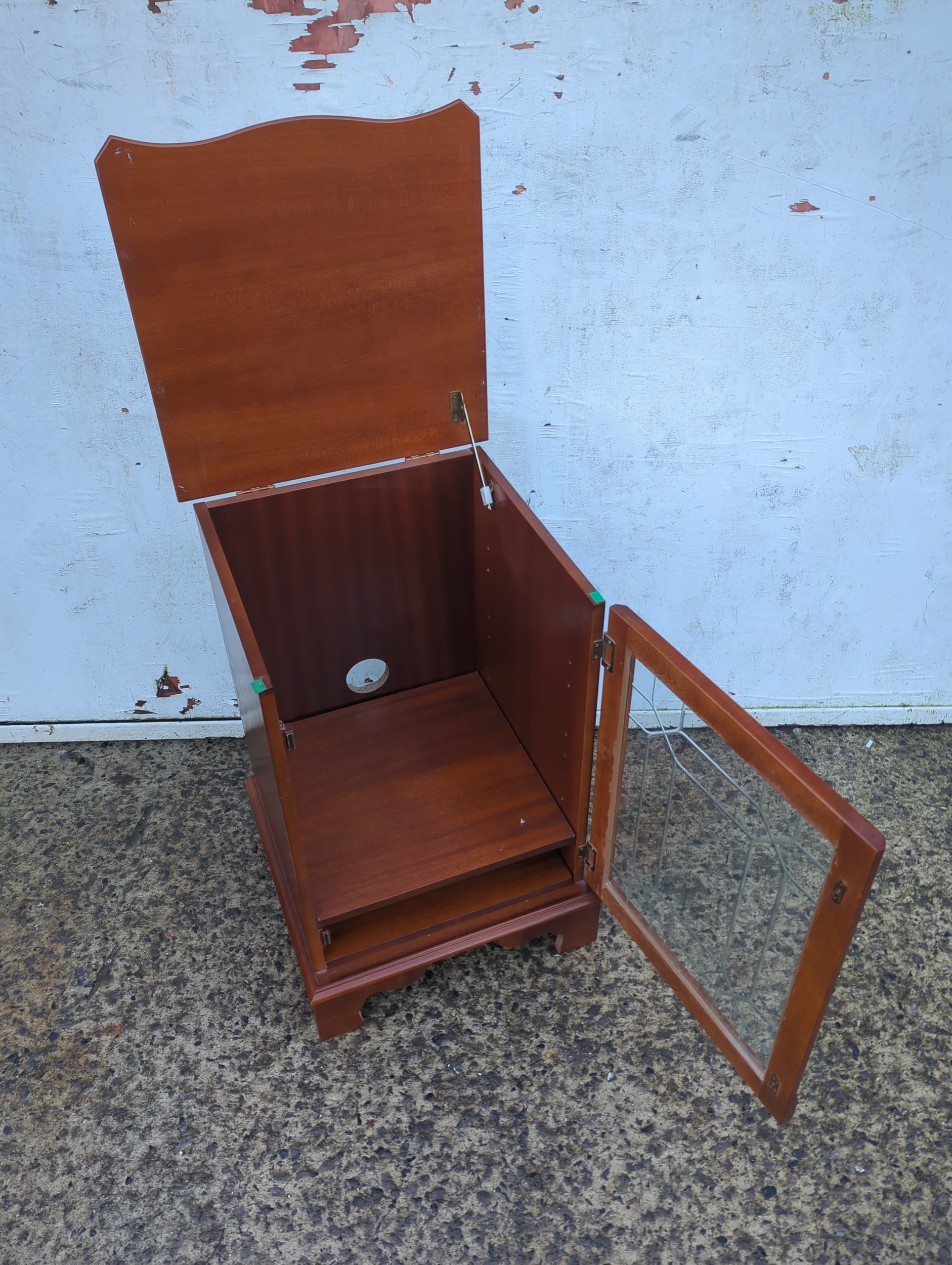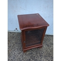 This is an oak cabinet featuring a glass-fronted door with decorative elements. The piece includes a hinged top and a cut-out at the back, possibly for cable management. Its compact design is suitable for small spaces, offering both functionality and style.