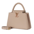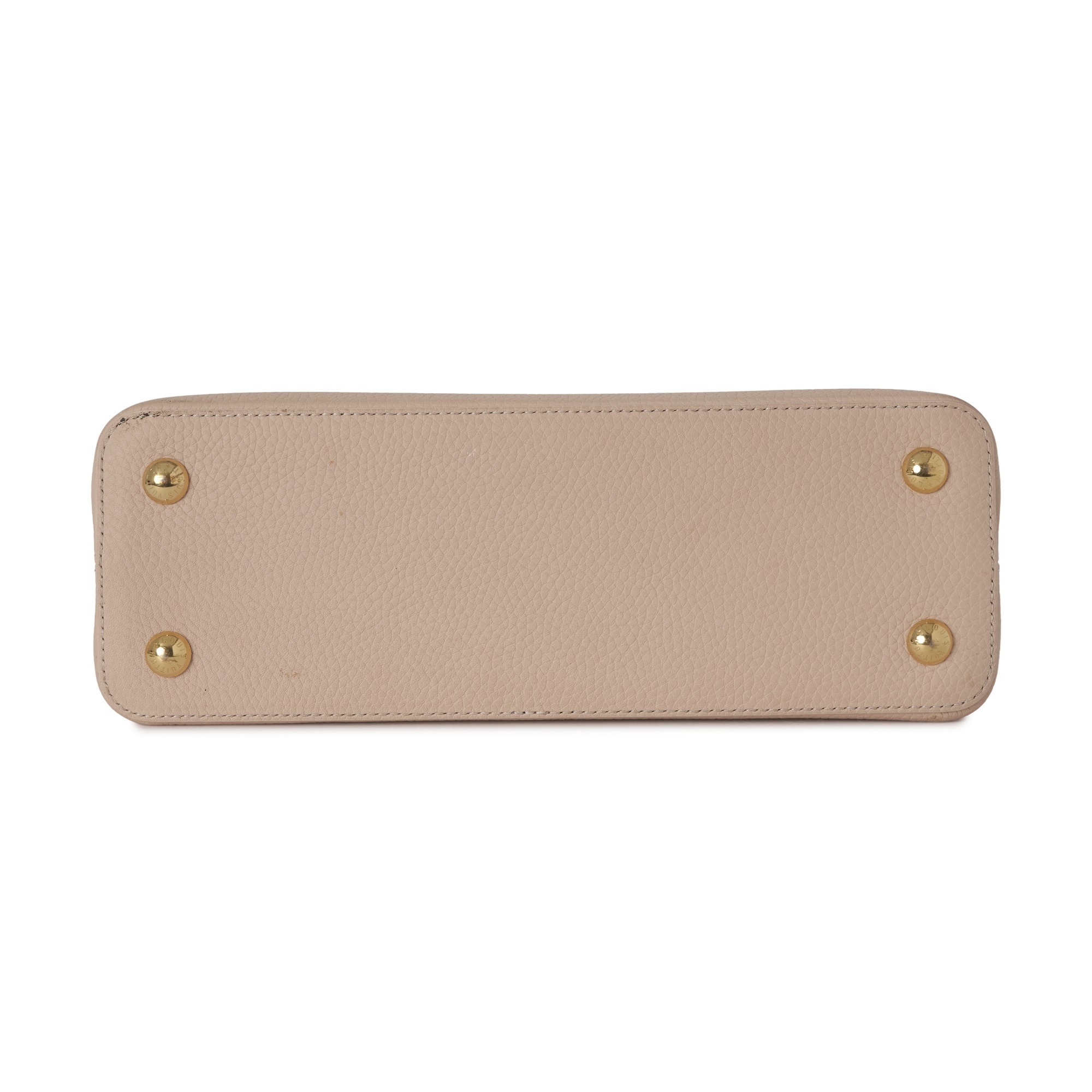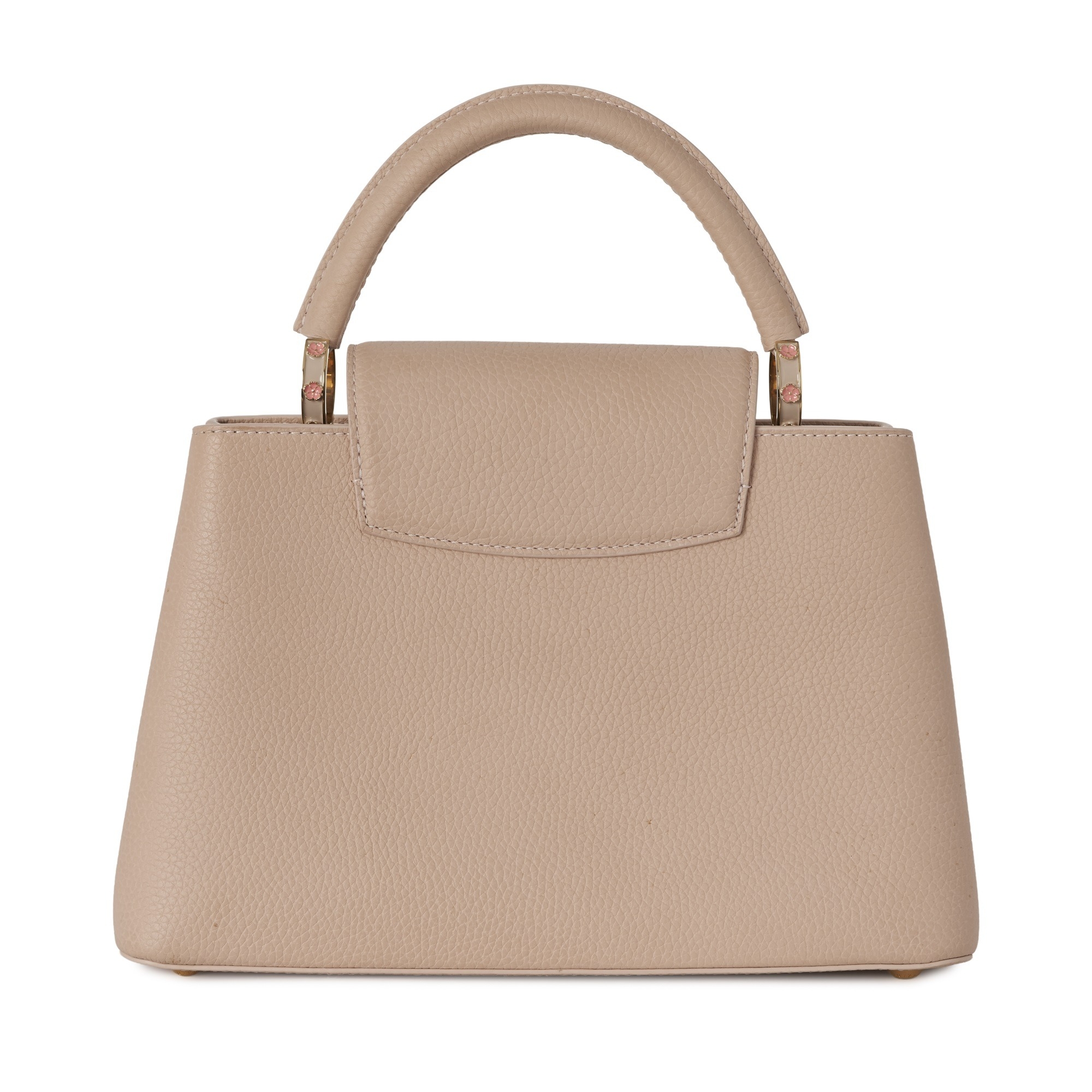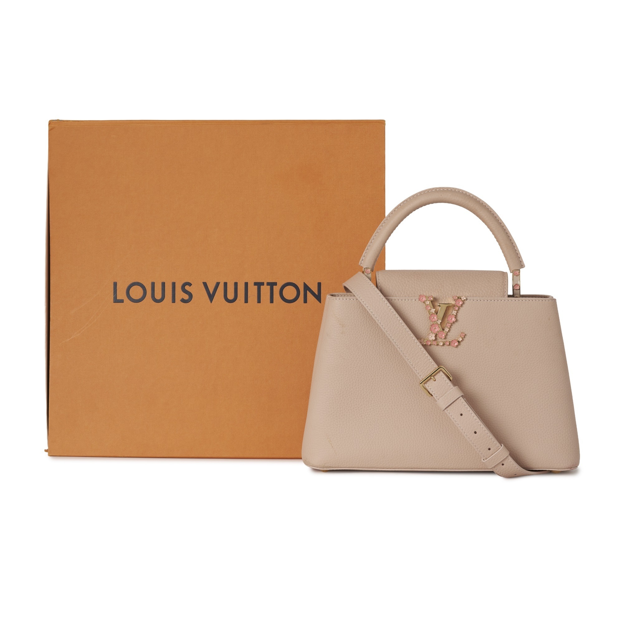 Louis Vuitton, a rare Bloom Capucines PM handbag, from the S/S 2024 collection, crafted from powder beige Taurillion leather with gold-tone hardware, featuring enamel flowers applies to the LV lettering and handle anchors, with a single rigid leather handle, detachable leather shoulder strap, top flap closure with floral-patterned interior lining, measuring 11 by 20 by 31cm, with maker's dust bag, box and receipt