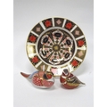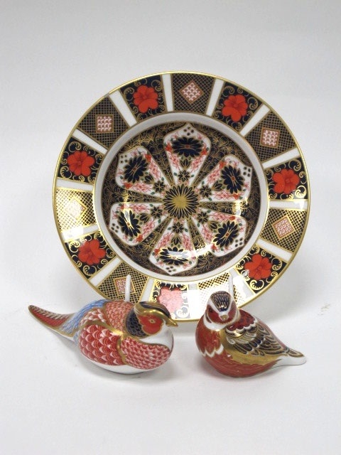 A Royal Crown Derby Porcelain Soup Bowl, decorated in Imari pattern 1128, date code for 1984, 22cm diameter, second quality; Two Paperweights, 'Chaffinch', no stopper and 'Pheasant', no stopper. (3)