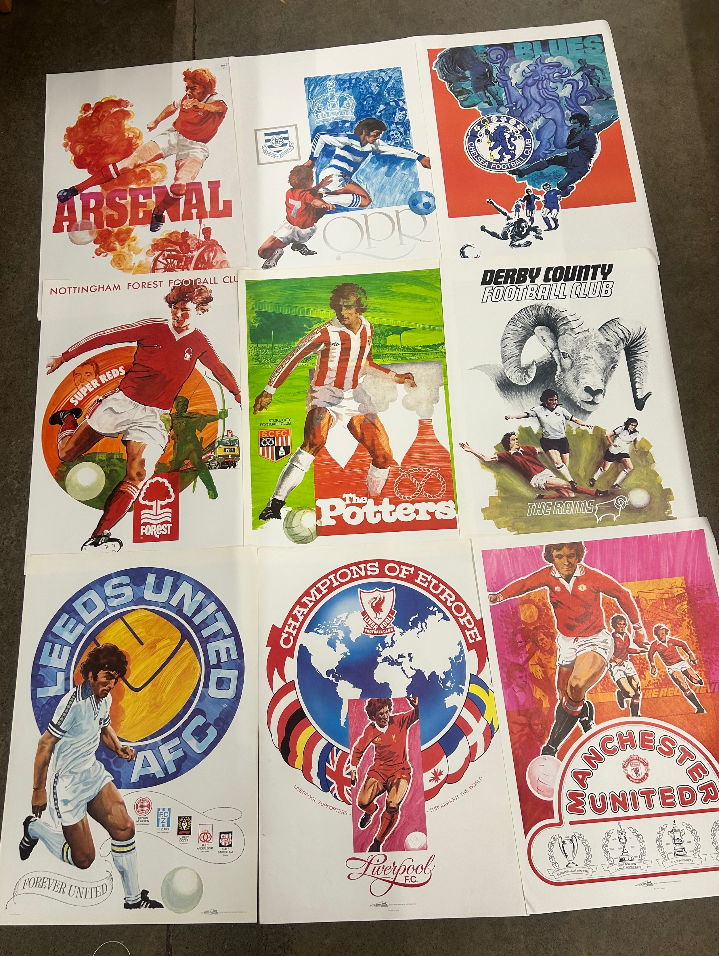 Complete set of nine original vintage Football Club posters printed in the 1980s by Activity Promotions of Nottingham; include Nottingham Forest, Derby F.C., Chelsea, Stoke, QPR, Arsenal, Leeds, Manchester Utd and Liverpool F.C. - Champions of Europe (A2 size), also includes David Beckham poster with facsimile signature