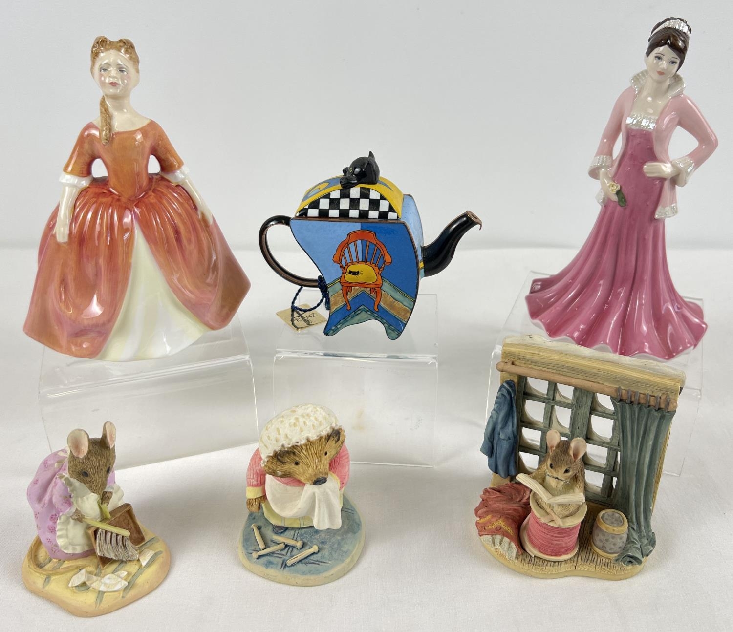 A small collection of ceramics and collectable ornaments. Coalport Heart to Heart 'Love you always' figurine, Royal Doulton 'Debbie' (HN2400), 3 resin The World of Beatrix Potter figures and a Franz limited edition enamel teapot.