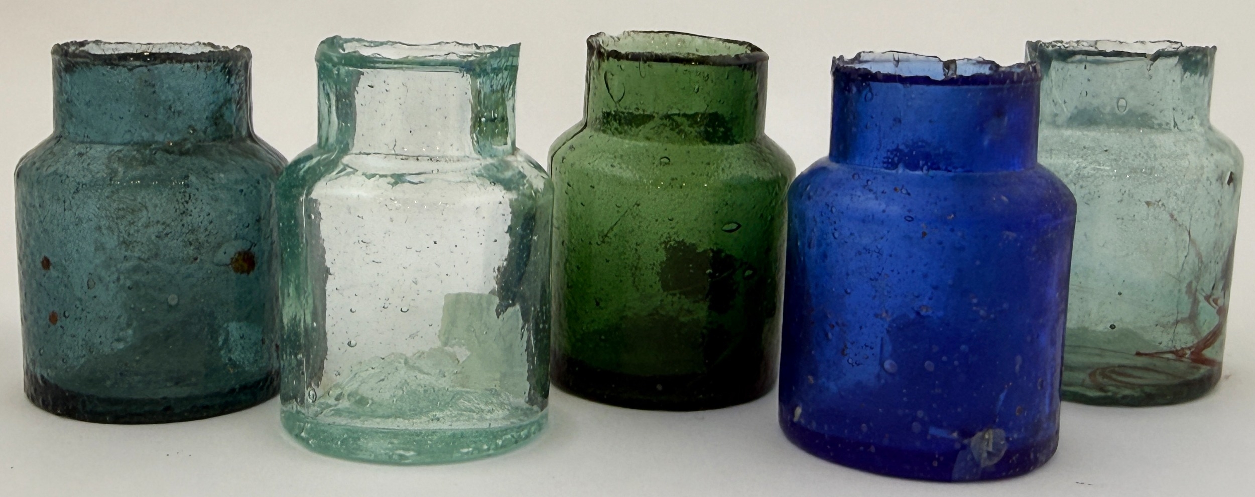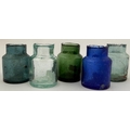 RAT POISON BOTTLE GROUP. Tallest 2ins. Various coloured glass - rat pict to base. Slight nicks/ body ding. (5)