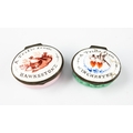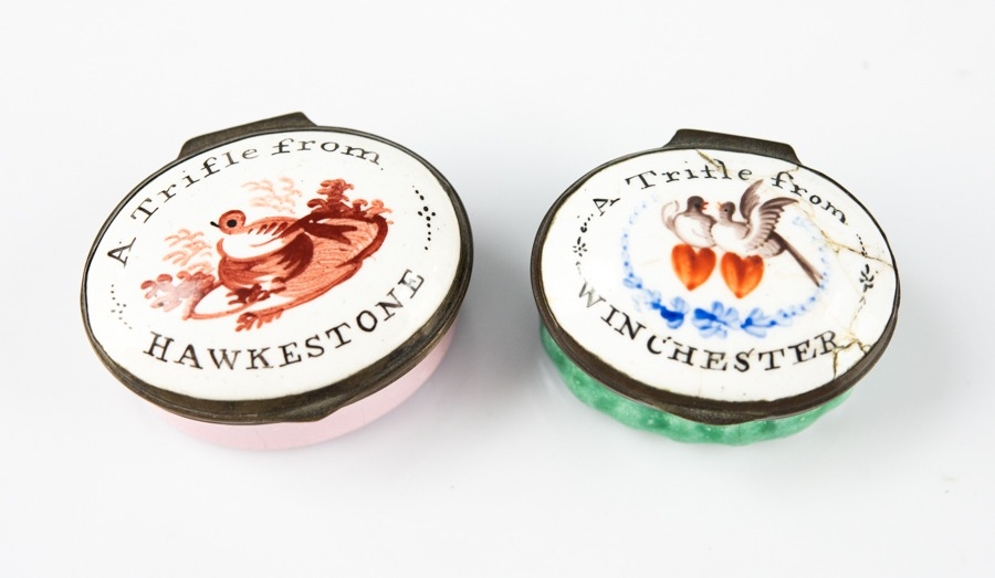18TH CENTURY OVAL ENAMEL PATCH BOX inscribed "A Trifle from Hawkstone" painted in a dusky pink to the centre with a bird on nest, mirror good, and a pink base, 1¾" wide (4.5cm); and ANOTHER SIMILAR "A Trifle from Winchester" painted with love birds and hearts (cracks and restored) on lobated green base, mirror good (2)