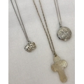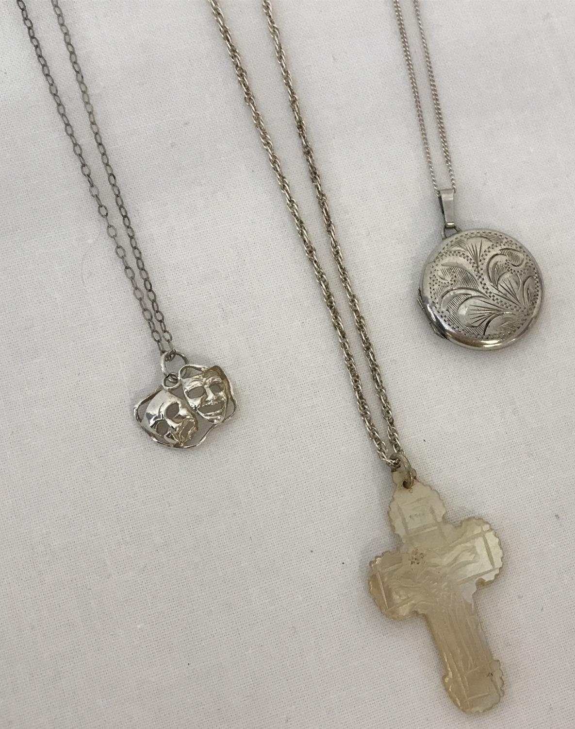 3 decorative silver necklaces. Comprising: a carved mother of pearl cross on a fine rope chain, a round locket with engraved detail to front on a fine curb chain and a Comedy & Tragedy mask pendant on a fine belcher chain.