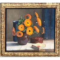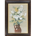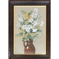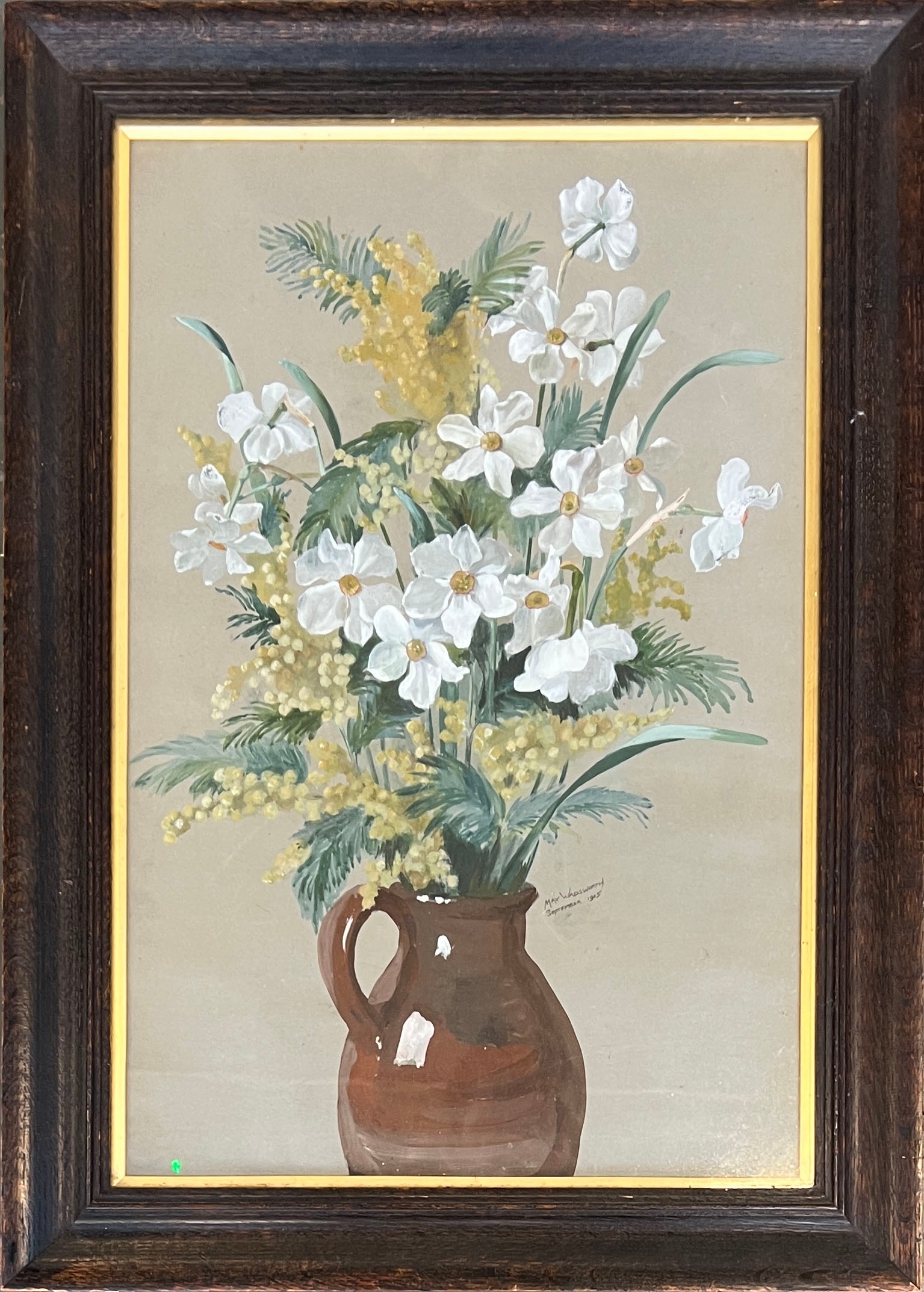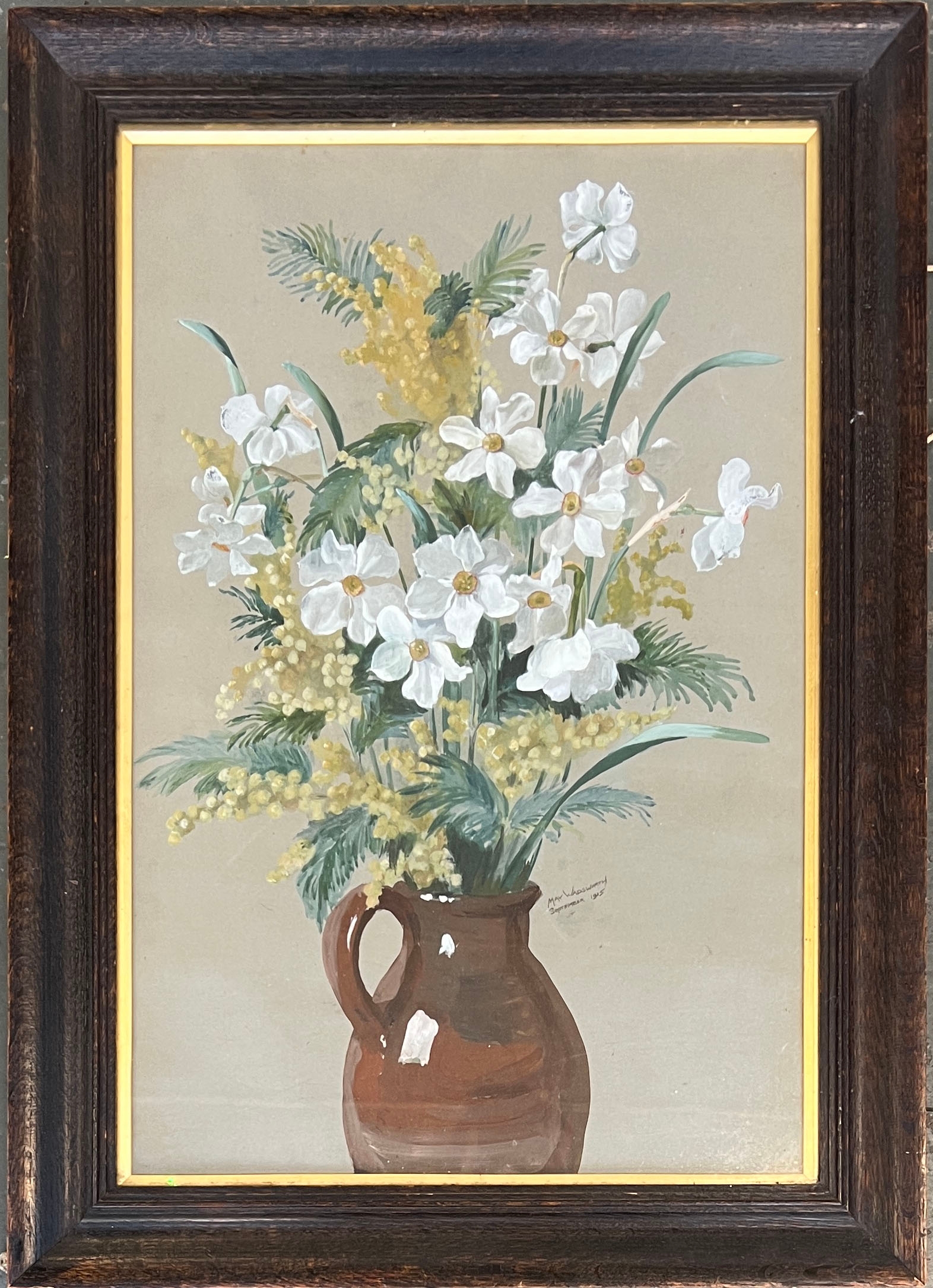 An early 20th century gouache on paper, white flowers in a stoneware jug, signed Max Wadsworth and dated September 1918, 52x34cm