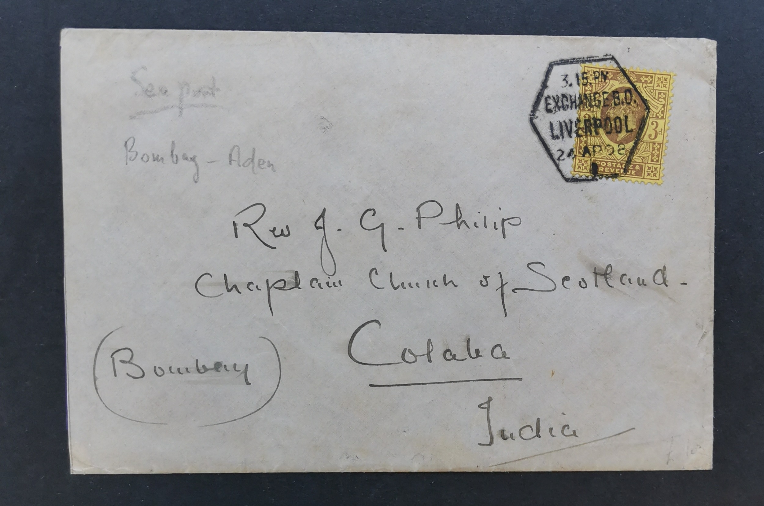 KE VII. 24/4/02 cover to India bearing 3d tied with sexagonal Exchange B.O. Liverpool cancel. Bombay - Aden Sea Post Office cds on reverse. (1 cover)