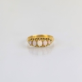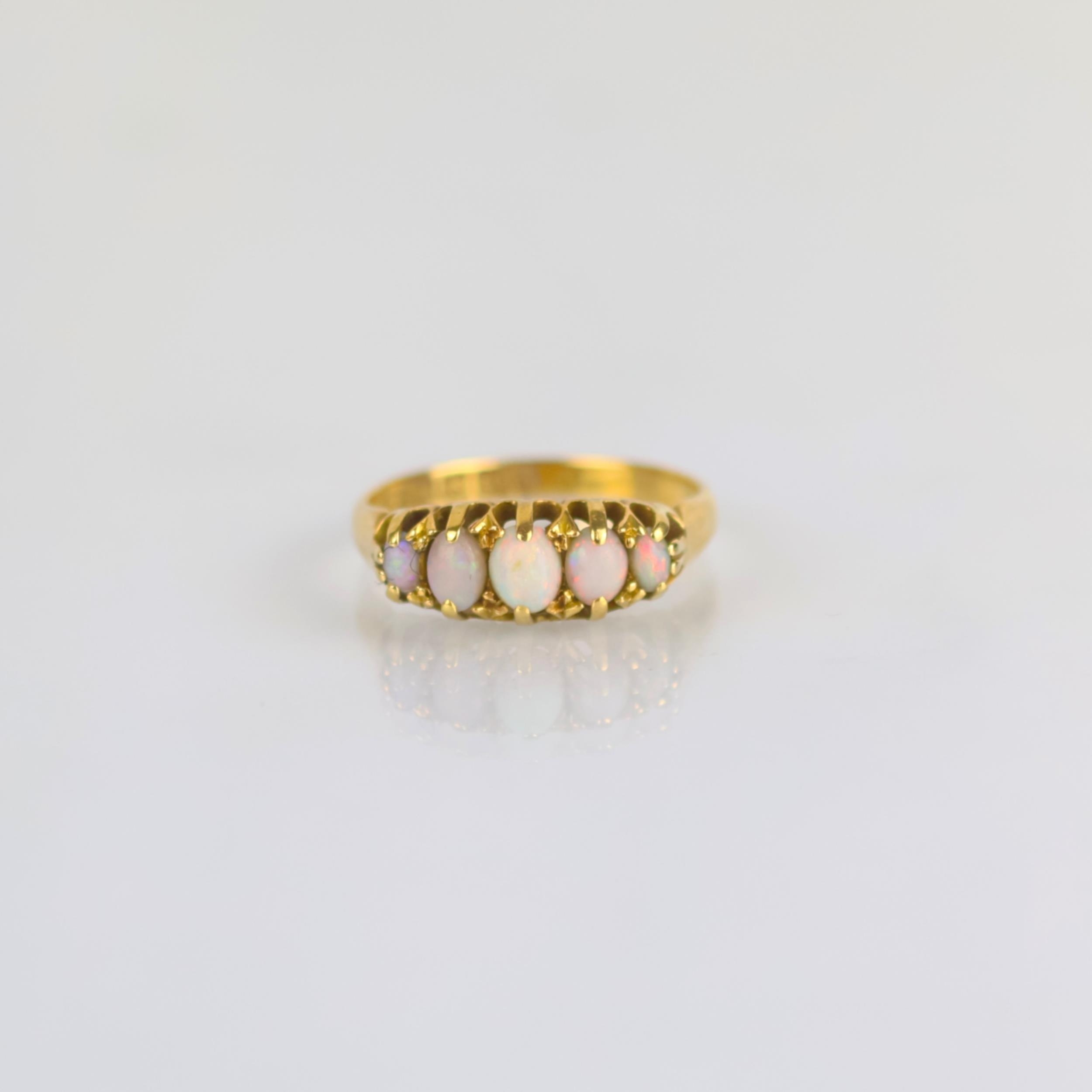 An early 20th century opal five stone ring, the five graduated oval opal cabochons within claw setting edge leading to plain polished 18ct yellow gold shank, stamped to interior for Birmingham 1924, ring size L, 2.3gms