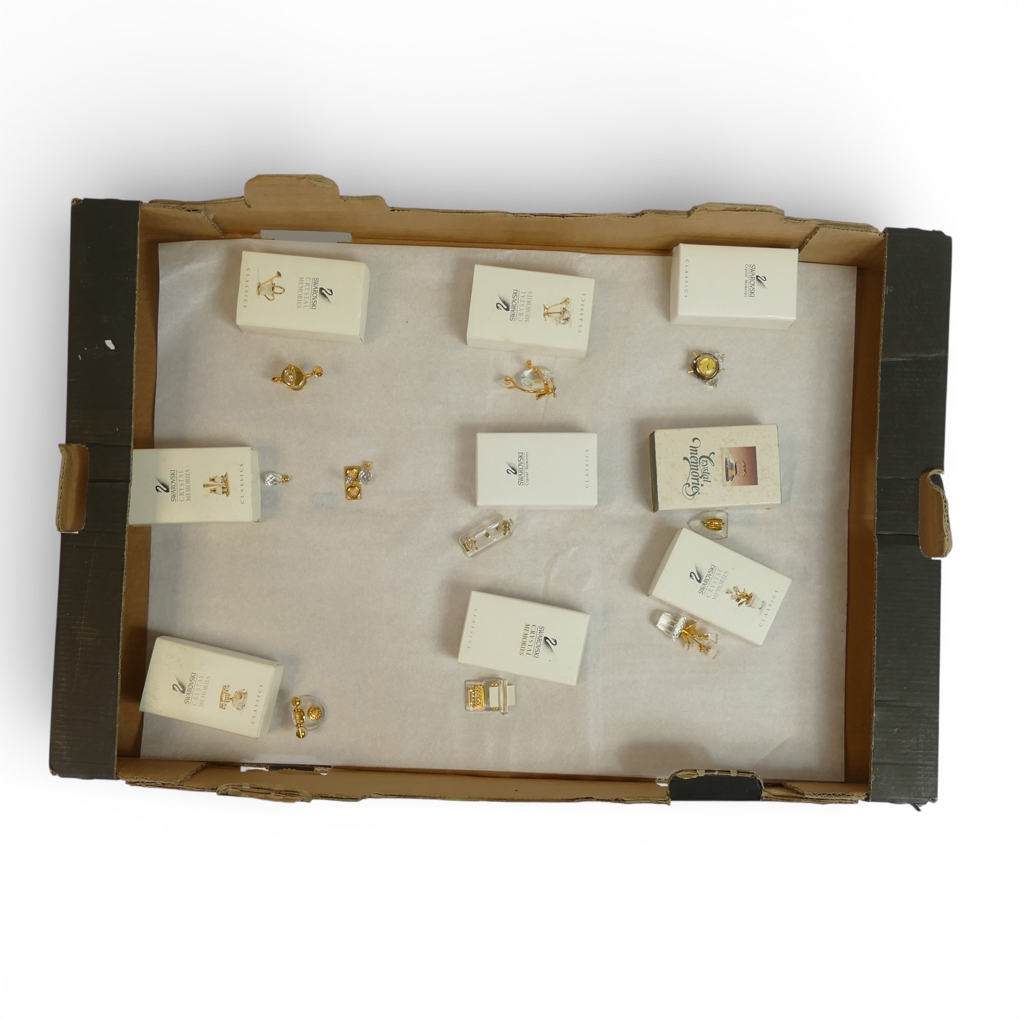 Swarovski Crystal Memories Classic Collection to include:- Alarm Clock (219192), Iron (168676), Flower Pot (208885), Typewriter (208886), Sewing Machine (235901), Penny Farthing Bicycle (180578), Watering Can (170848), Salt & Pepper Set (180512), Telephone (180408), (9pieces) All Boxed (1Tray)
