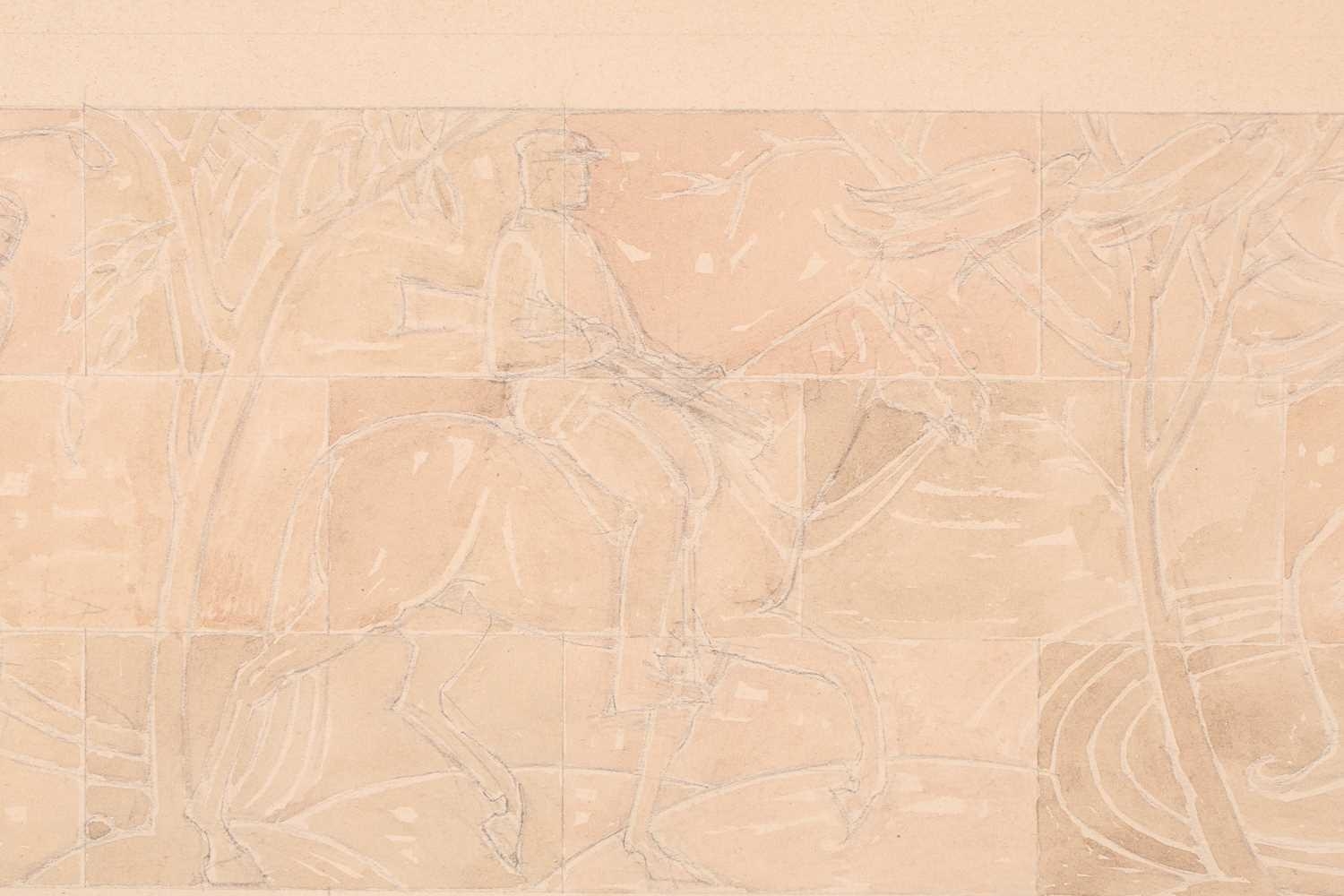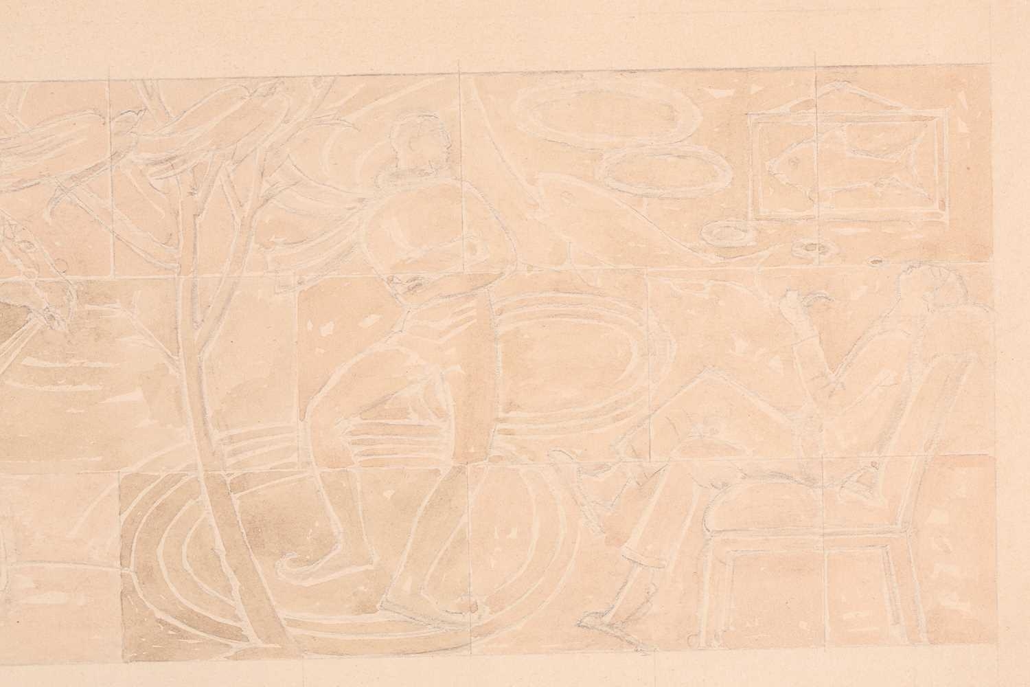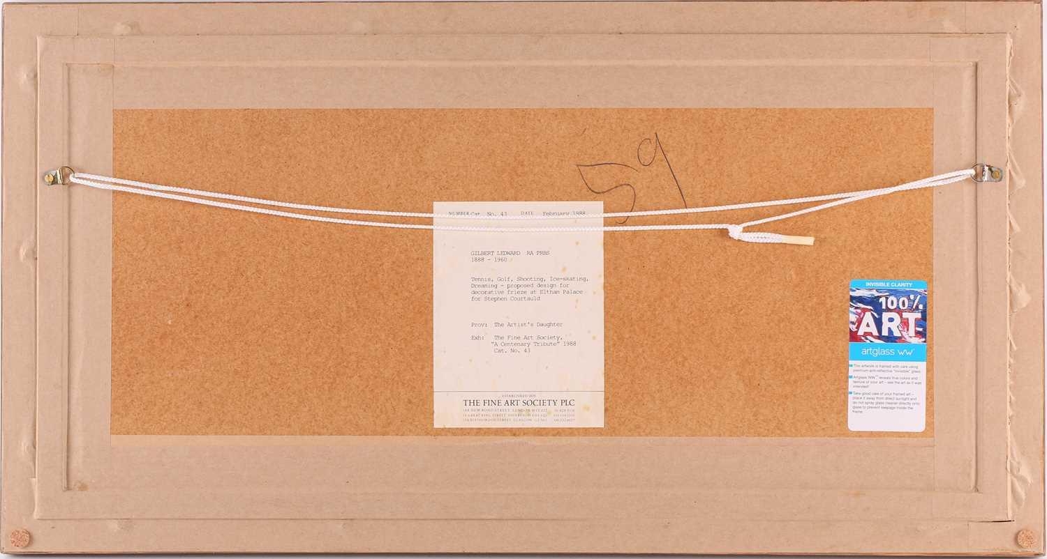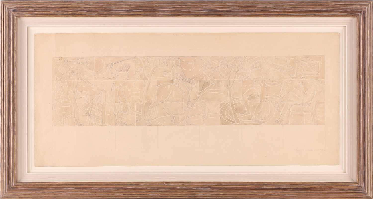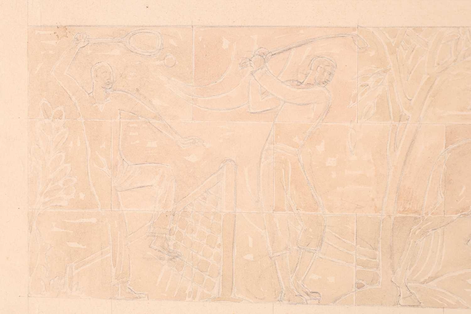 † Gilbert Ledward (1888-1960), 'Tennis, Golf, Shooting, Ice Skating, Dreaming', a proposed design for a decorative frieze at Eltham Palace, for Stephen Courtauld, pencil and watercolour on paper, signed and dated 1933, 24 cm x 55.5 cm framed and glazed.