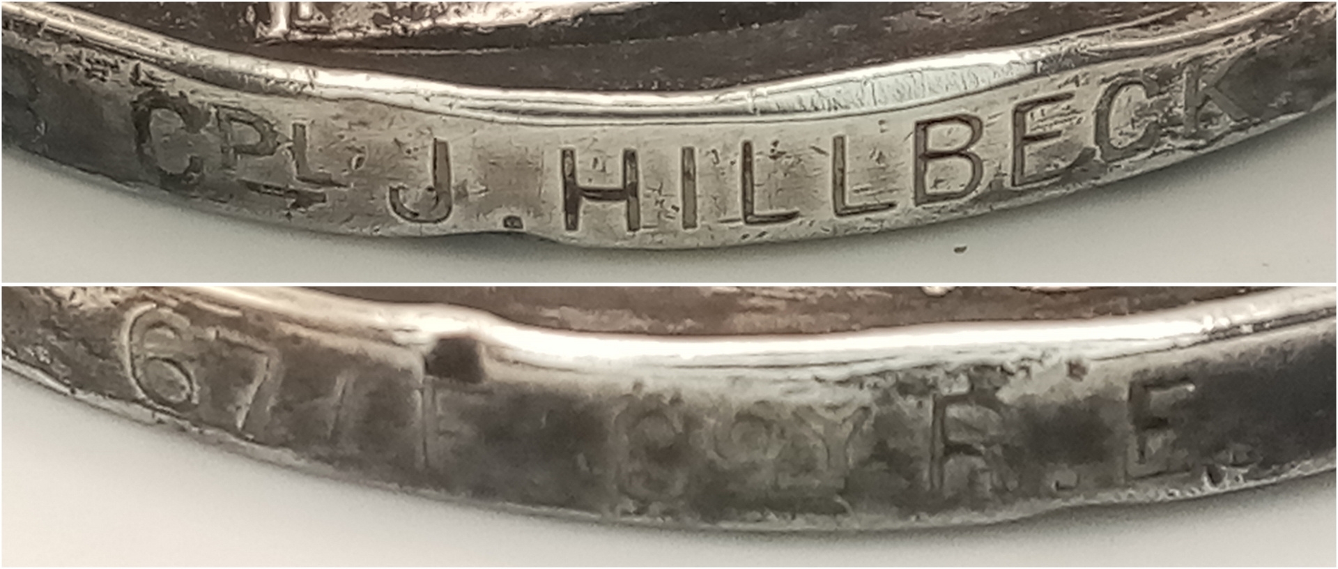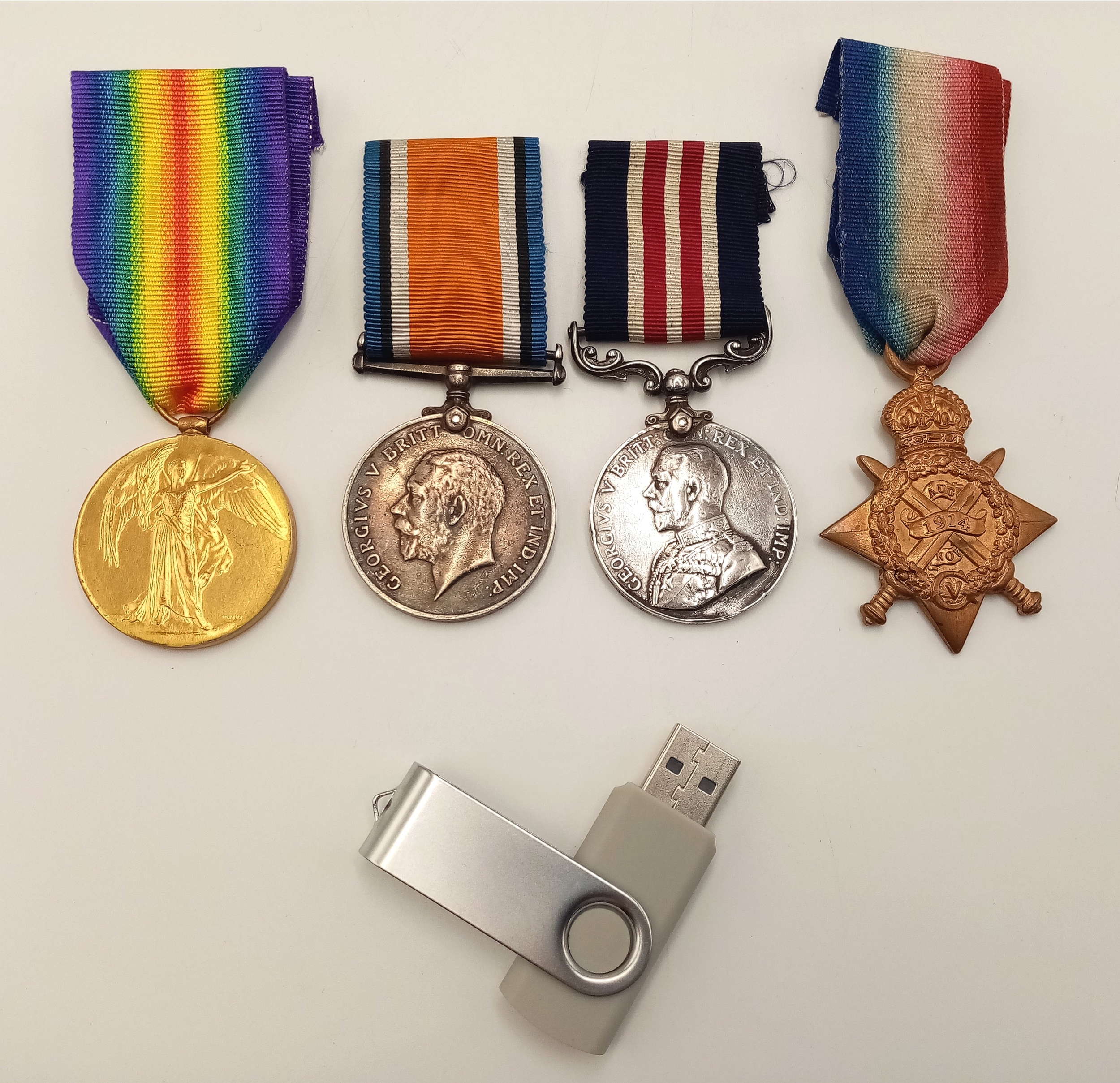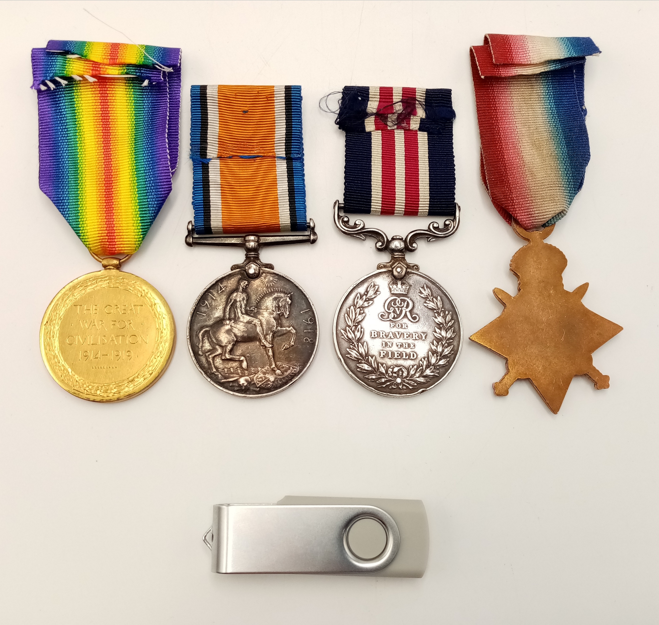World War One Original Silver Military Medal and British War Medal awarded to 84028 Corporal James Hillbeck 67th Field Company Royal Engineers. Awarded for action above and beyond the call of duty at Poelcapelle on October 1917 as confirmed in the war diary for the 67th Field Company which confirms awarding him the Ribbon. The silver medals were originally sold as scrap when silver reached an all time high in 1920. But maybe the jeweller had a change of heart as they were never smelted. The 2 bronze medals are unnamed replacements to complete the display. There is lots of research including a copy of the War Diary on a USB memory stick that comes with the medals.