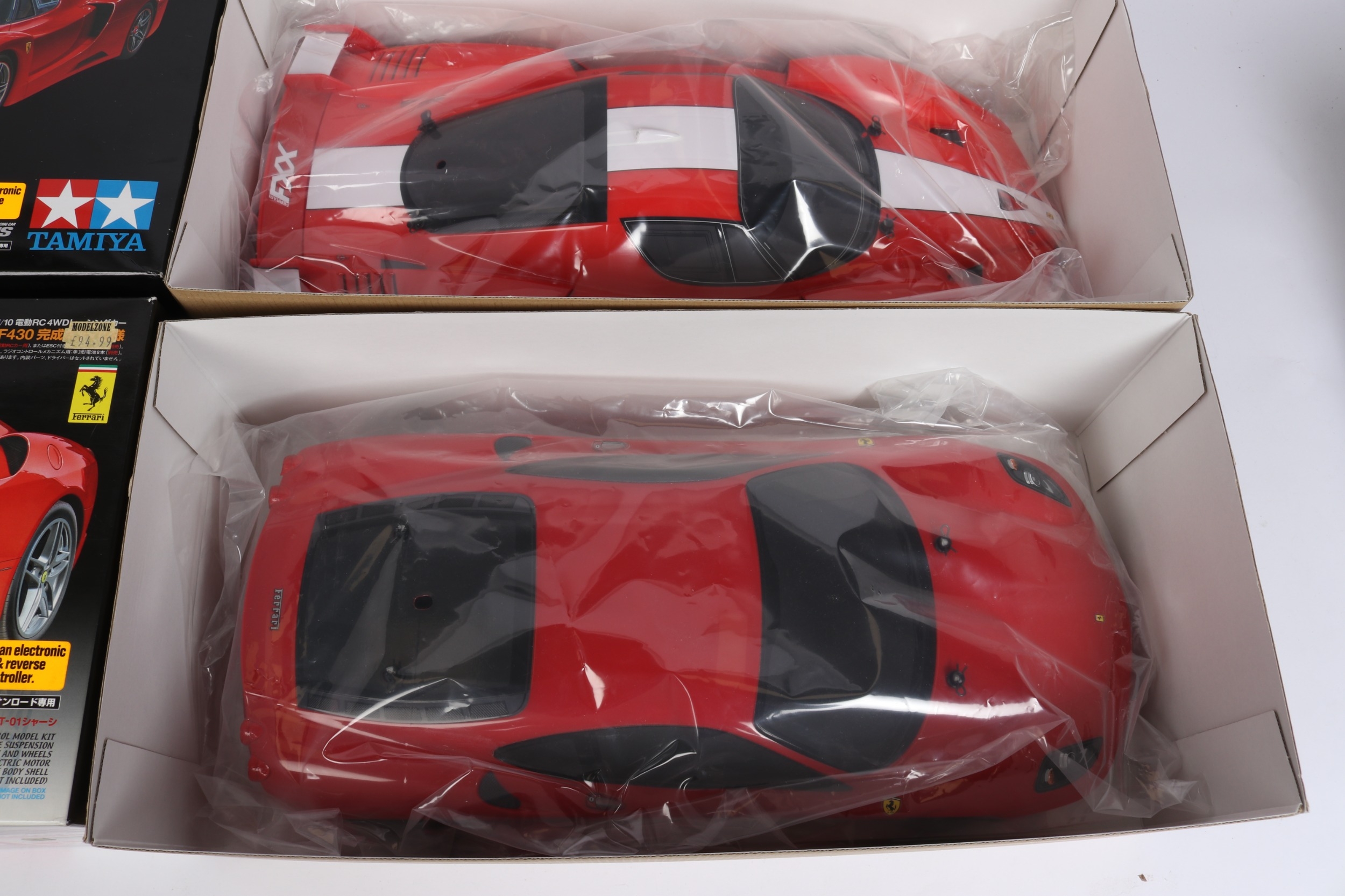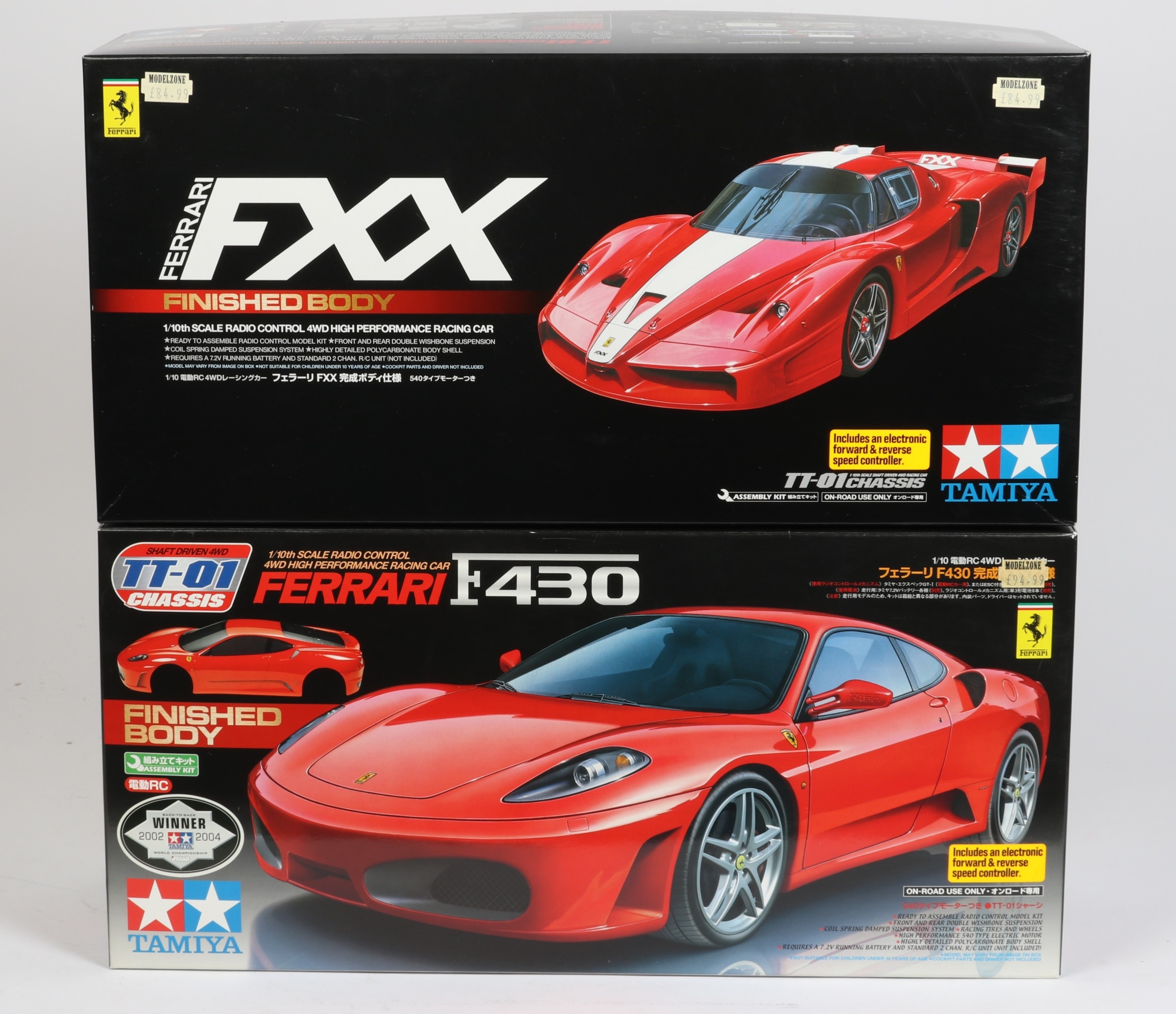 2 TAMIYA 1:10 scale Radio Controlled 'Finished Body' Cars. A Ferrari F430 and a Ferrari FXX. Both boxed, contents looks to be as new and complete, but this cannot be guaranteed, as there is no paperwork. £70-90