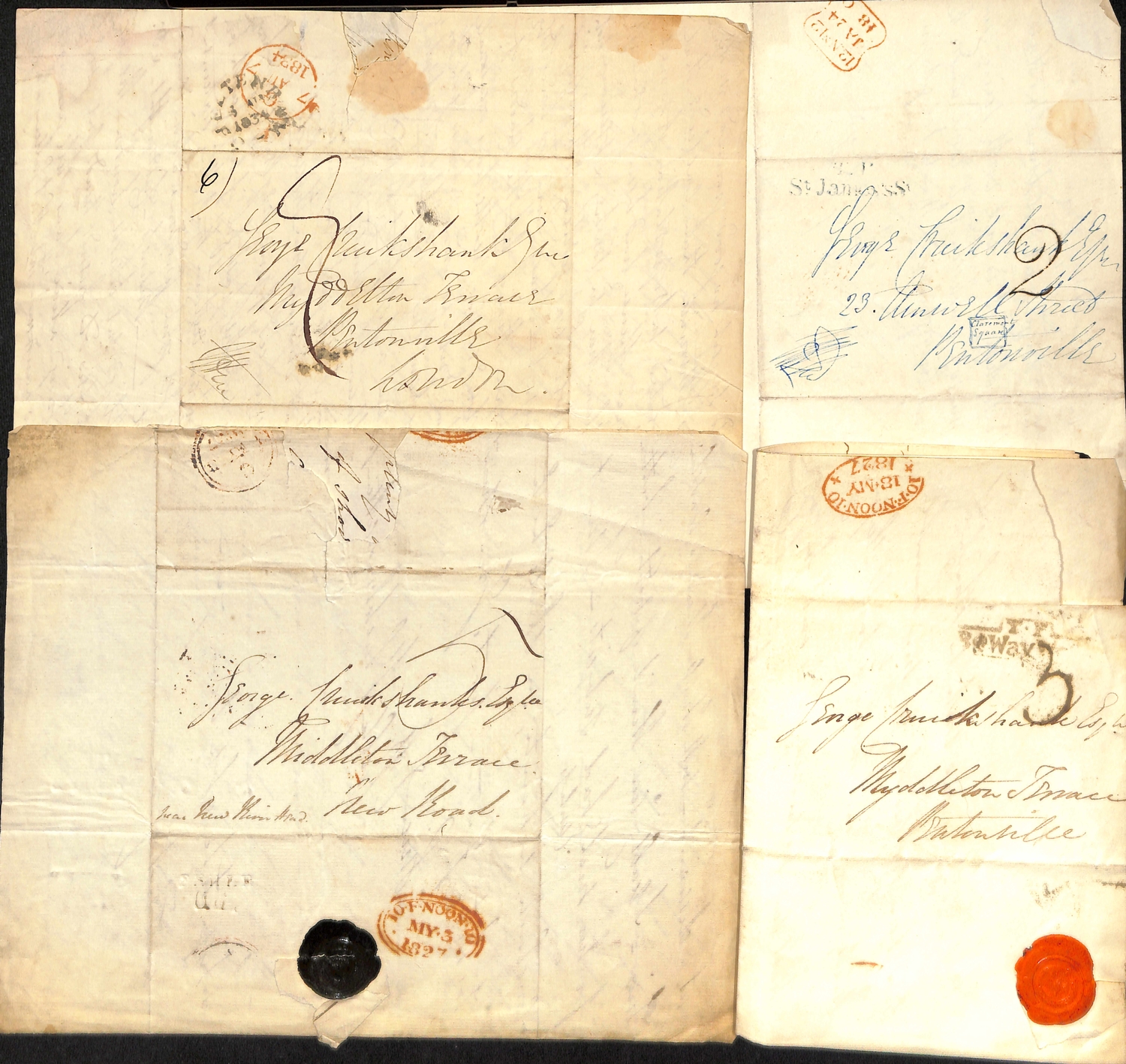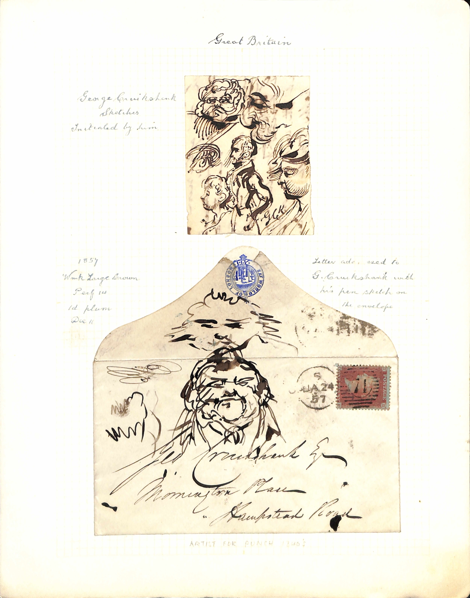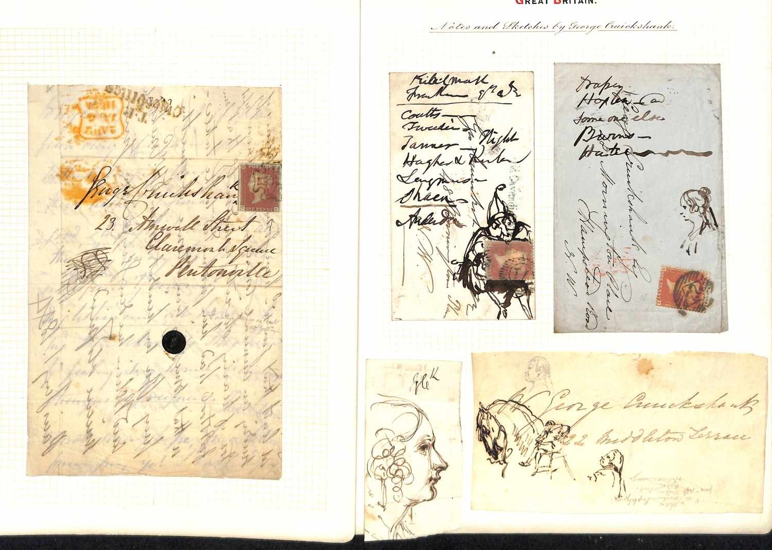 George Cruikshank, etc. 1827-57 Entire letters and covers addressed to the artist and caricaturist George Cruikshank (16), four with sketches drawn by Cruikshank, and further sketches on a small piece initialled "GCK". Also various other autographed letters and notes including artists and sculptors, Richard Tattersall, Benjamin, Leonard or Joseph Wyon, etc. (c.40).