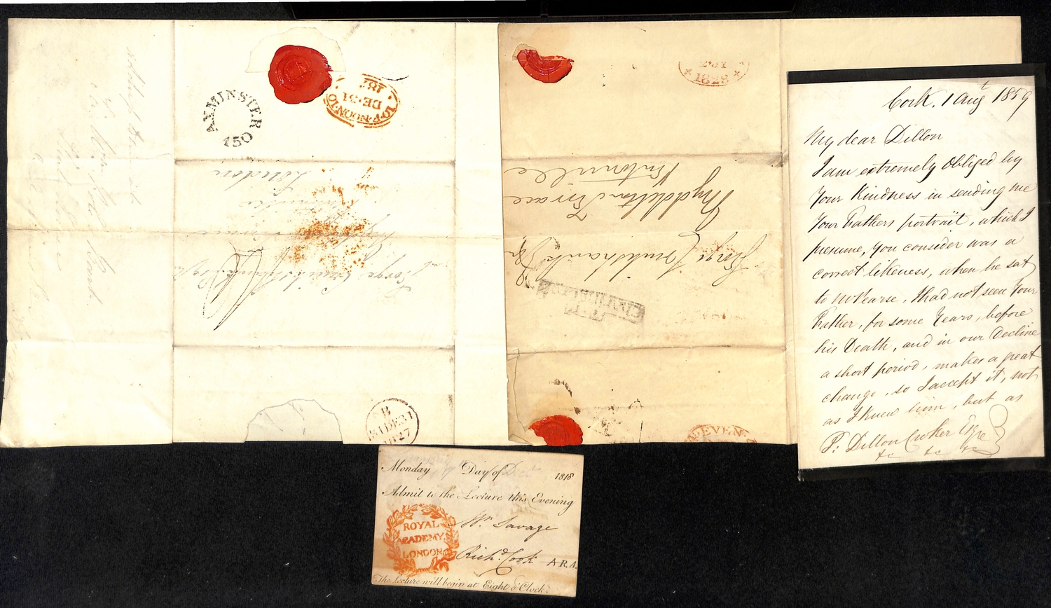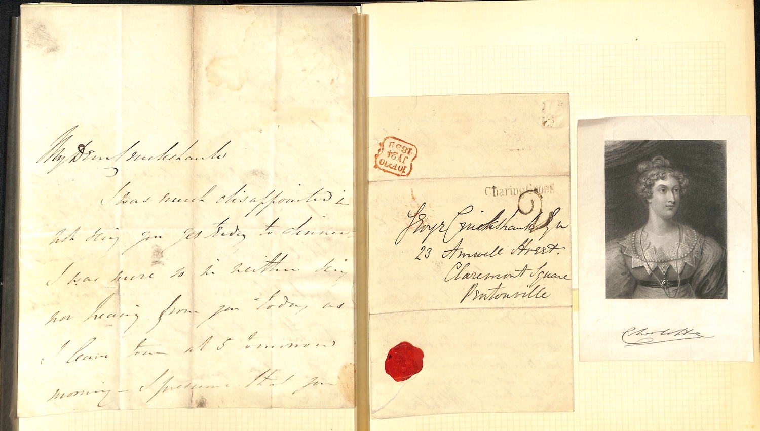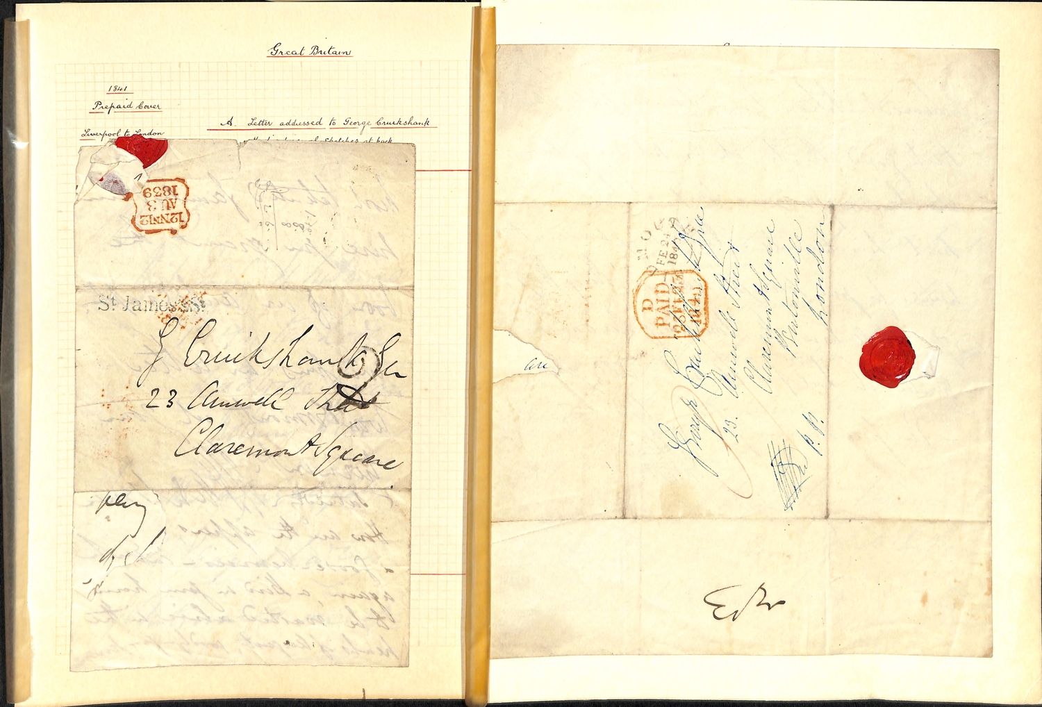George Cruikshank, etc. 1827-57 Entire letters and covers addressed to the artist and caricaturist George Cruikshank (16), four with sketches drawn by Cruikshank, and further sketches on a small piece initialled "GCK". Also various other autographed letters and notes including artists and sculptors, Richard Tattersall, Benjamin, Leonard or Joseph Wyon, etc. (c.40).