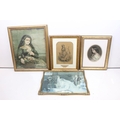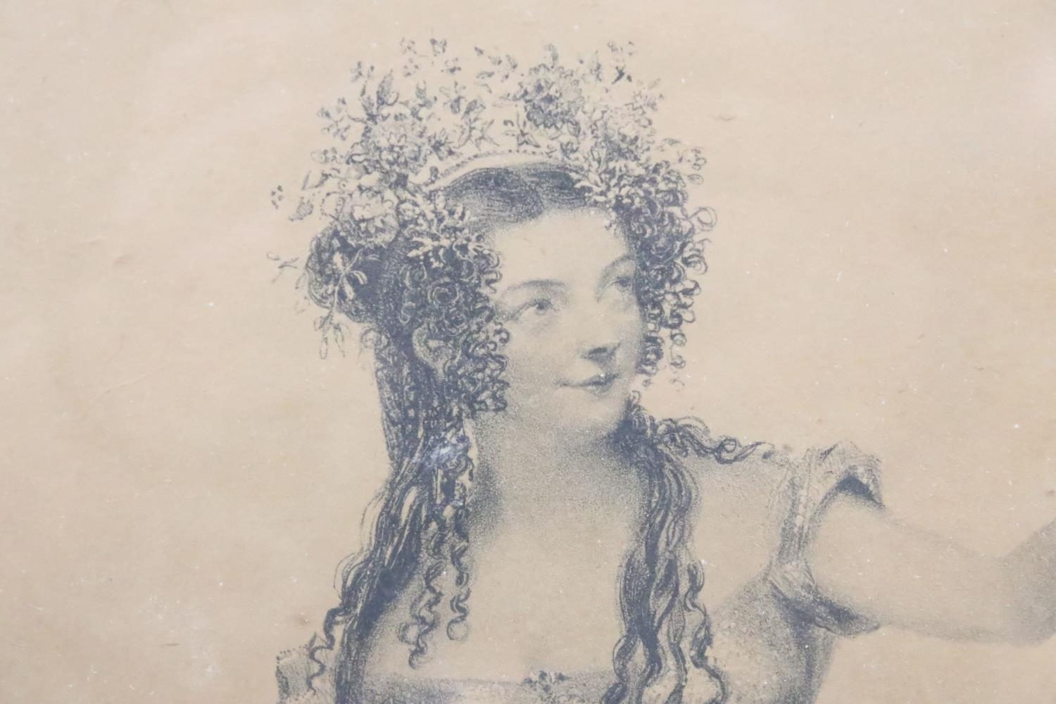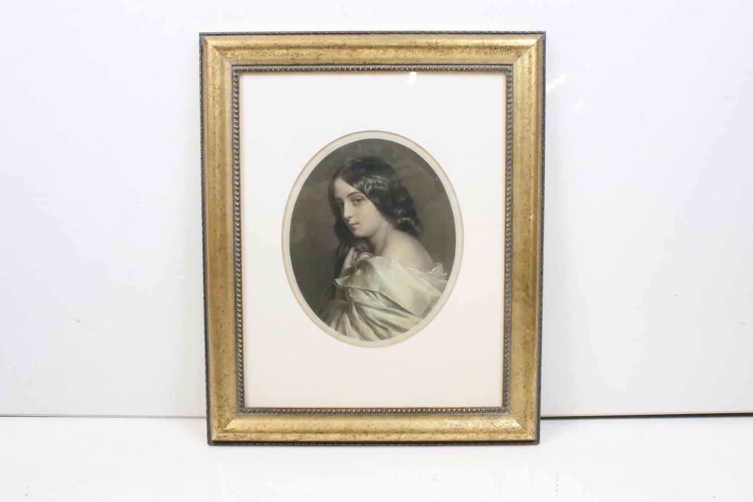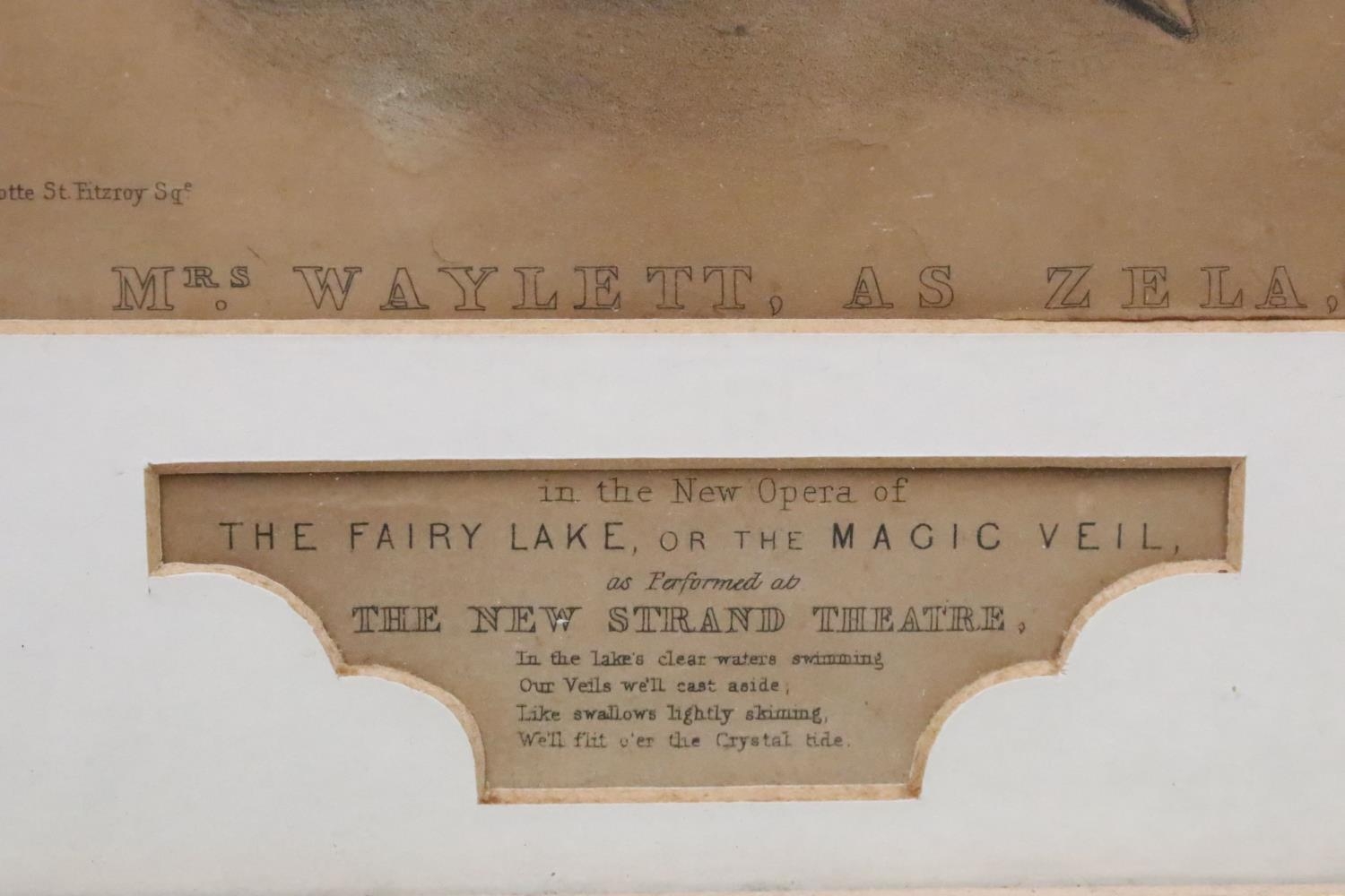 Hermann Winterhalter (1808- 1891), portrait of a girl, aquatint, 27.5 x 23cm, gilt framed, Mrs Waylett, As Zela, in the New Opera of The Fairy Lake, or the Magic Veil, as performed at The New Strand Theatre, print 33.5 x 24cm, gilt framed and two other prints, both framed and glazed