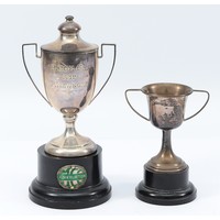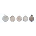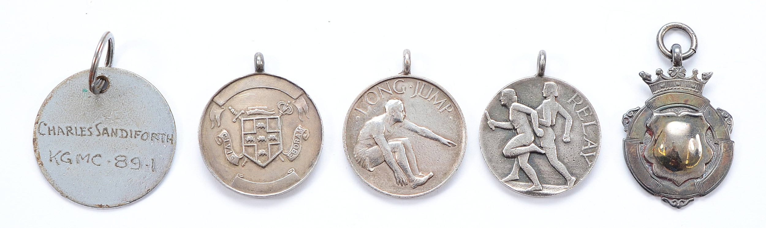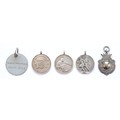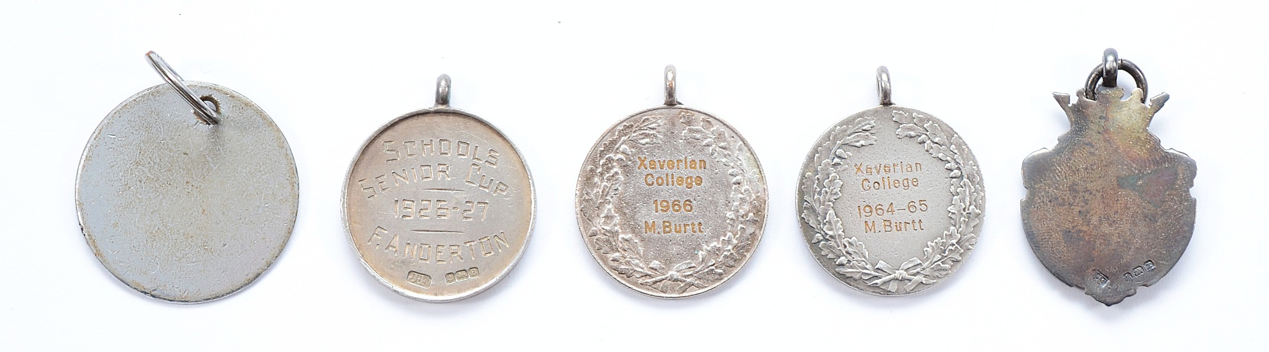 A silver watch fob, Birmingham 1949, 7.6g, a silver school medal, Birmingham 1926, 7.9g, with two metal college medals and a name tag