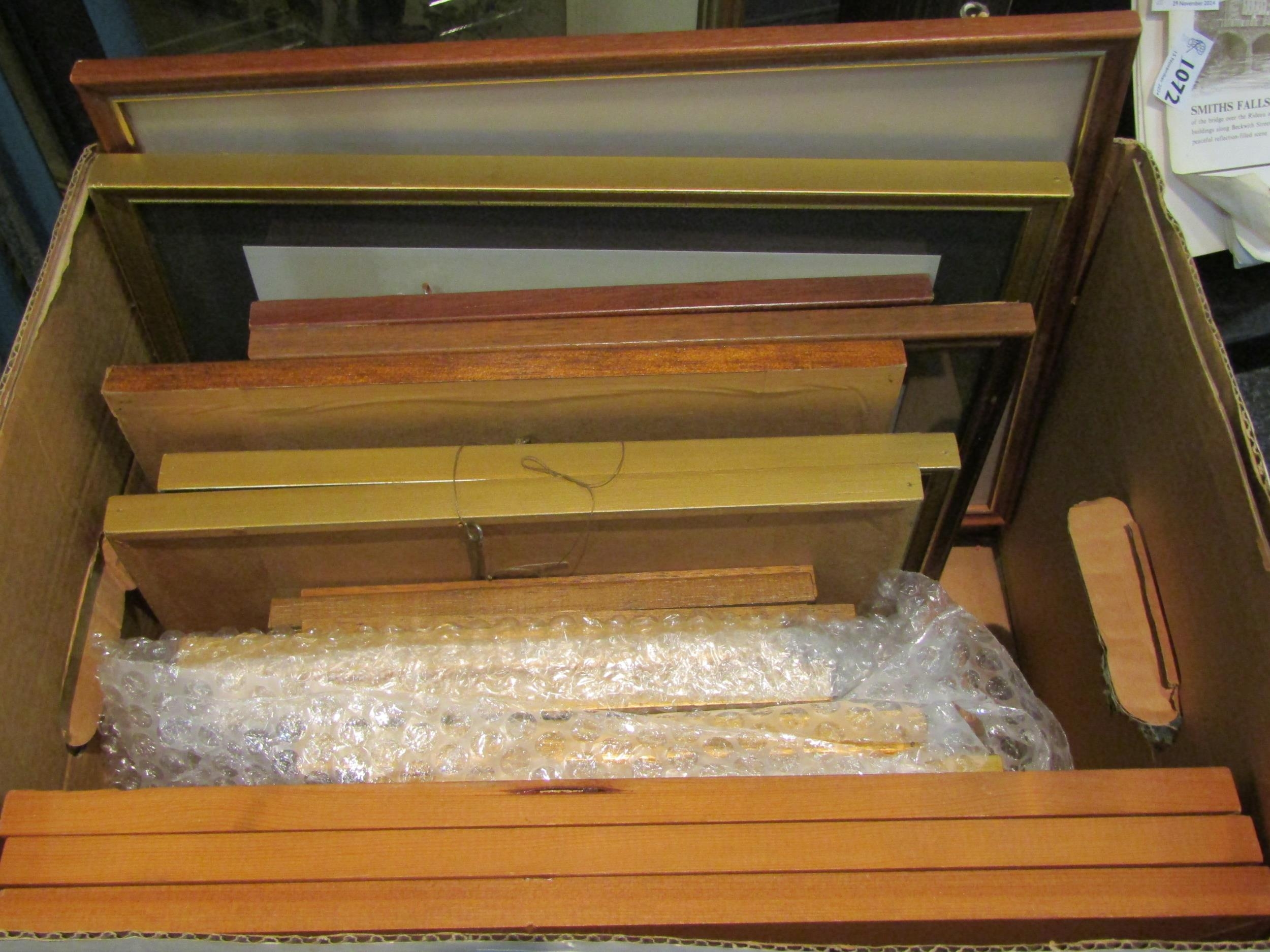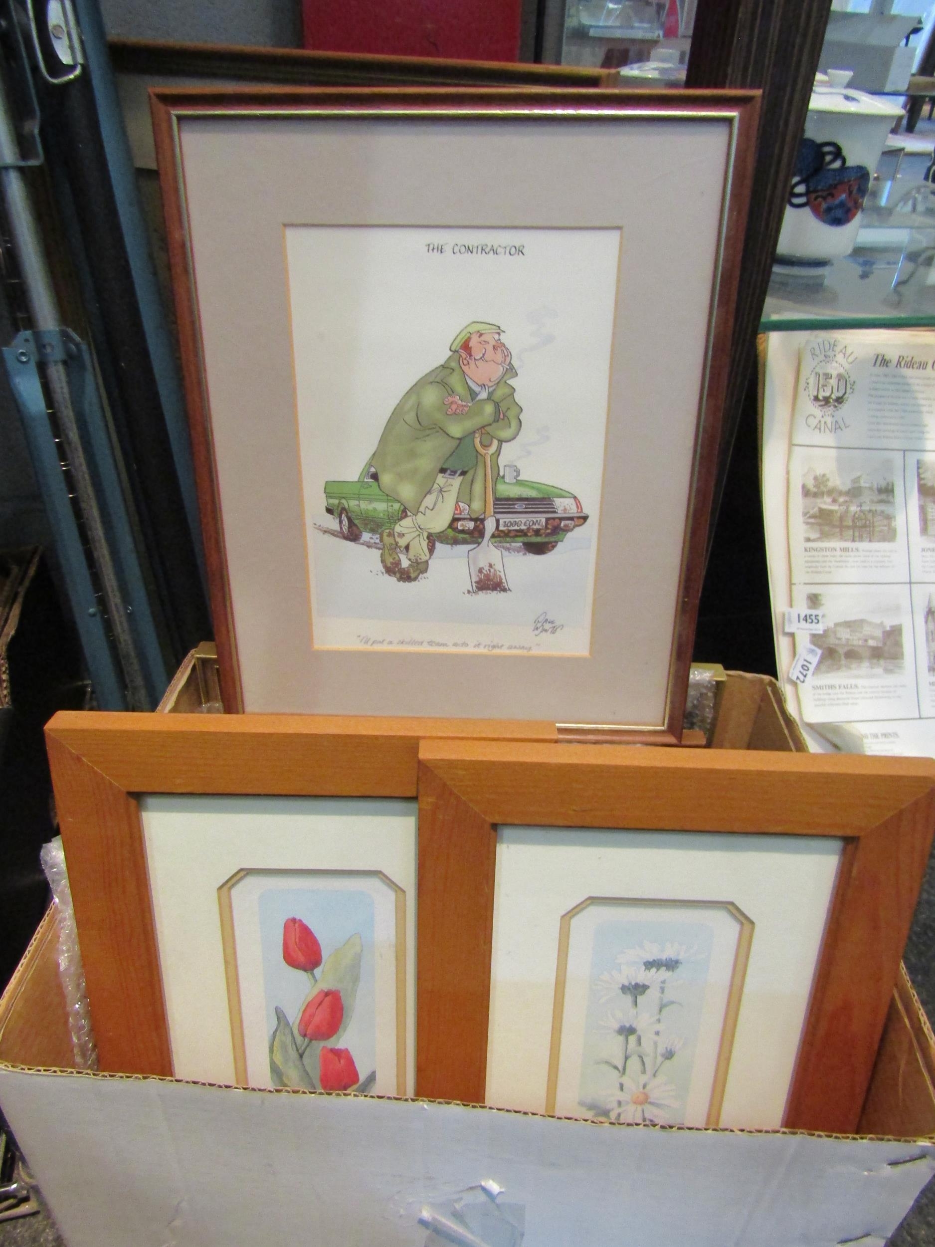 A box of pictures and prints including a set of floral prints