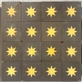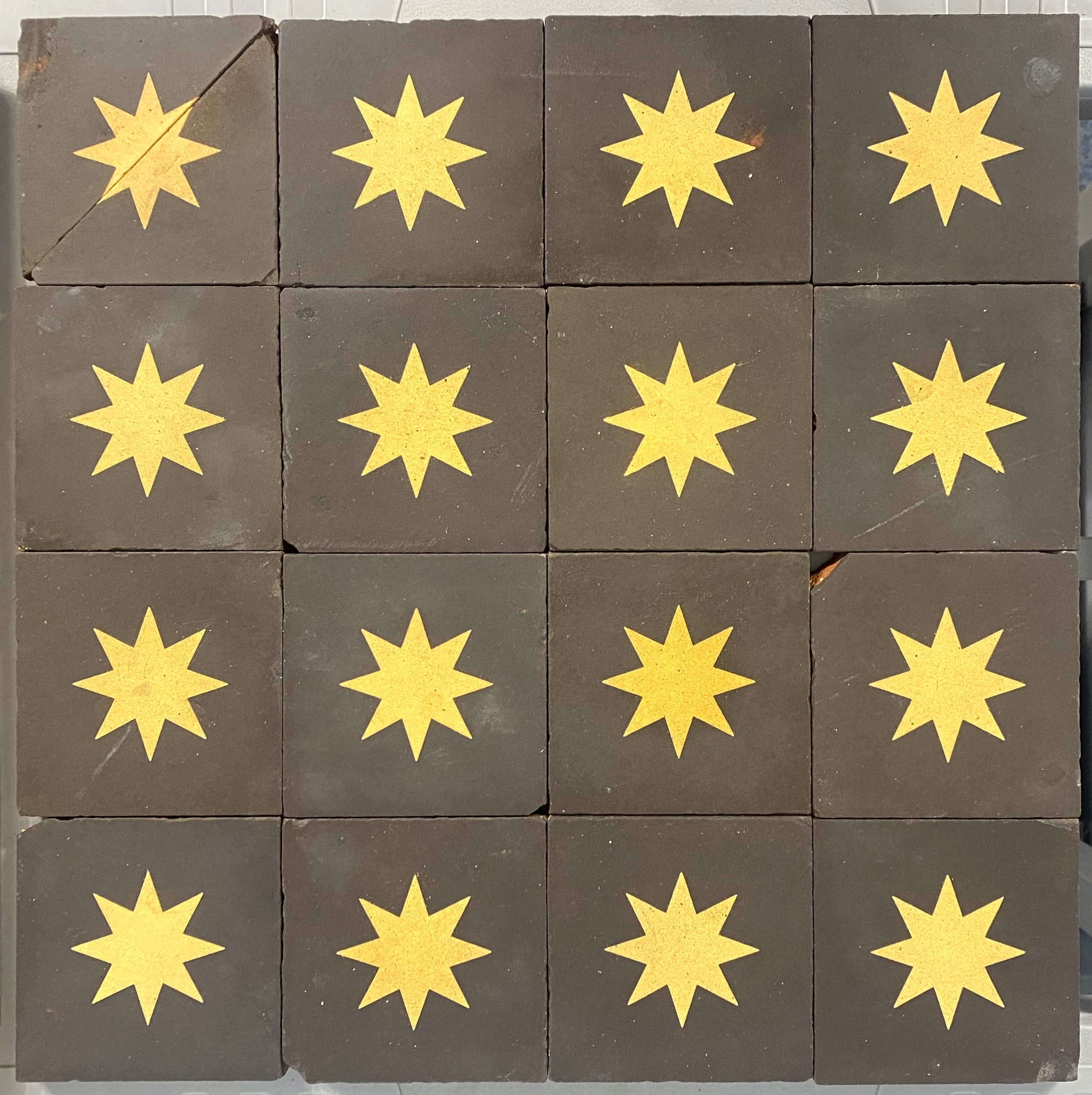 Sixteen Maw & Co encaustic tiles (one divided in half) decorated with buff star on dark brown-/black background 11cm by 11cm