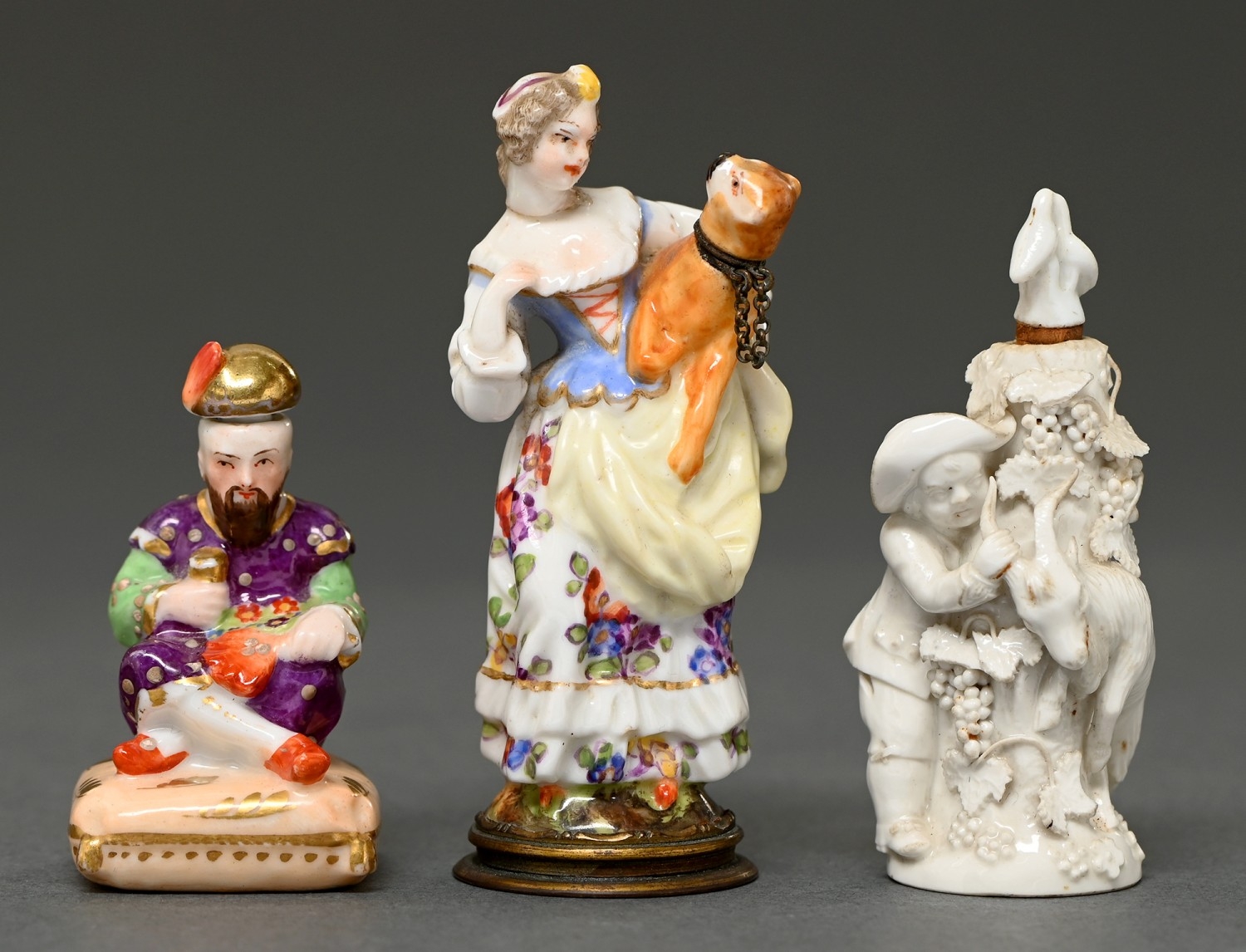 A Continental porcelain figural scent bottle, in the form of a lady and a pug dog, late 19th c, mounted on mirror inset brass foot, 85mm h, another in the form of a seated Turk and a white example of a boy and goat, each with stopper (3)