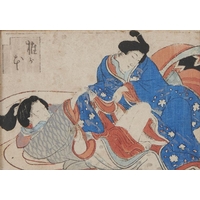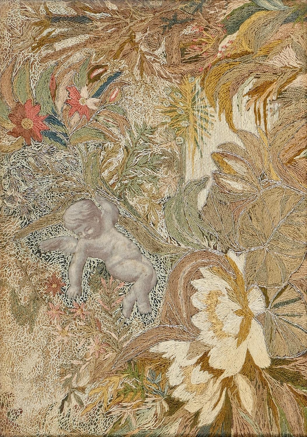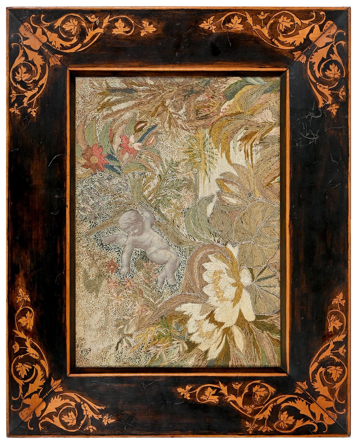 An embroidered silk picture, late 19th c, of a cherub, waterlilies and other flowers, worked in coloured silk and wool with silver metal thread in a variety of stitches, 20.5 x 29cm, stained pokerwork frame
