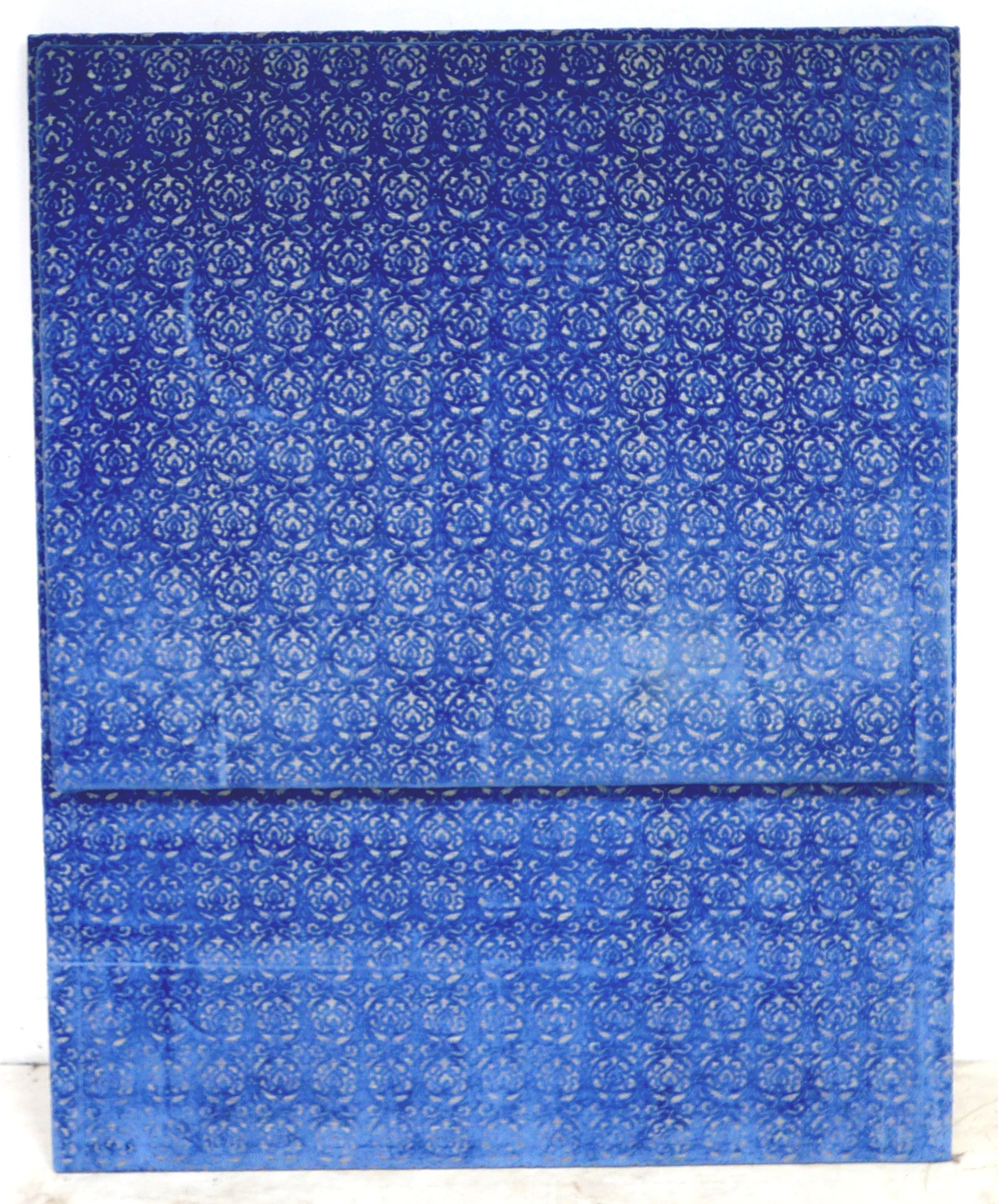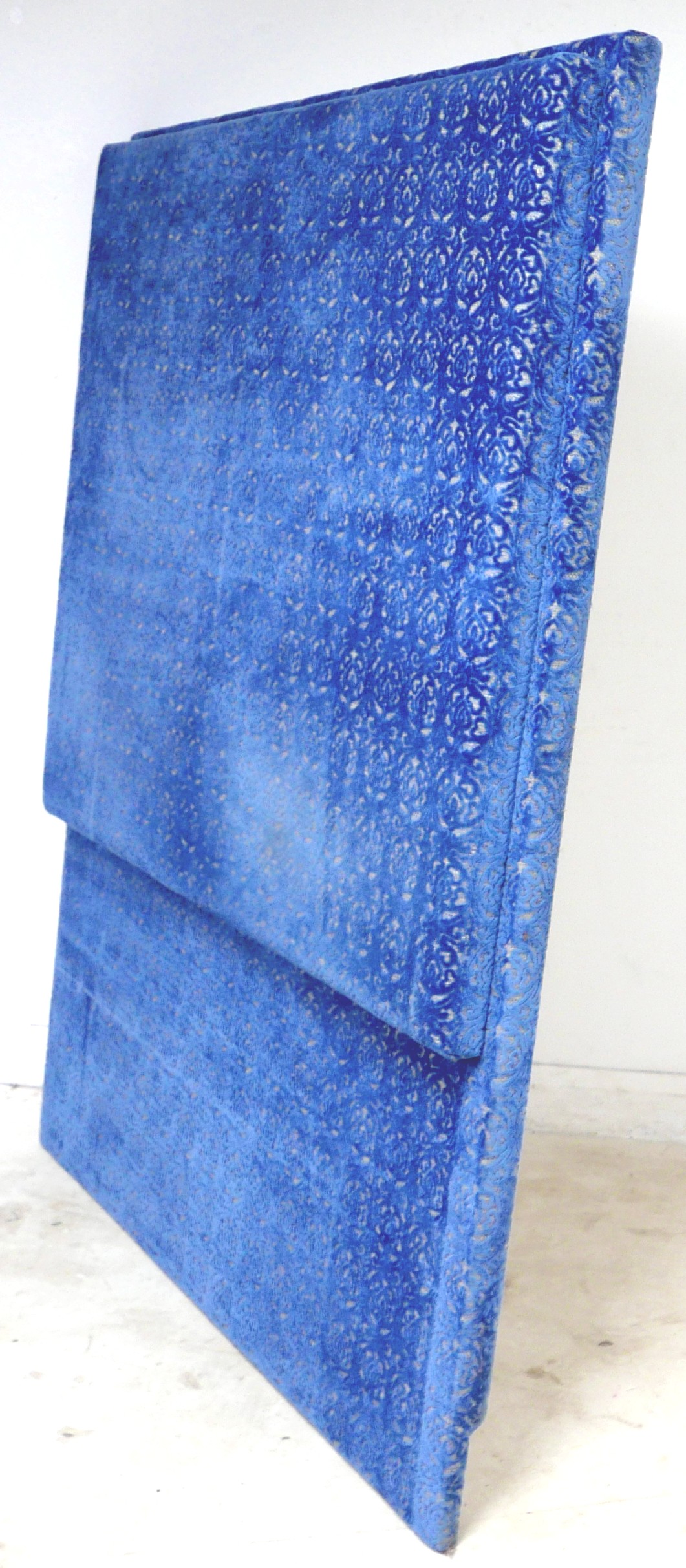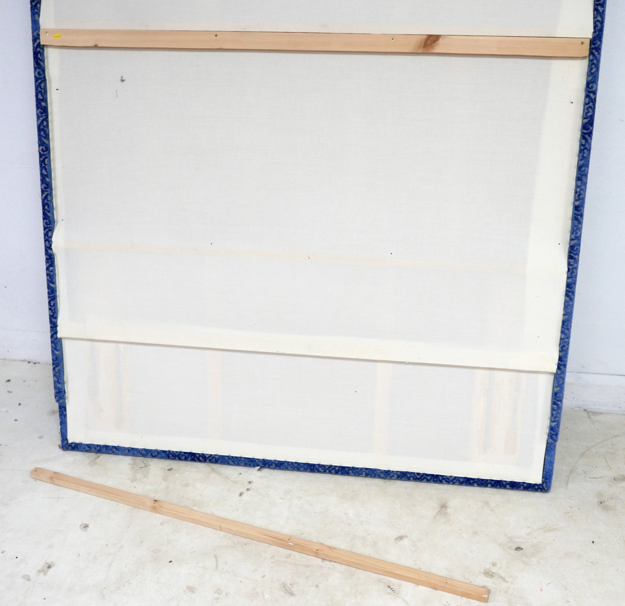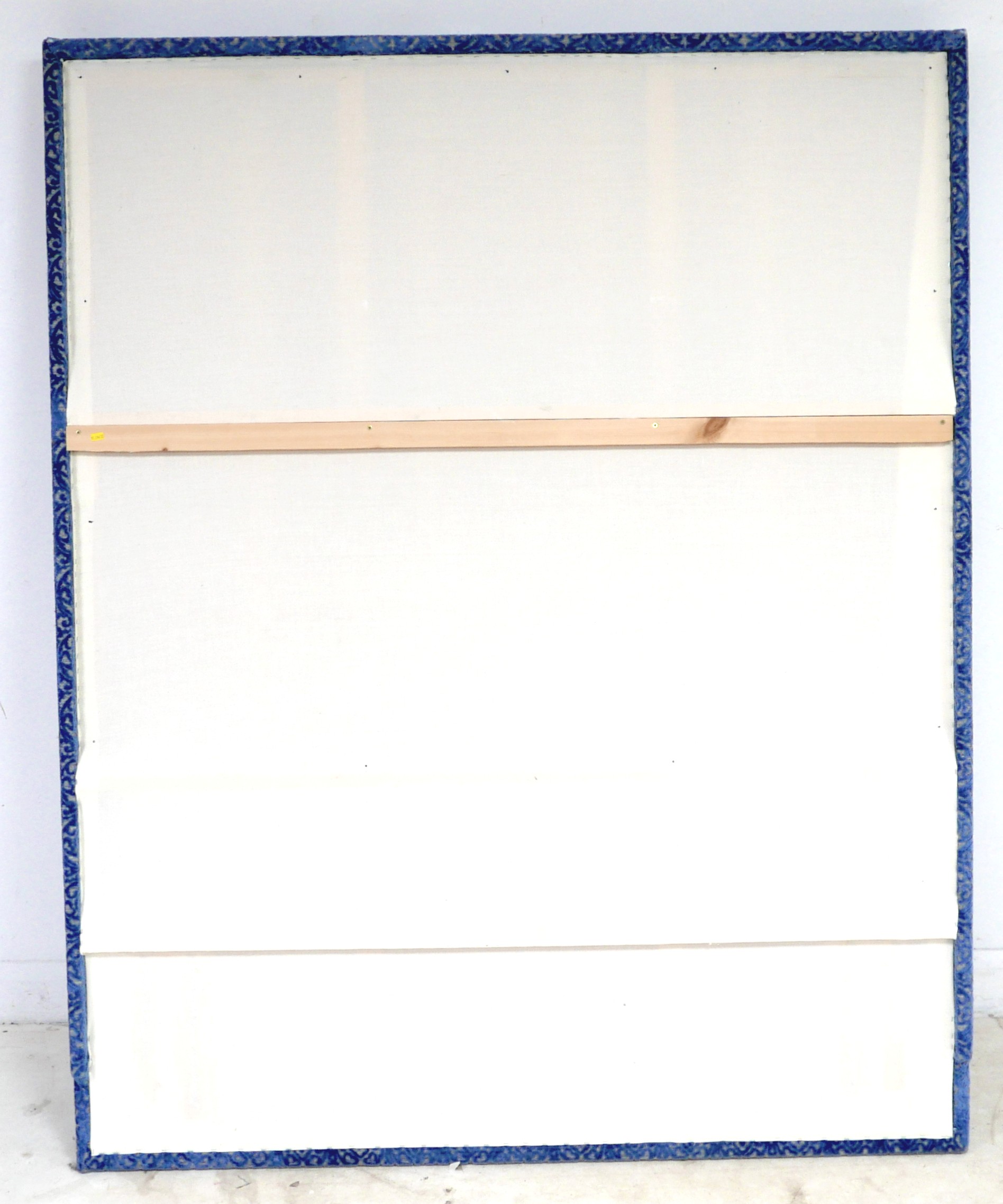 An oversized double headboard, upholstered in blue jacquard fabric, with conforming wooden baton (French cleat) fitting, 147 by 33 by 180cm high.
