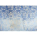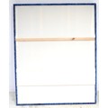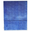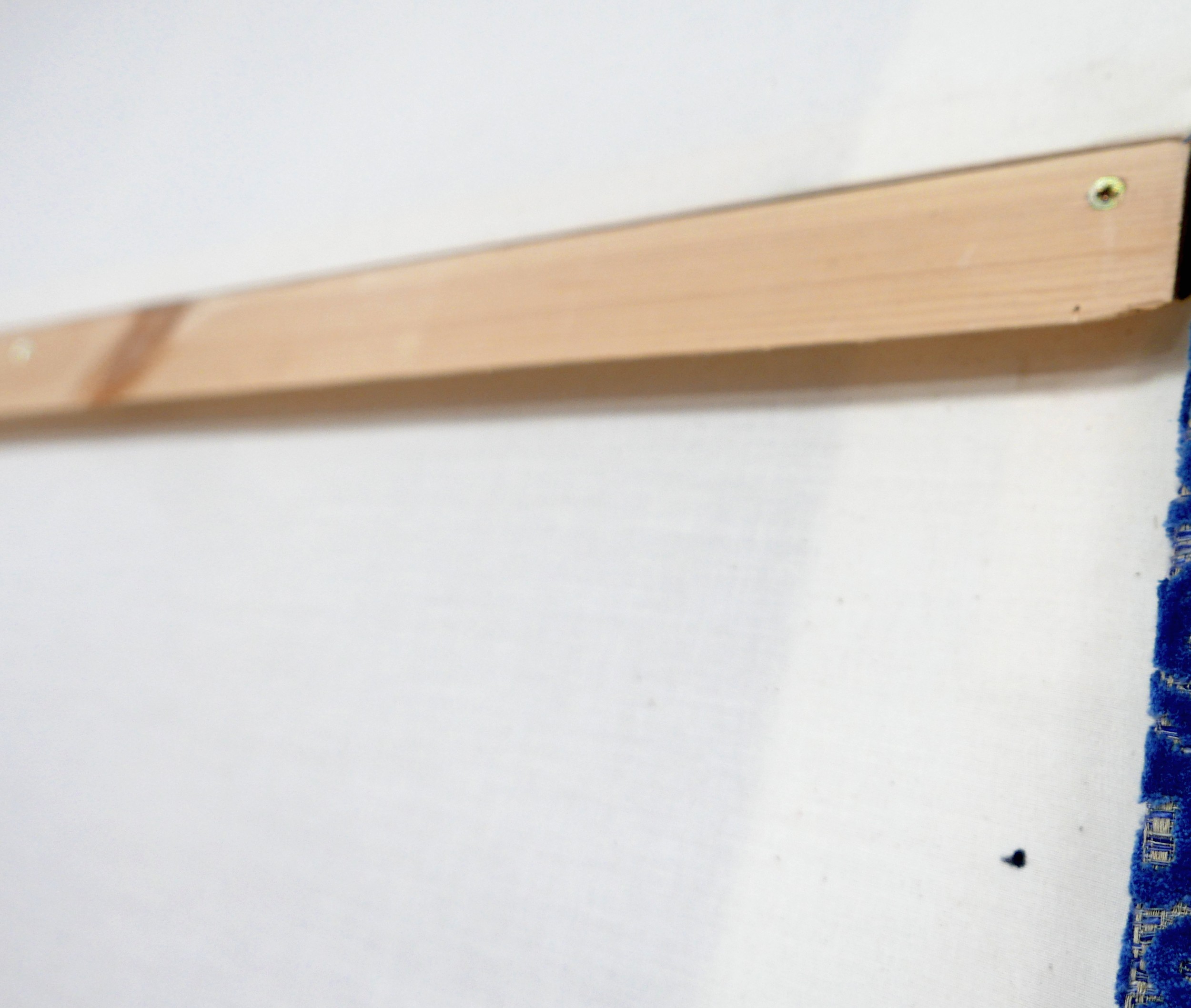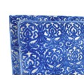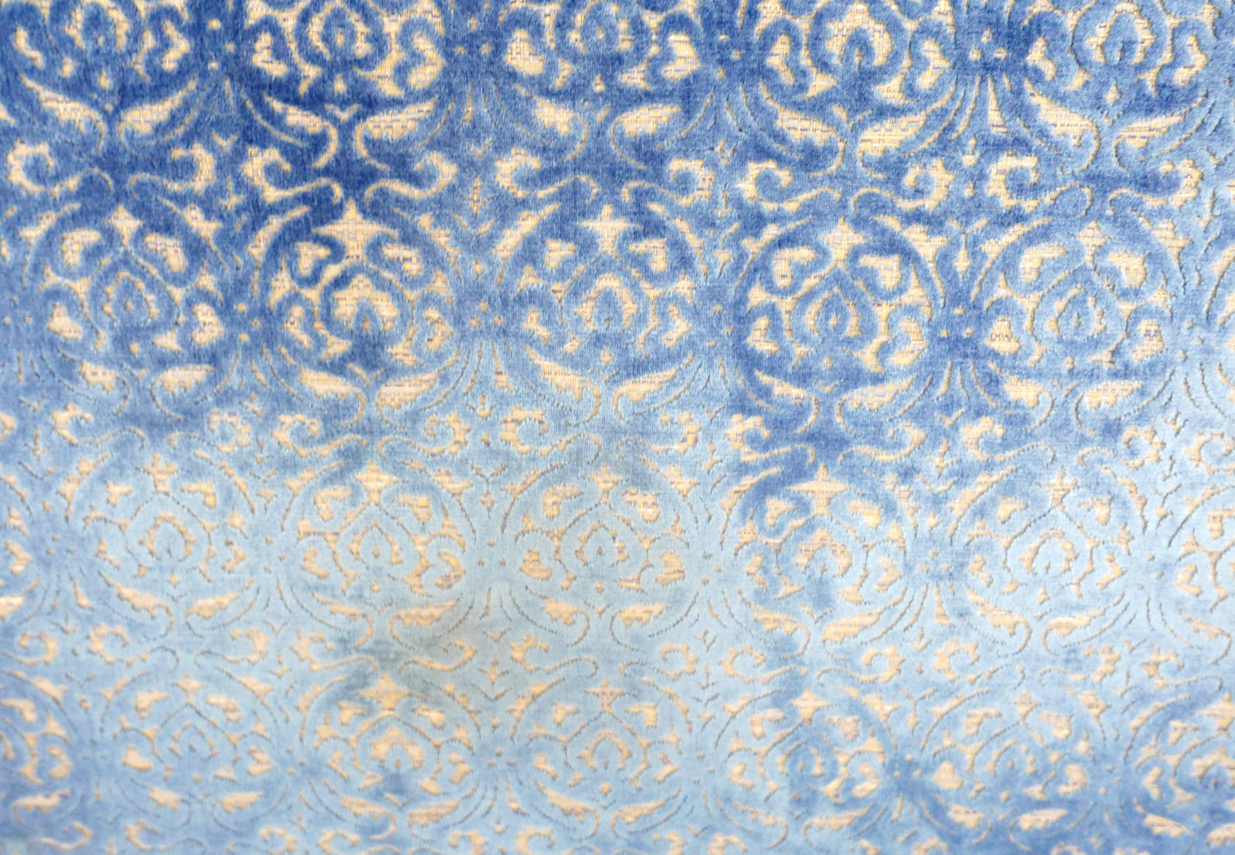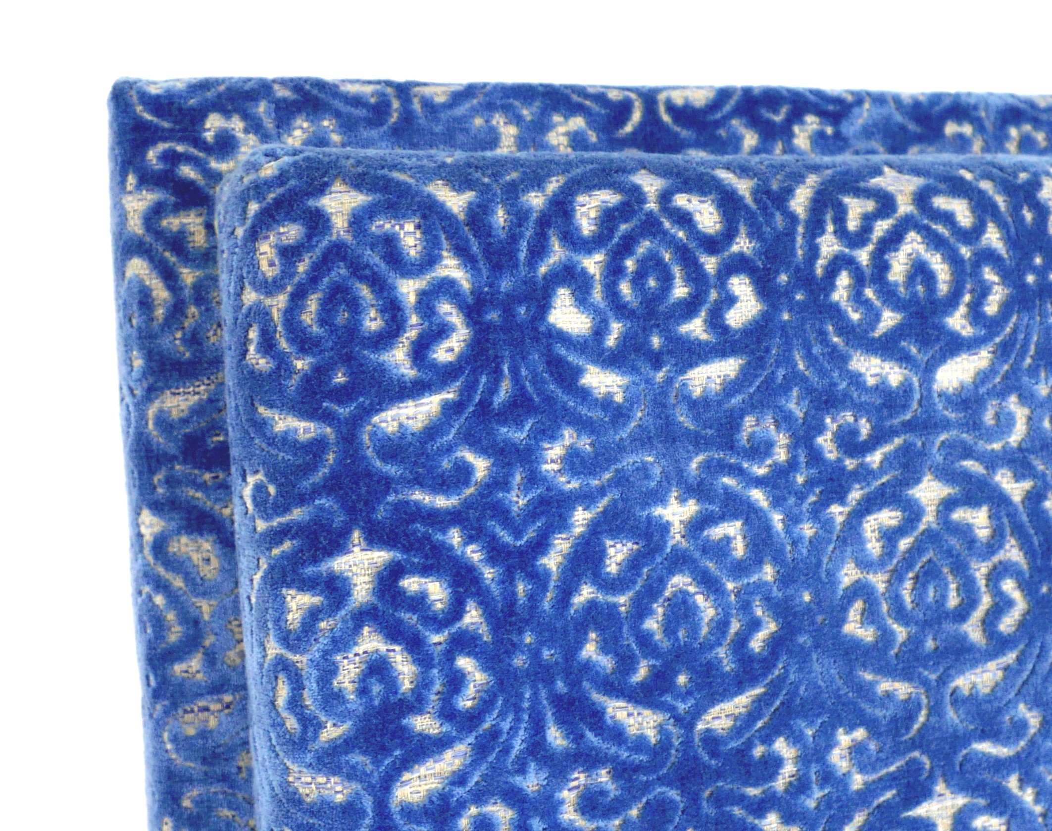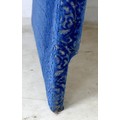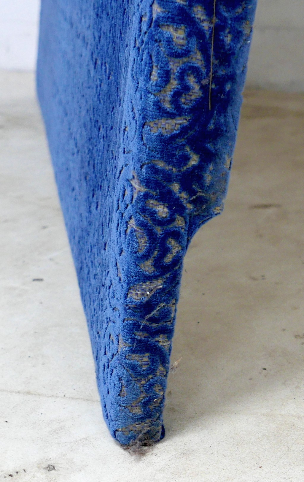An oversized double headboard, upholstered in blue jacquard fabric, with conforming wooden baton (French cleat) fitting, 147 by 33 by 180cm high.