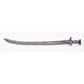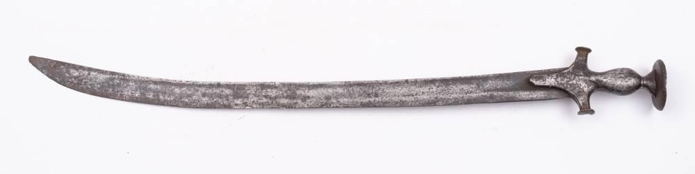 A 19th century steel talwar: with 62cm curved single edged blade, steel cross guard and grip with dished pommel.
