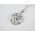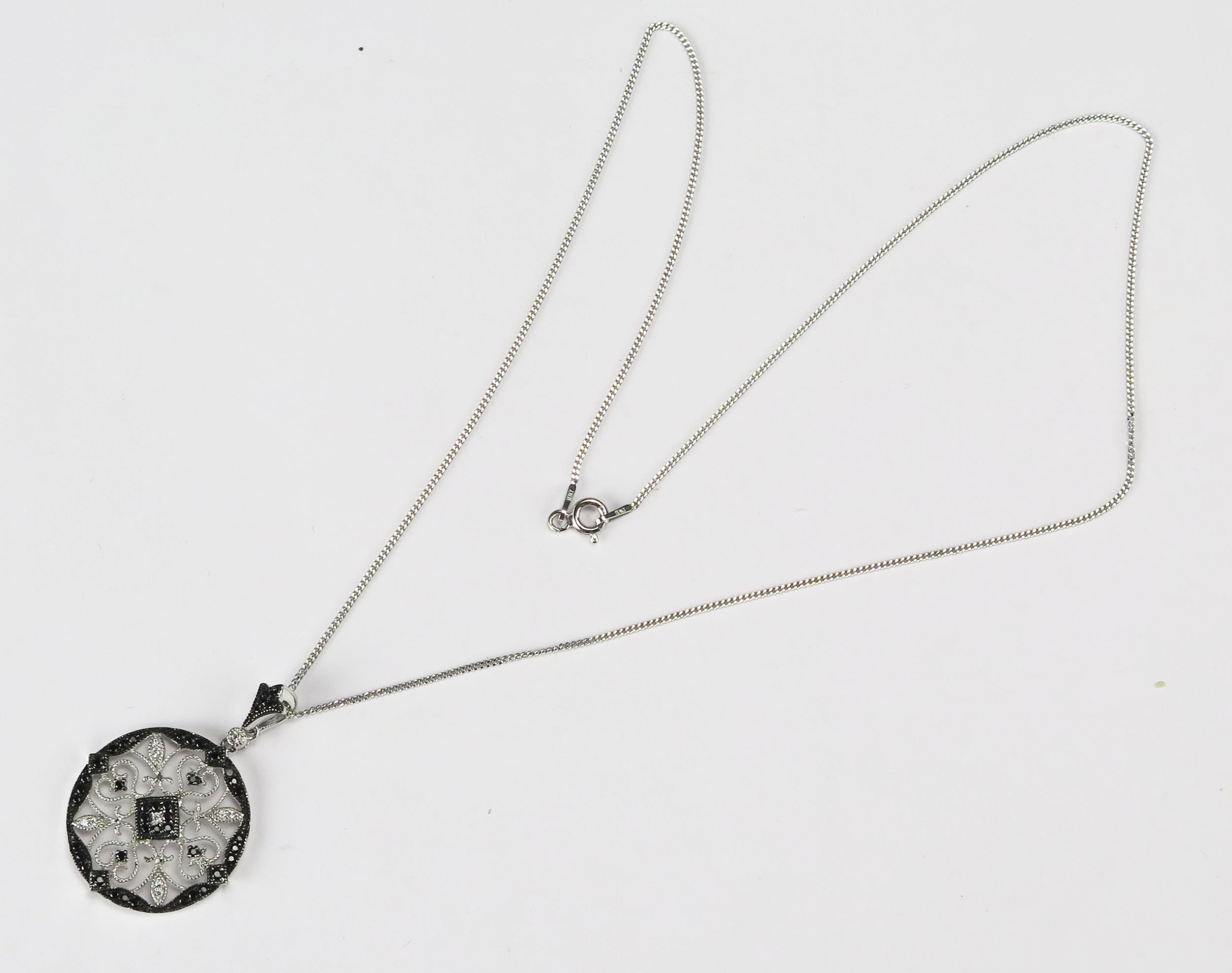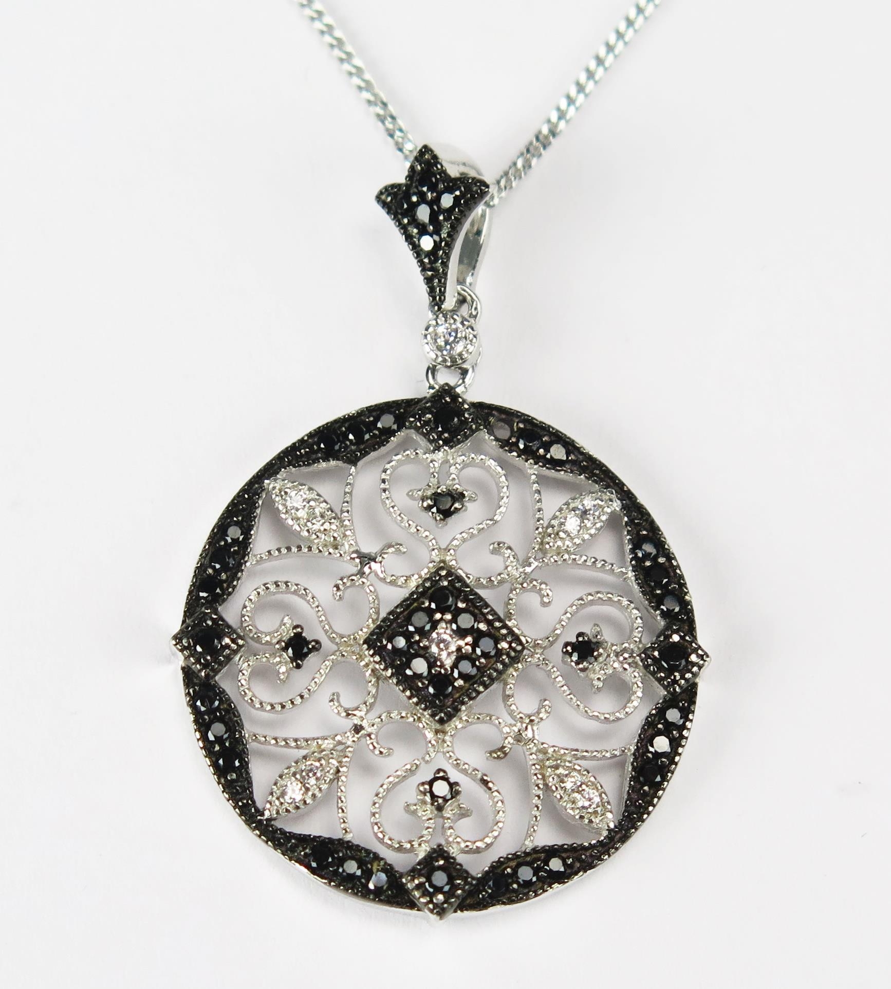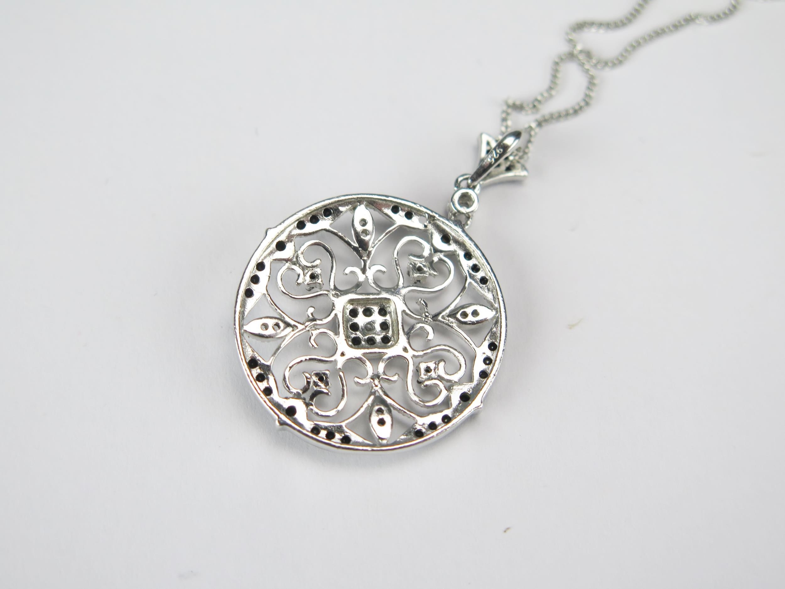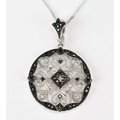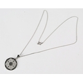 A Round Silver Pendant set with black and white cubic zirconia on a silver chain