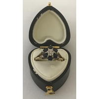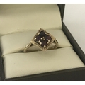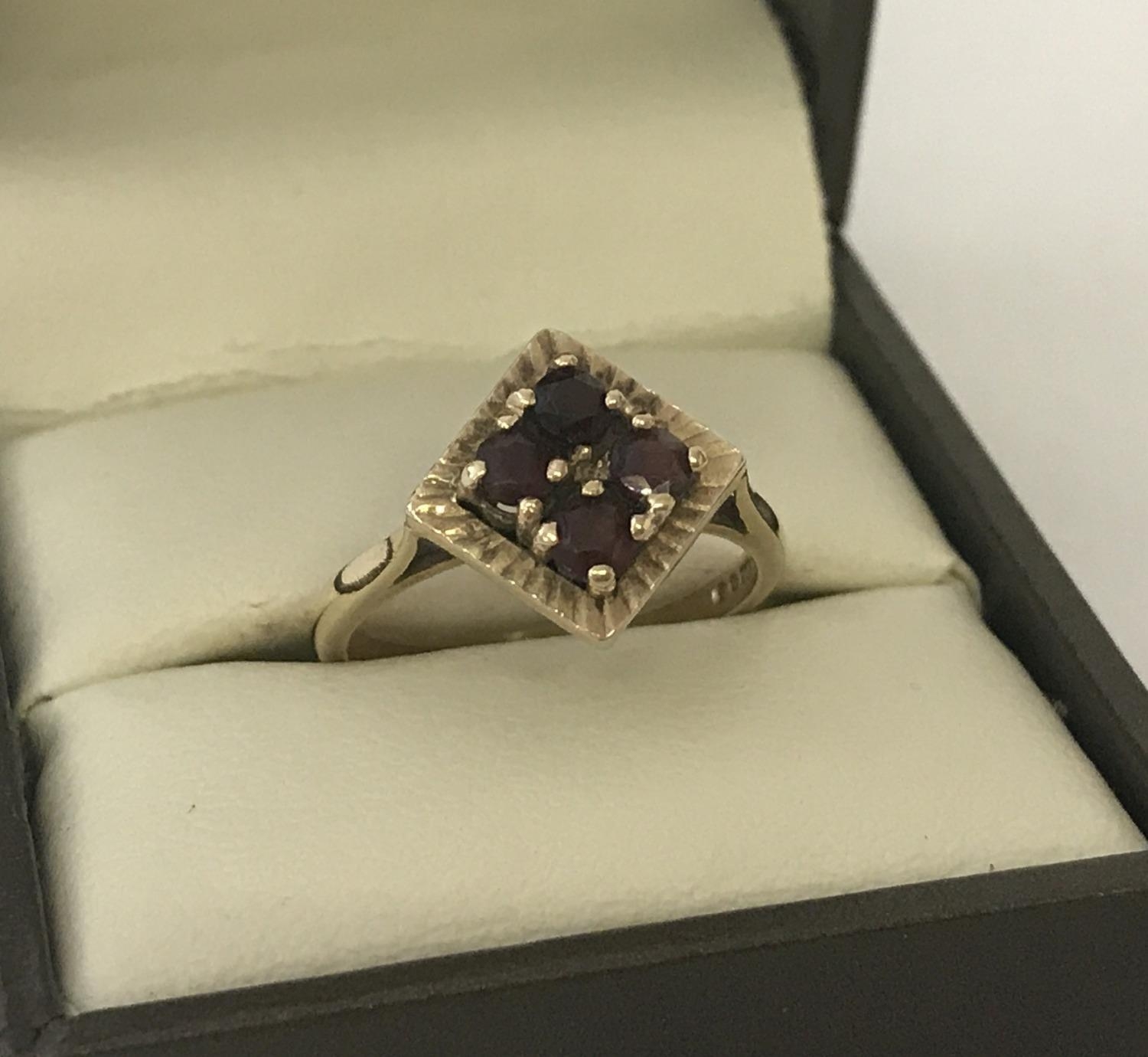 A 9ct gold vintage style, garnet set dress ring. Diamond shaped mount set with 4 round cut garnets. Hallmarks to inside of band. Size L½. Total weight approx. 2.7g