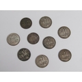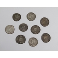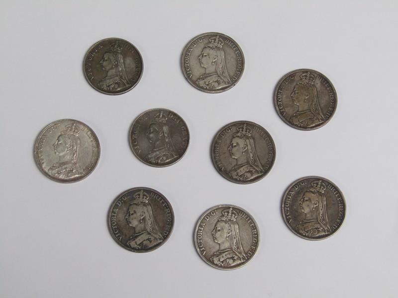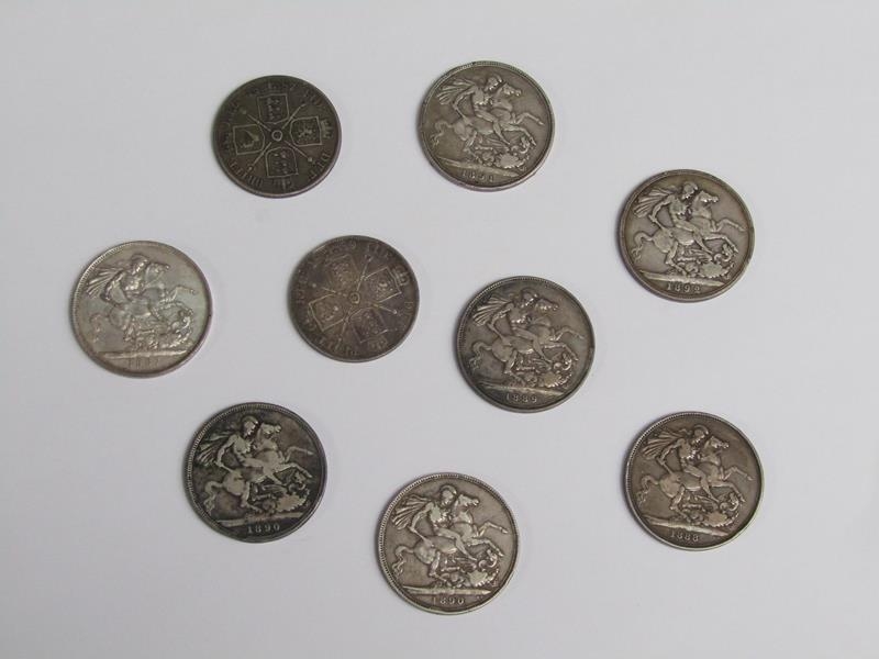 Nine Victorian silver crowns - two 1887, 1888, 1891, three 1890, 1892 and one 1889, used.
